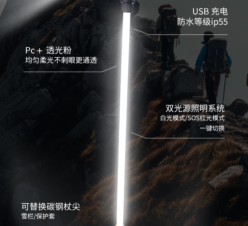 발광 등산 지팡이, 조명 지팡이, 휴대용 조명 캠핑 지팡이, 야외 하이킹 야간 등산 지팡이, 최고의 공장 직판 상품