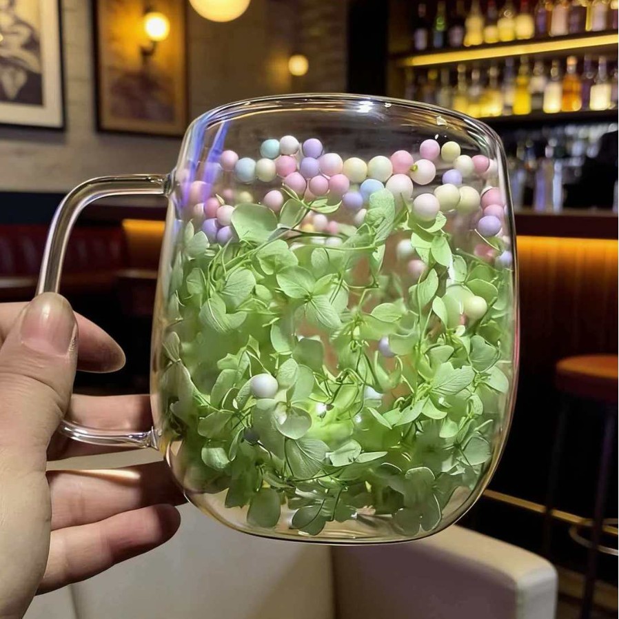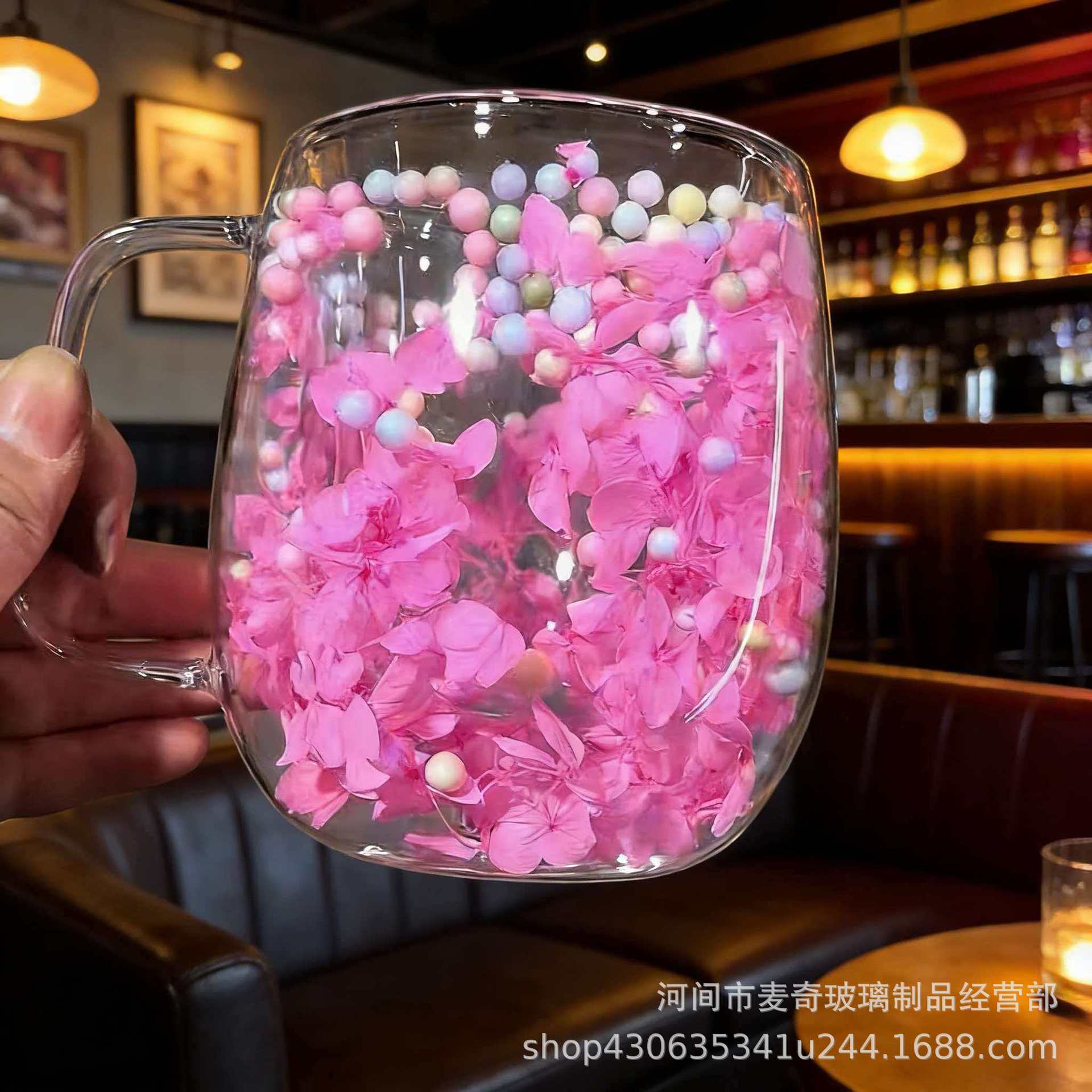 국경 간 도매 이중층 리얼 플라워 유리컵 ins 스타일 기념품 주스컵 가정용 고급 꽃잎 모래시계컵