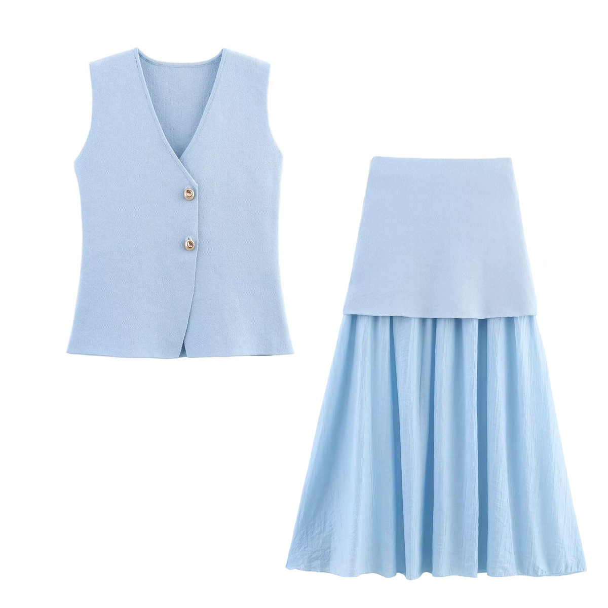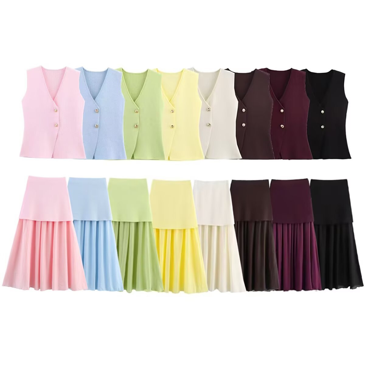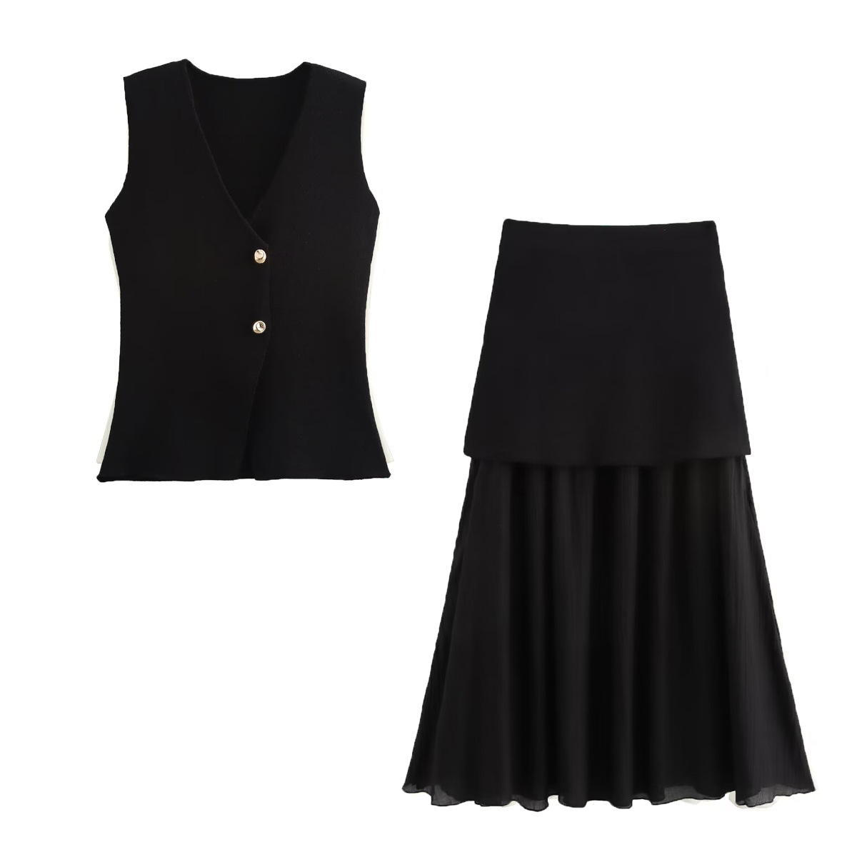 유럽과 미국의 국경 여자 2025 년 여름 새로운 V 넥 골든 버튼 니트 조끼 주름 치마 세트