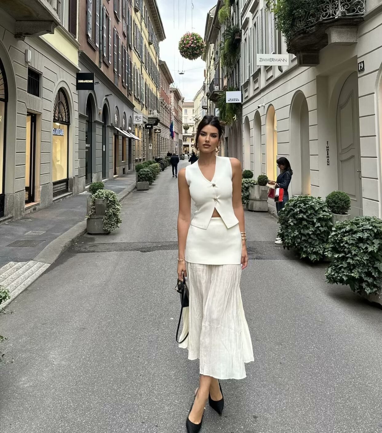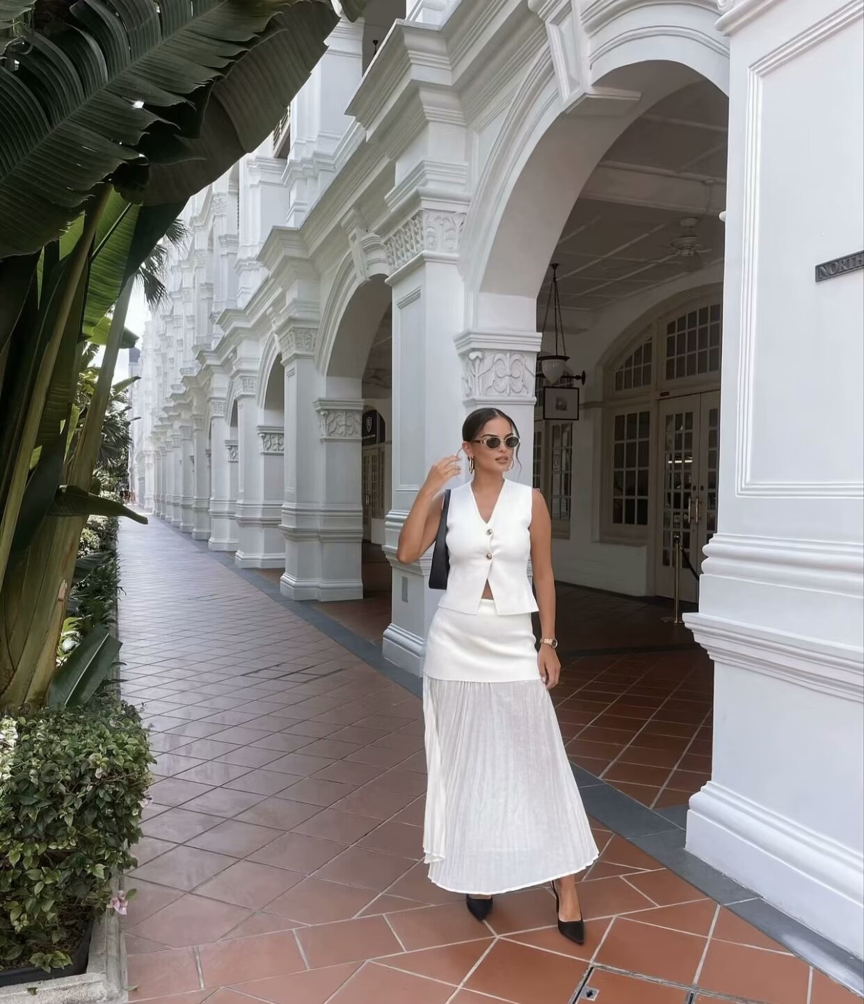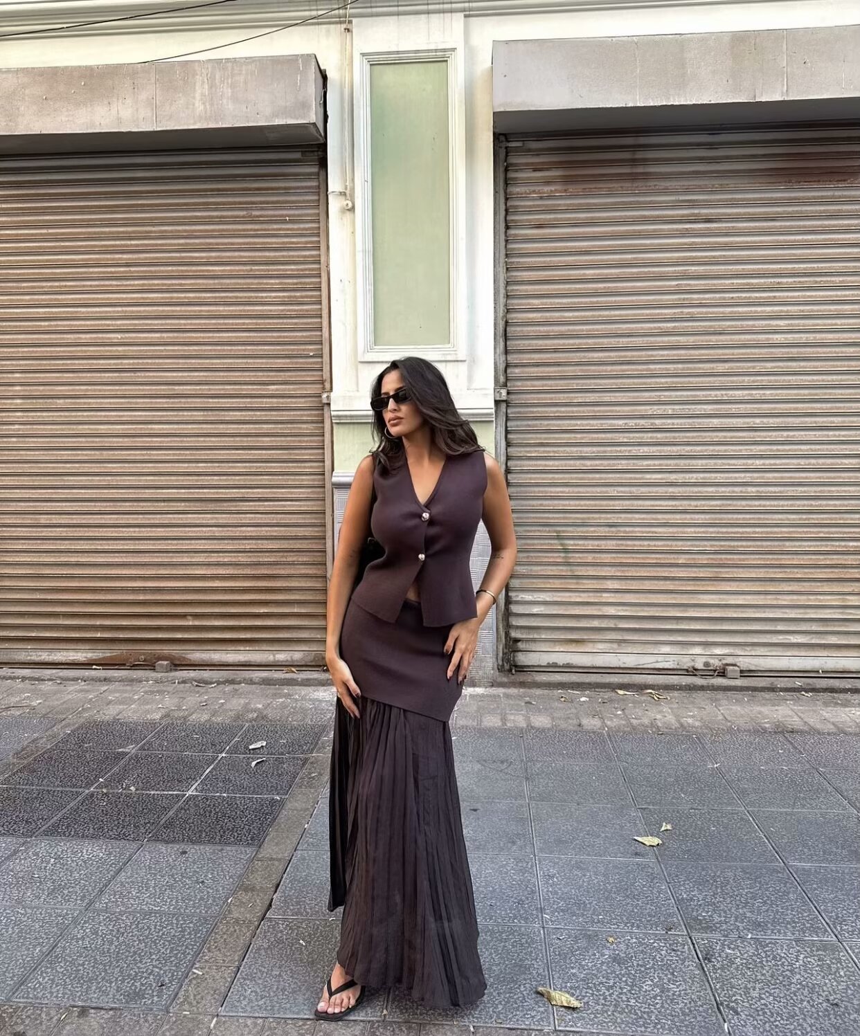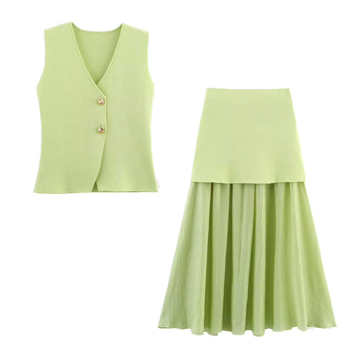 유럽과 미국의 국경 여자 2025 년 여름 새로운 V 넥 골든 버튼 니트 조끼 주름 치마 세트