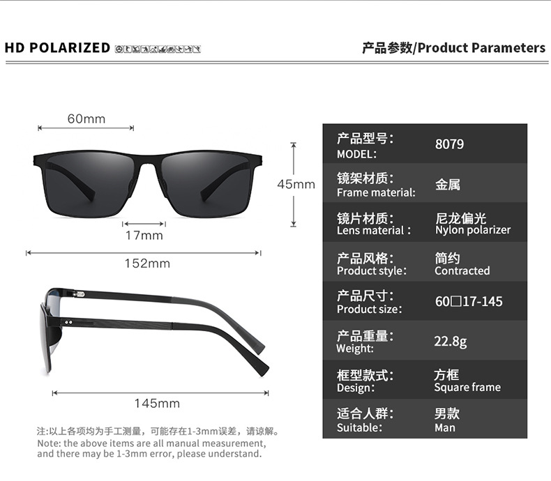 8079 나일론 편광 선글라스 남성 금속 프레임 유행 광장 선글라스 패션 운전 선글라스
