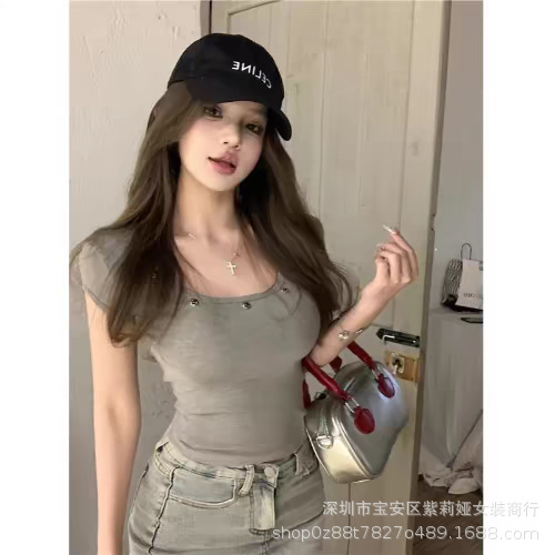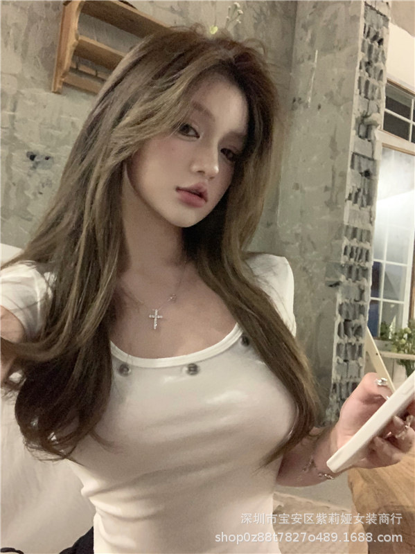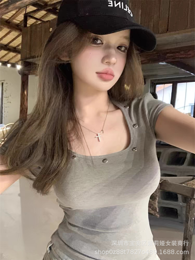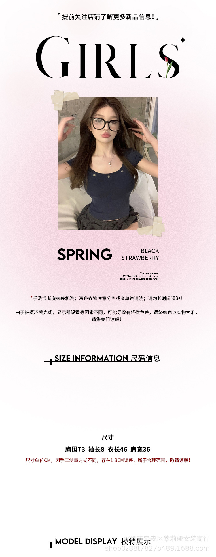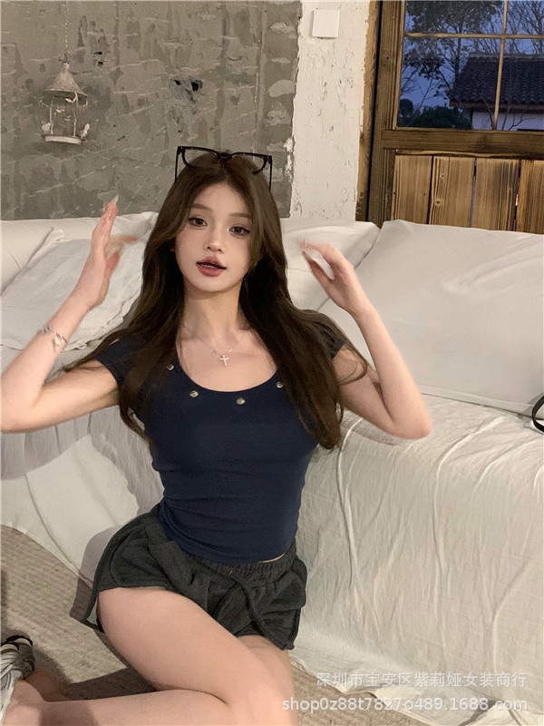 [모달 260g] 버튼 장식 U넥 반팔 티셔츠 여성 여름 디자인 핫걸 타이트핏 숏 스타일