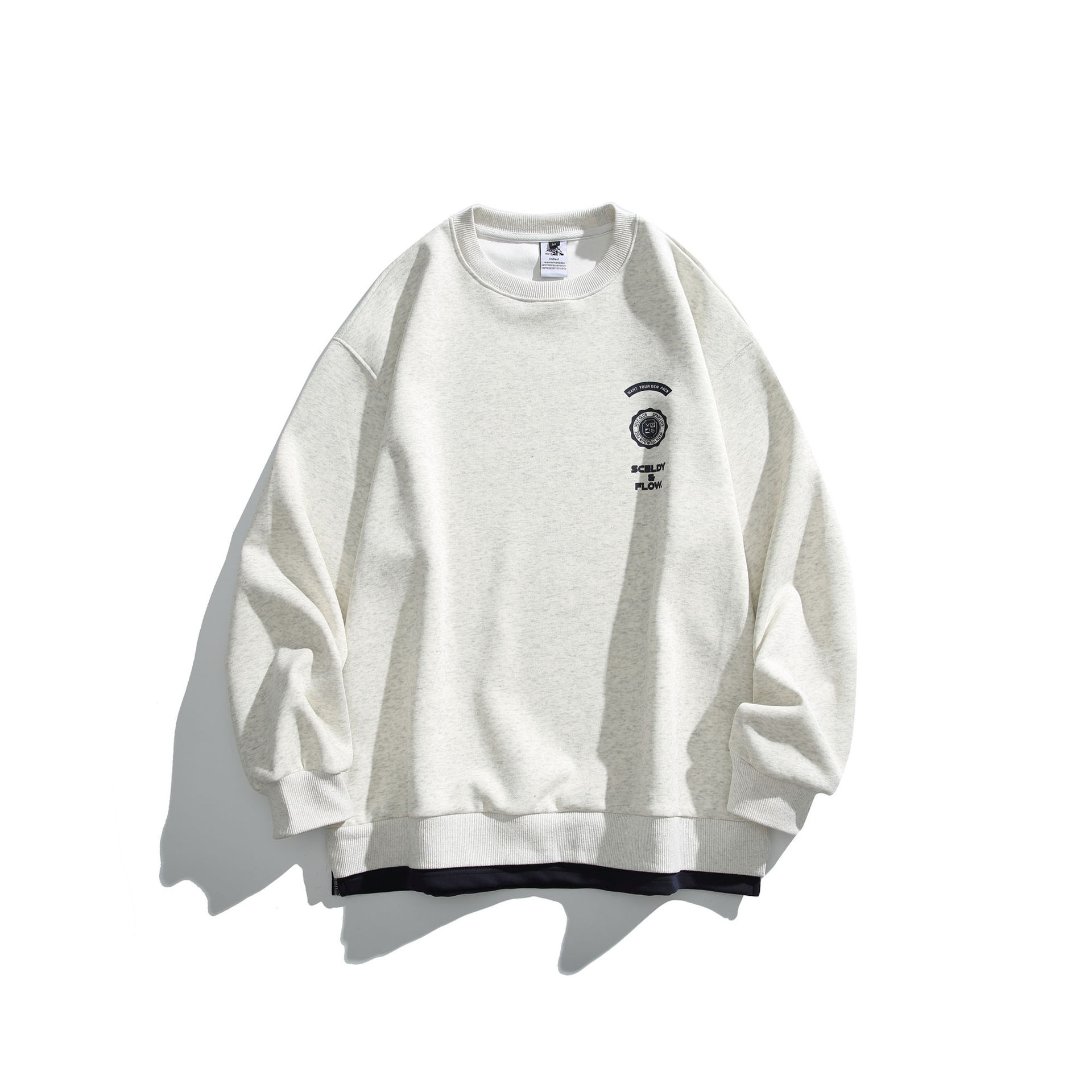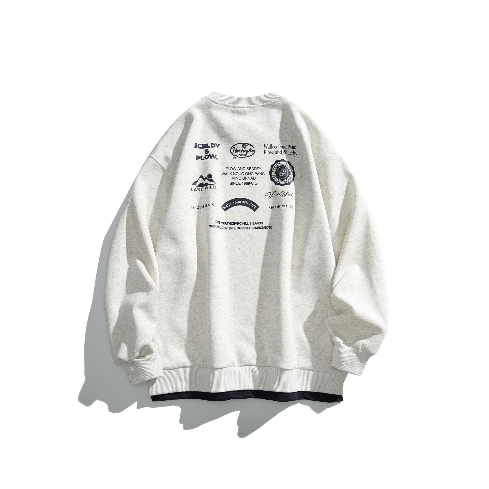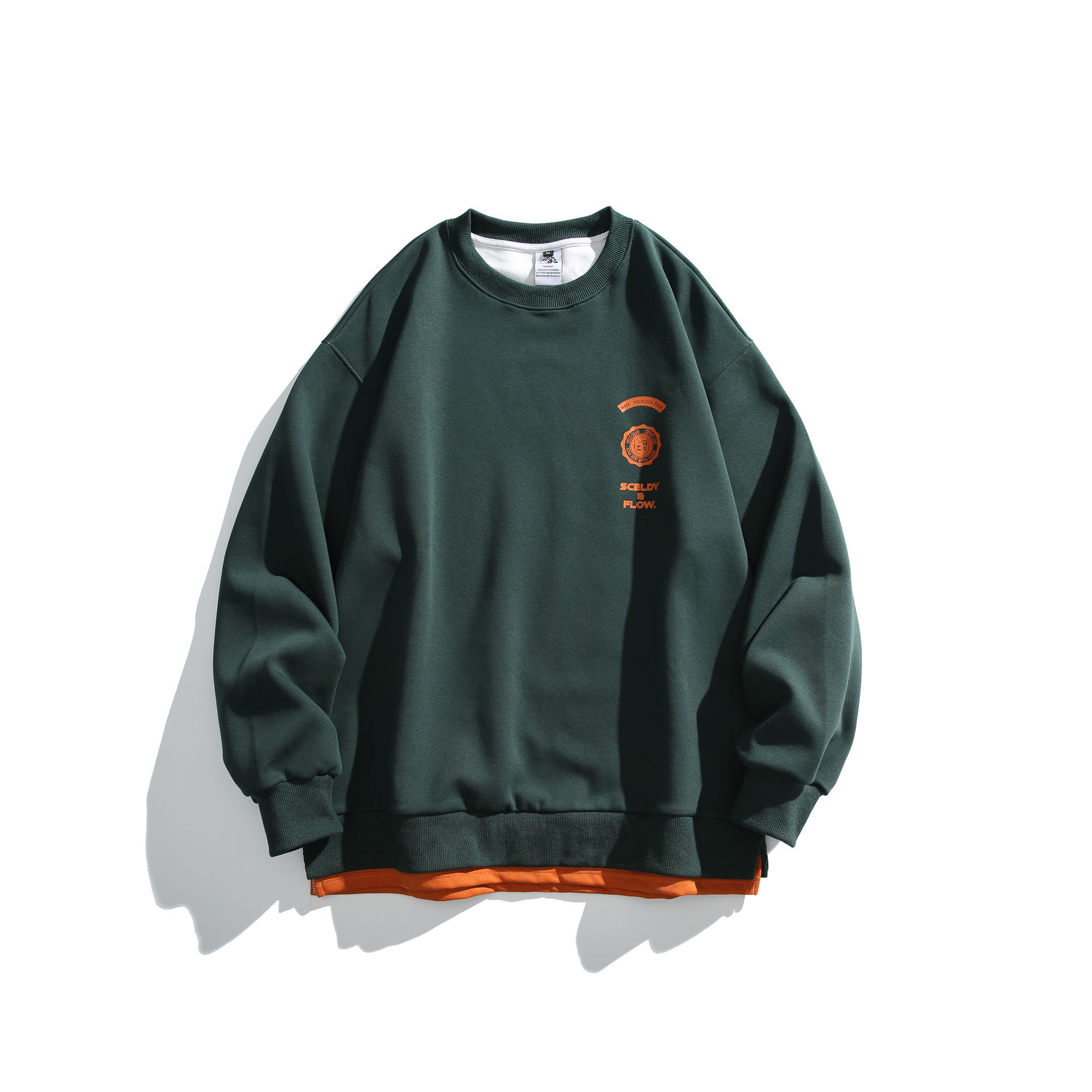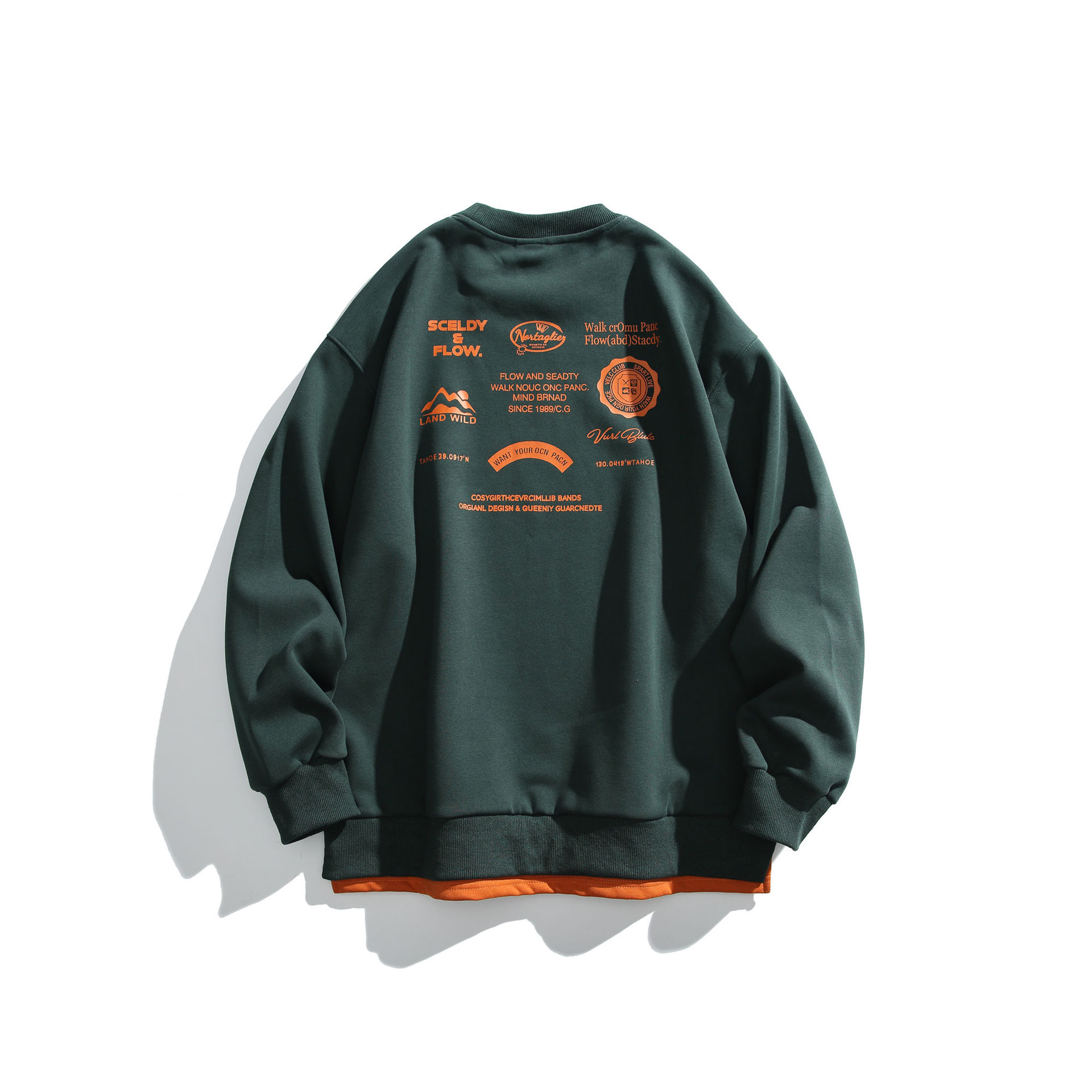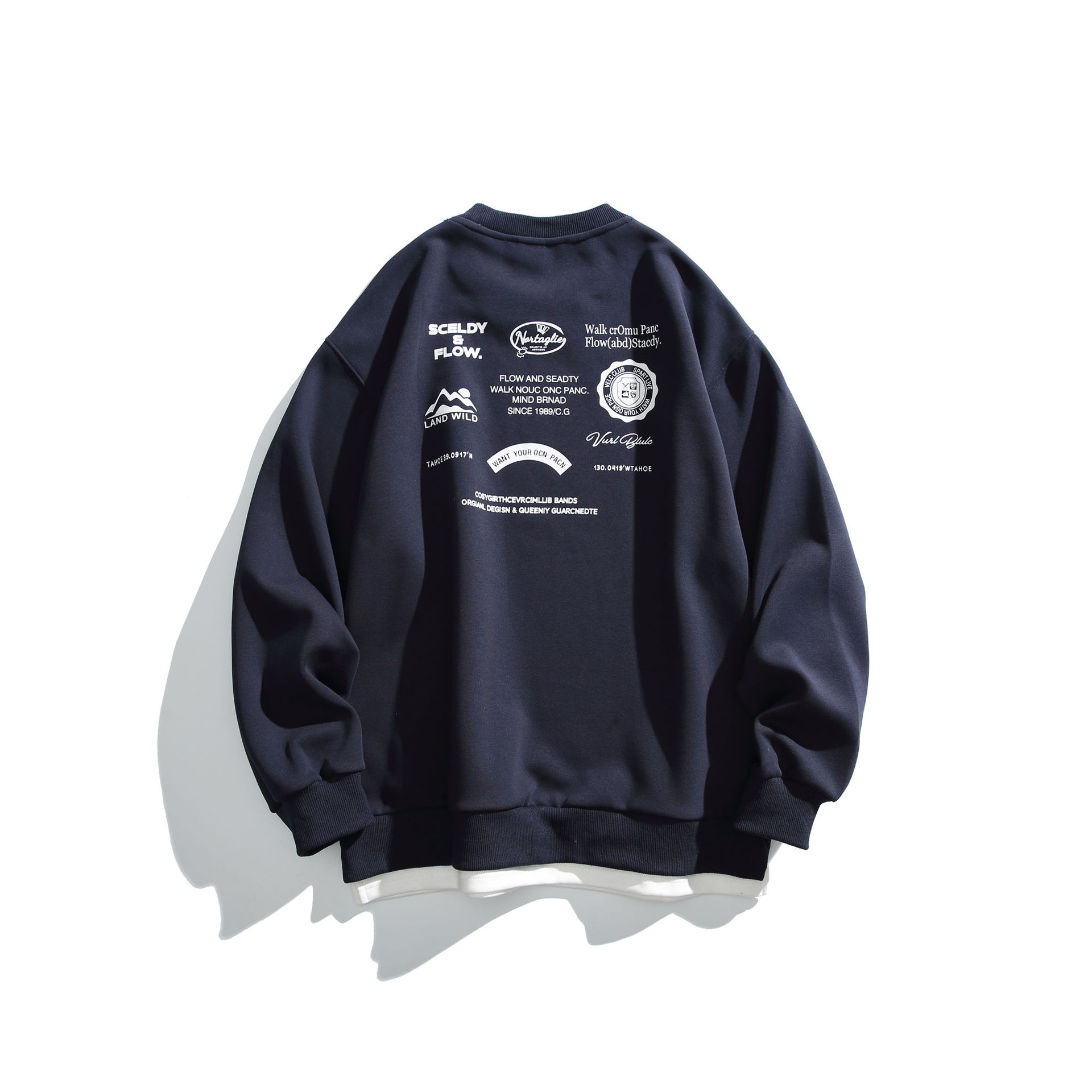 가을 2024 새로운 미국식 프린트 스웨트 셔츠 남성 가짜 투피스 캐주얼 루즈 라운드 넥 코트 커플의 캐주얼 웨어