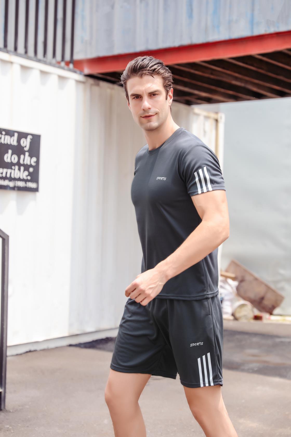 스포츠 세트 남성 여름 캐주얼 세트 체육관 러닝 의류 느슨한 크루 넥 그룹 인쇄 빠른 건조 티셔츠
