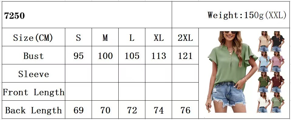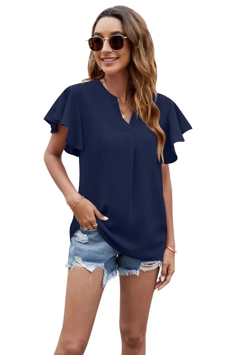 2024 유럽과 미국의 대외 무역 국경 여성 의류 아마존 새로운 쉬폰 셔츠 V 넥 플라잉 슬리브 짧은 소매 단색 탑