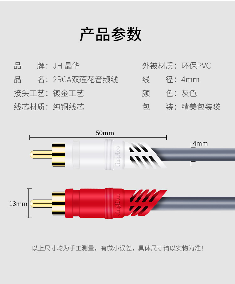 Jinghua 2 대 2 오디오 케이블 이중 연꽃 빨간색과 흰색 플러그 왼쪽 및 오른쪽 채널 2rca TV 오디오 앰프 케이블