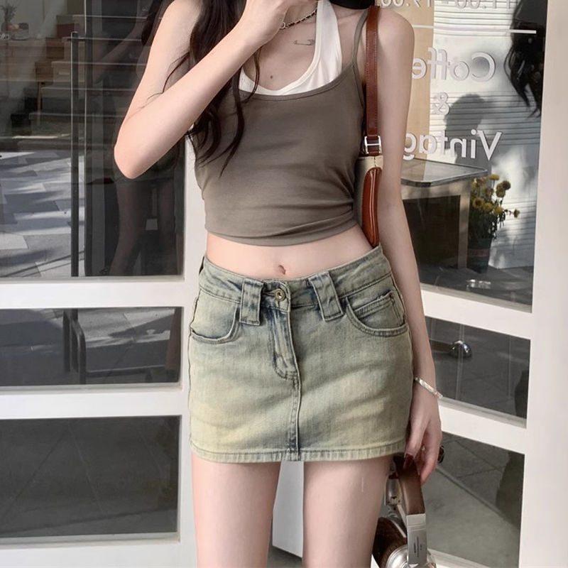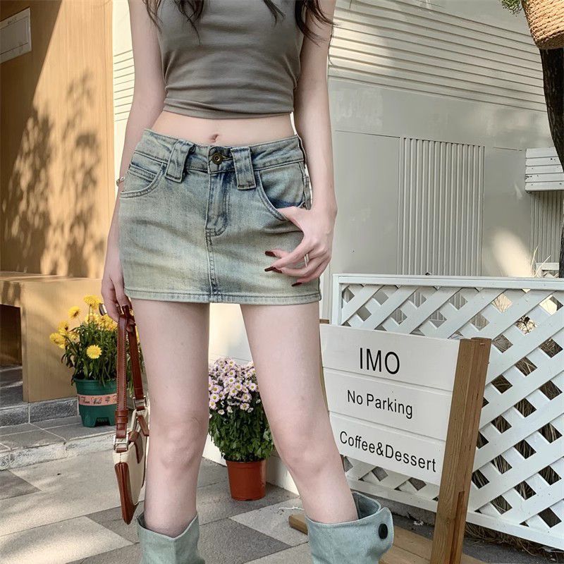 빈티지 세탁 데님 치마 여성 여름 어린 소녀 스파이스 소녀의 짧은 치마 높은 허리 A 라인 스커트 안티 눈부심 컬롯스토어 가기