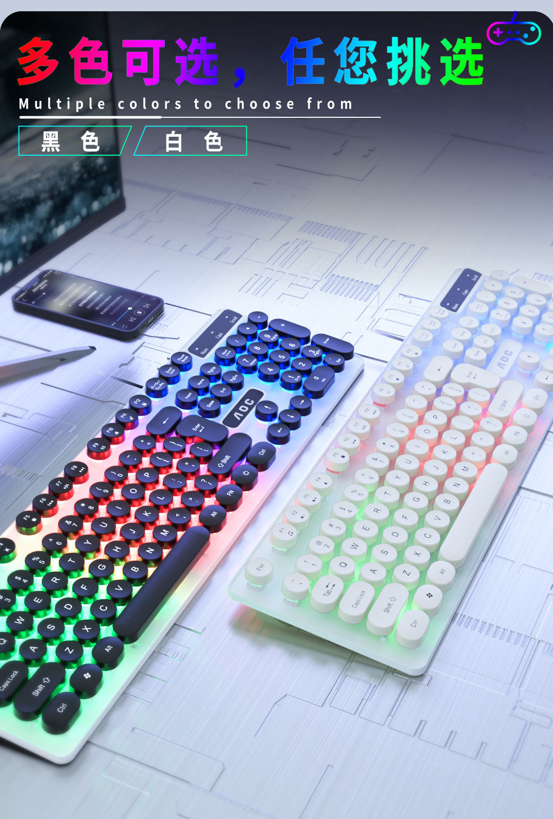 AOC KM100 펑크 라운드 키 캡 유선 발광 게임 키보드 및 마우스 기계적 느낌 키보드 및 마우스 세트 도매스토어 가기