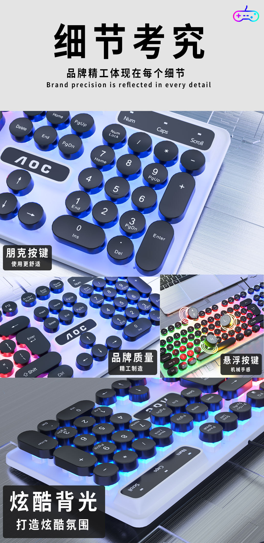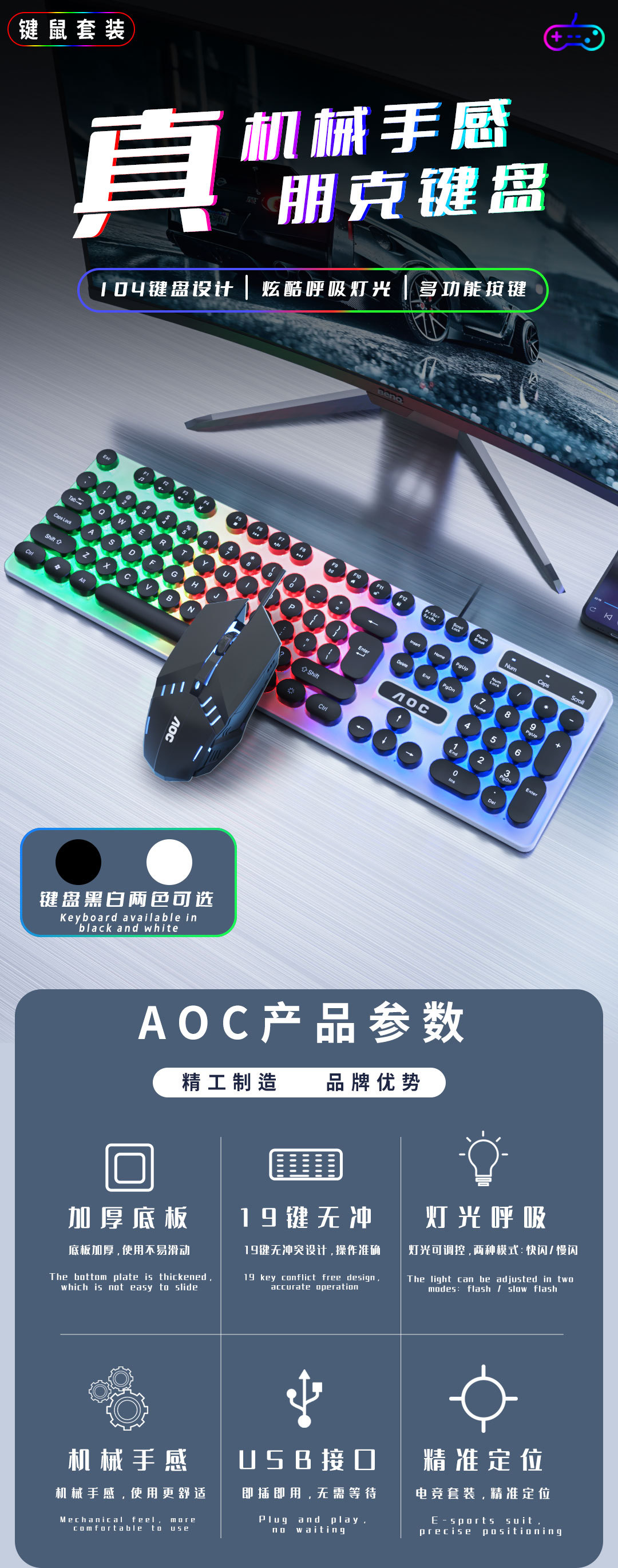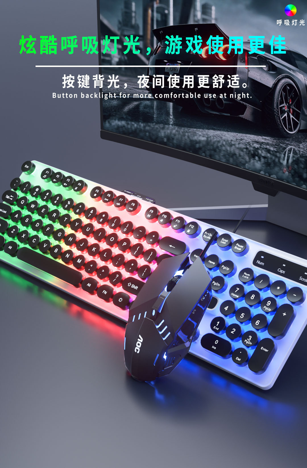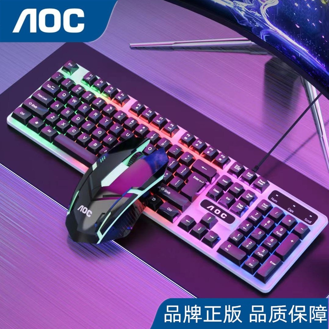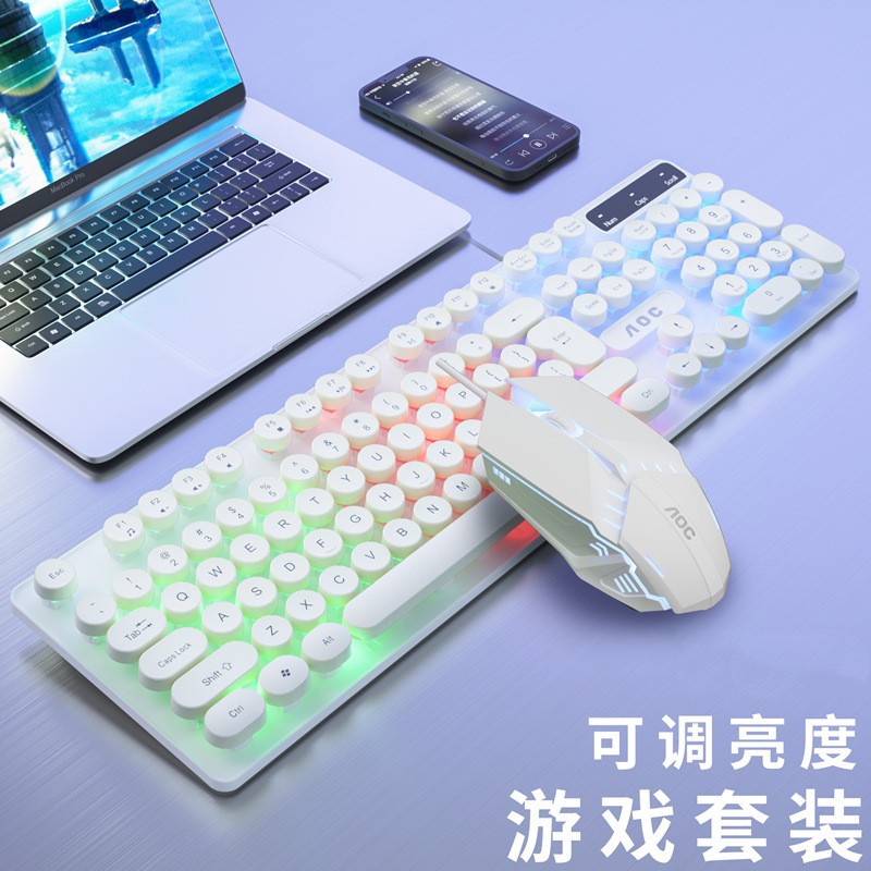 AOC KM100 펑크 라운드 키 캡 유선 발광 게임 키보드 및 마우스 기계적 느낌 키보드 및 마우스 세트 도매
