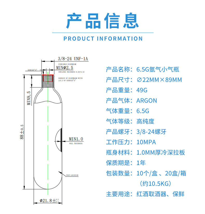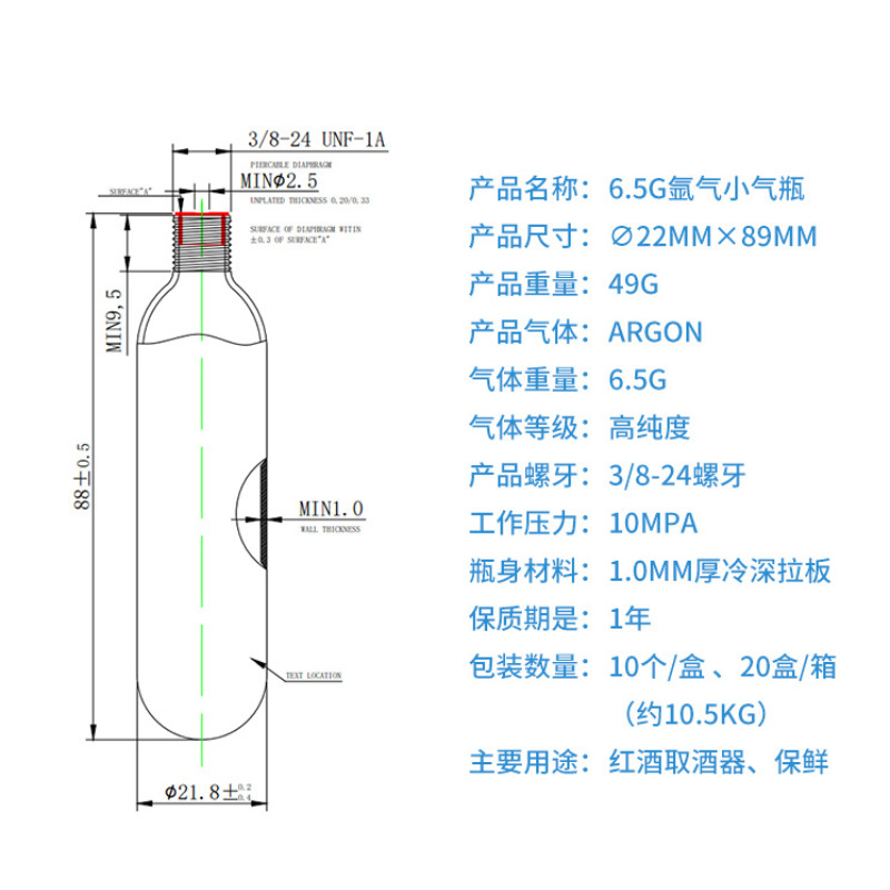• 6.5g 아르곤 가스 실린더 (단일 팩, 10 PCs/상자)