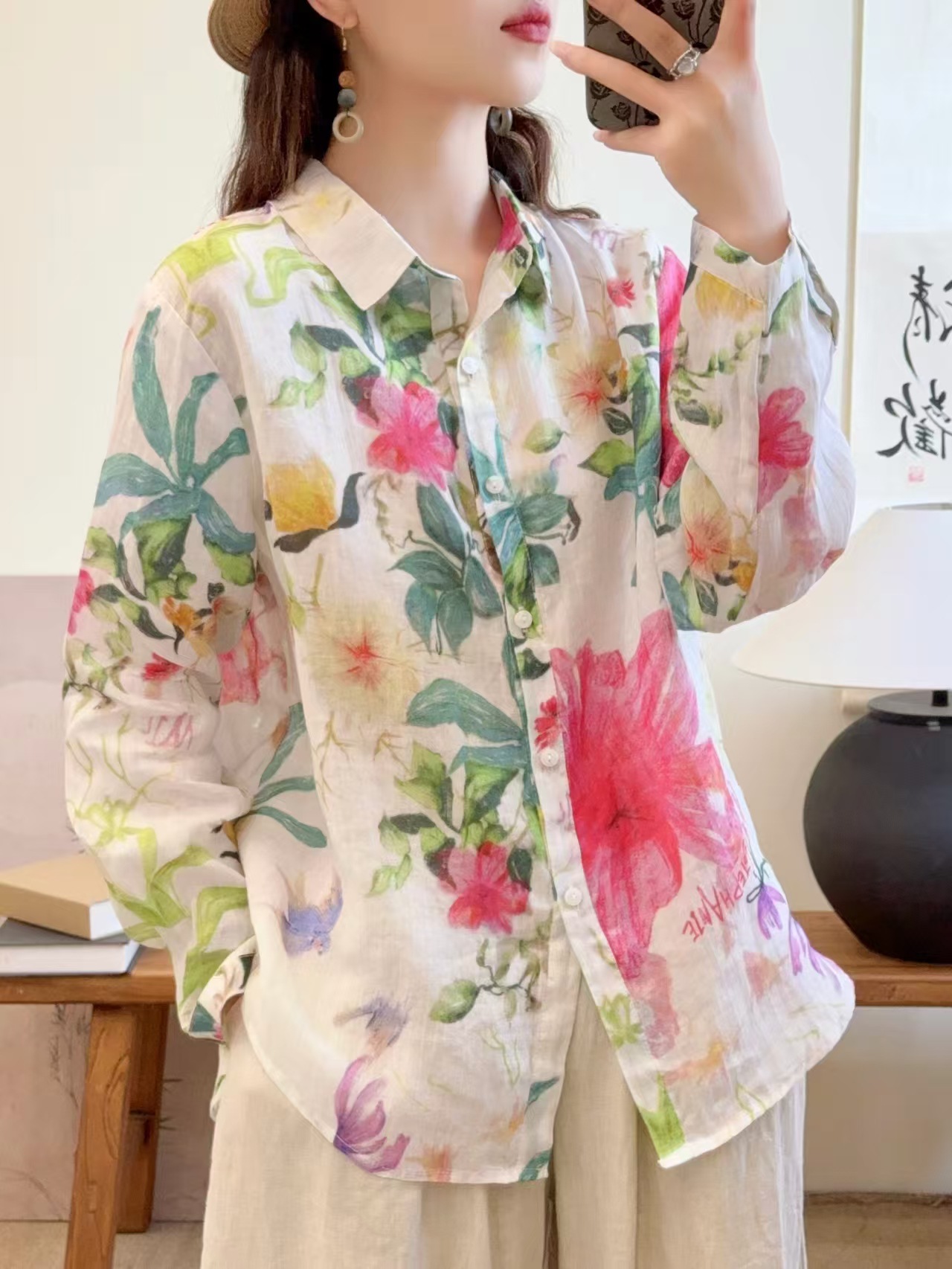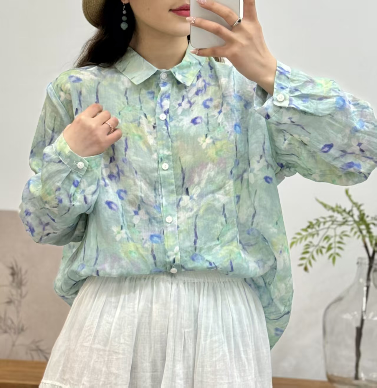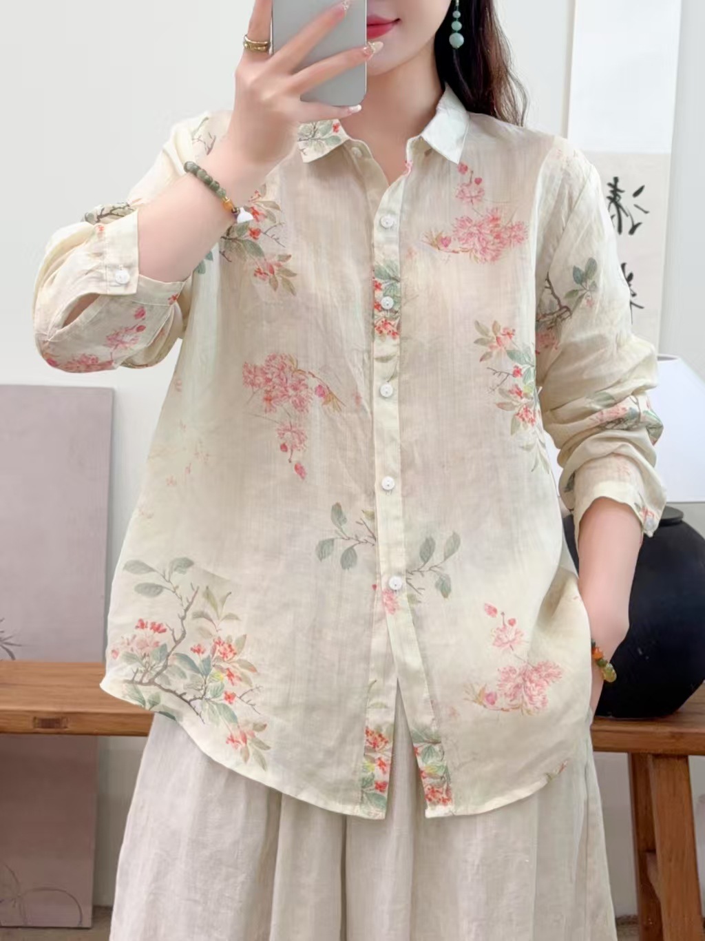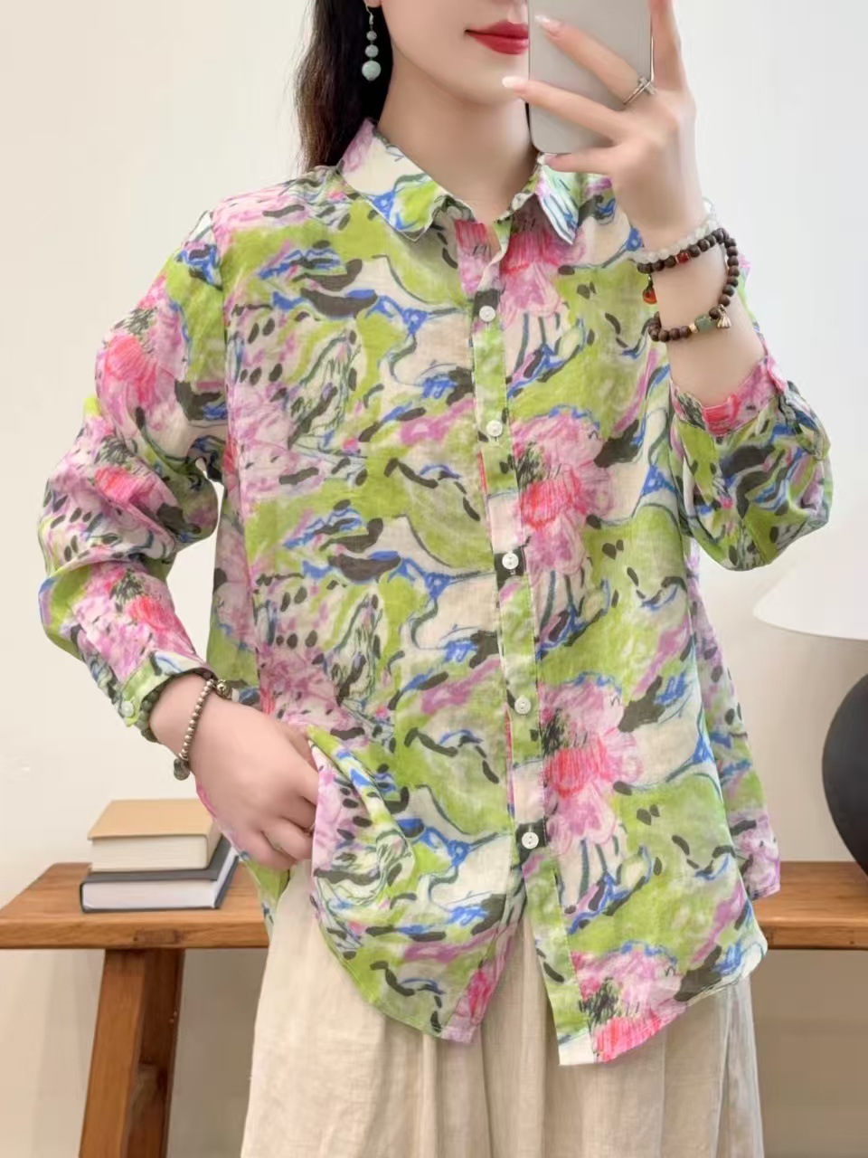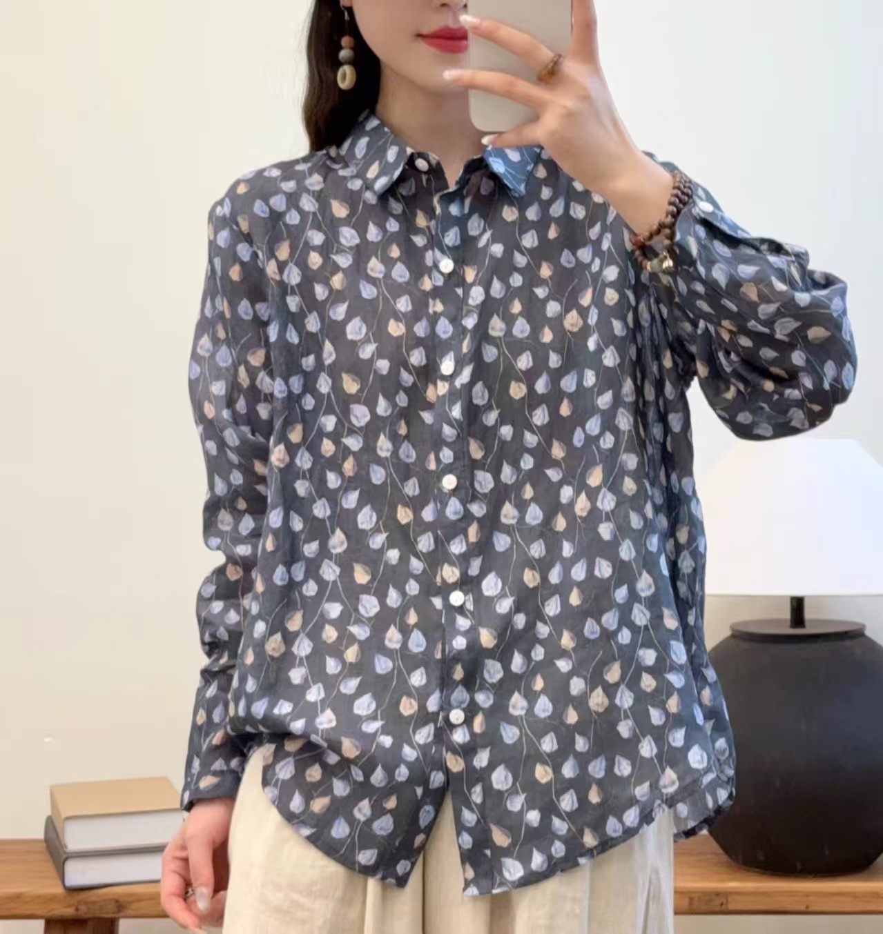 디지털 인쇄 순수 라미 셔츠 느슨한 긴 소매 봄 및 가을 새로운 레트로 예술적 캐주얼 올 매치 싱글 브레스트 셔츠