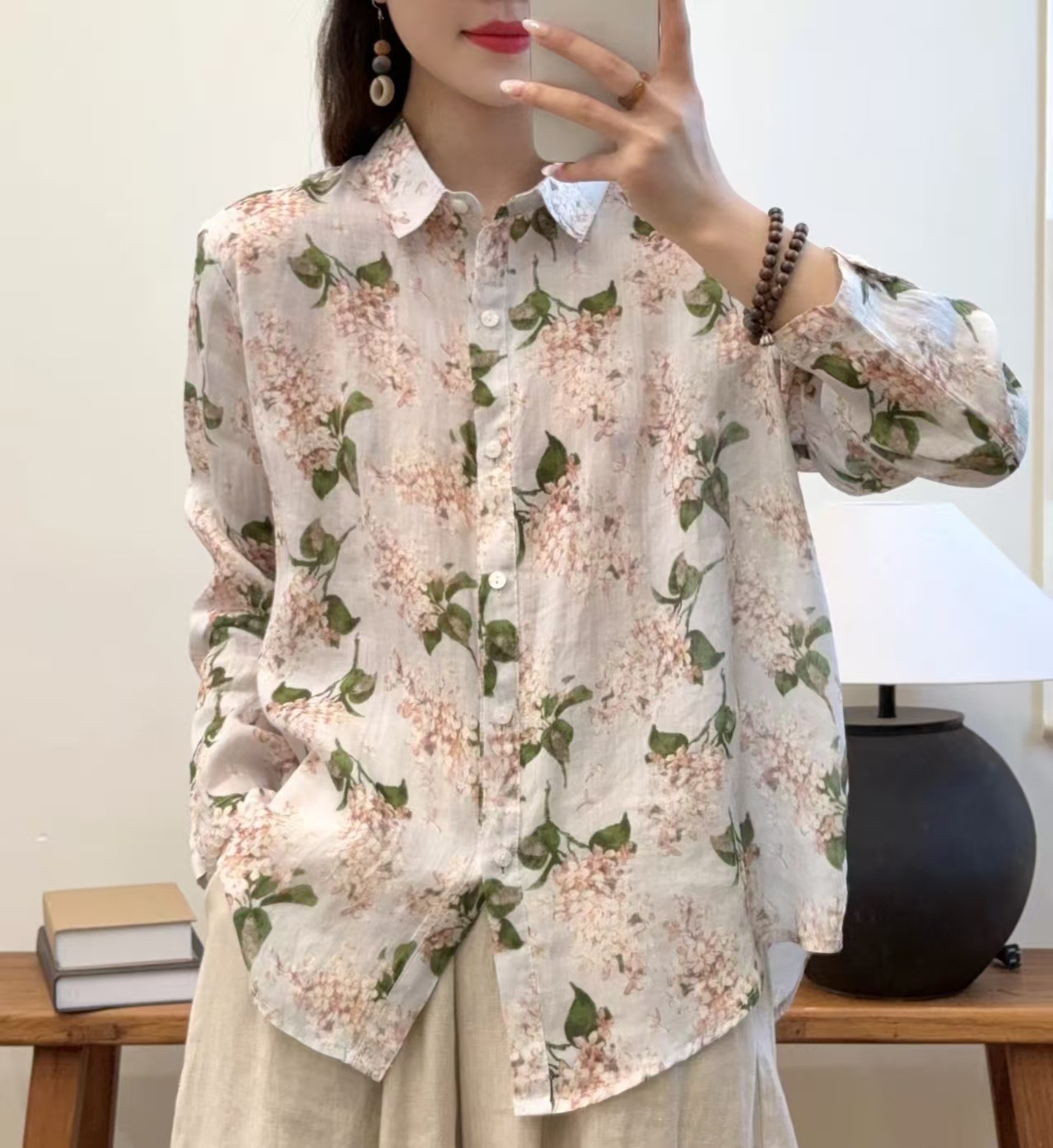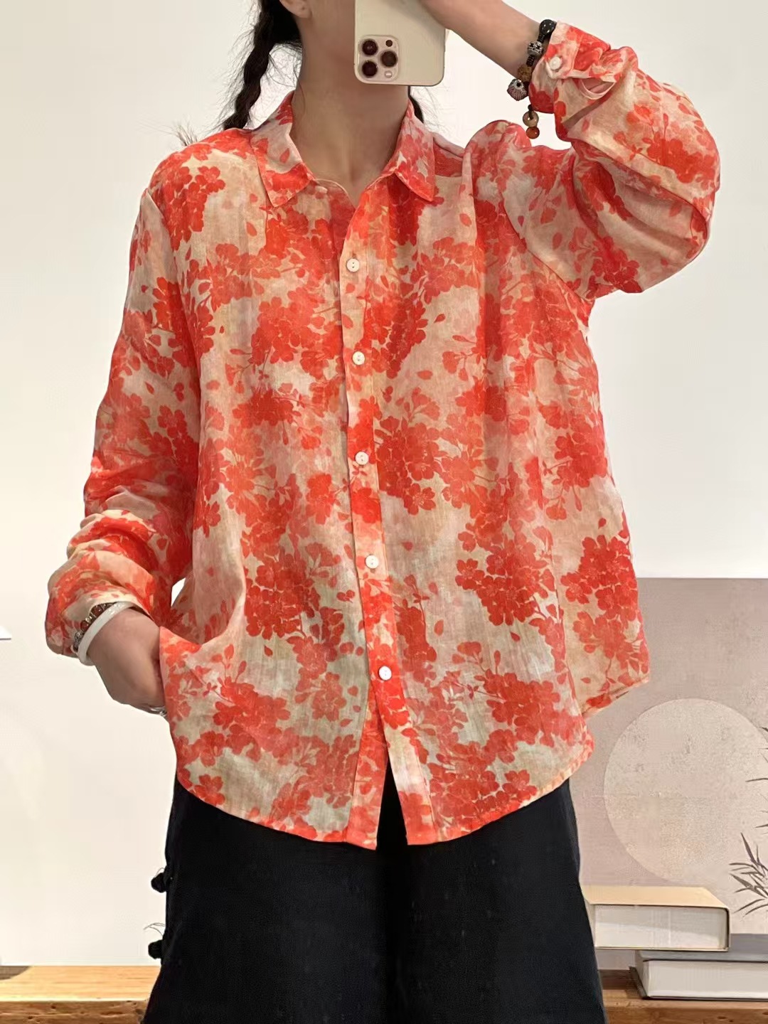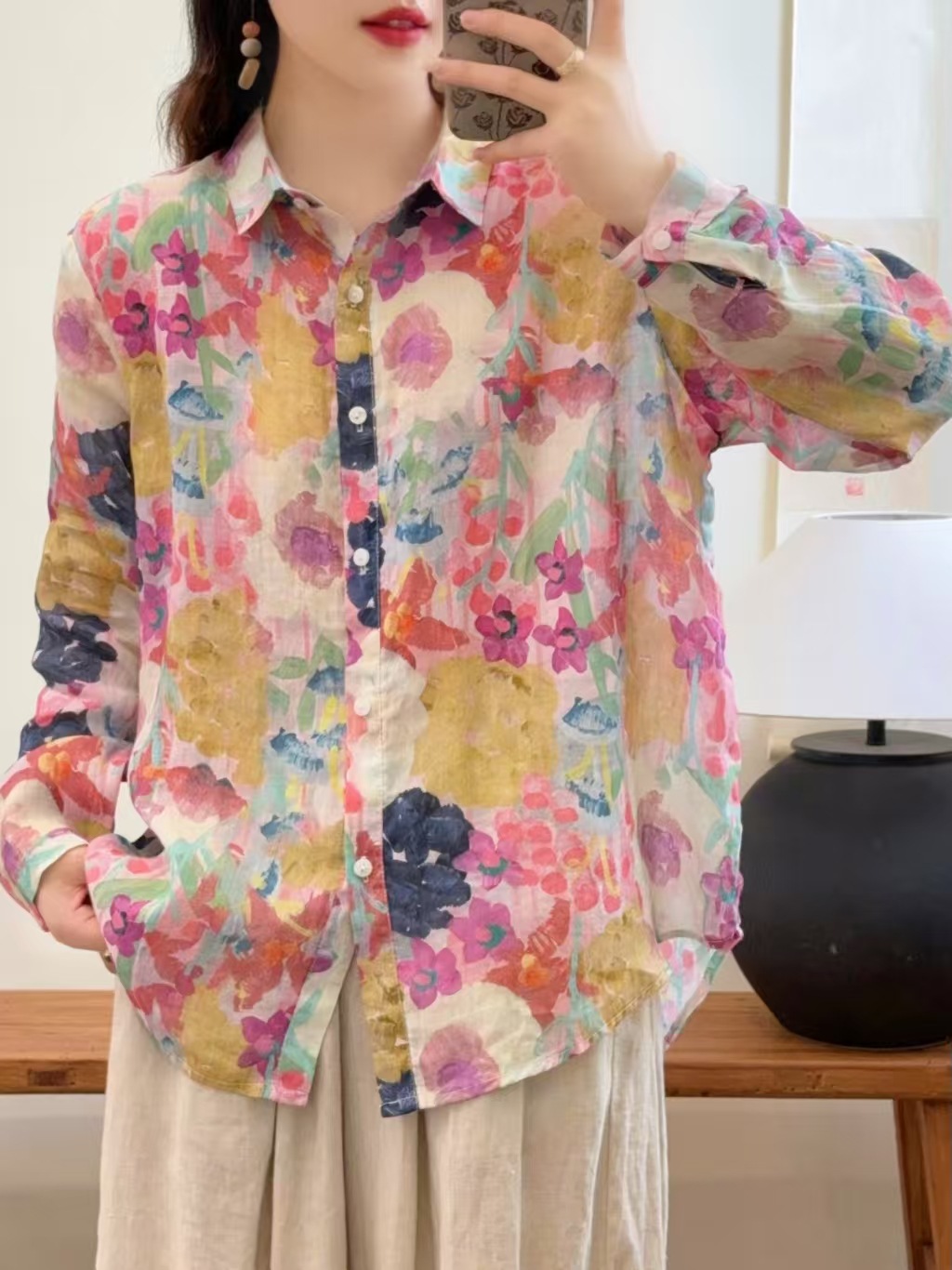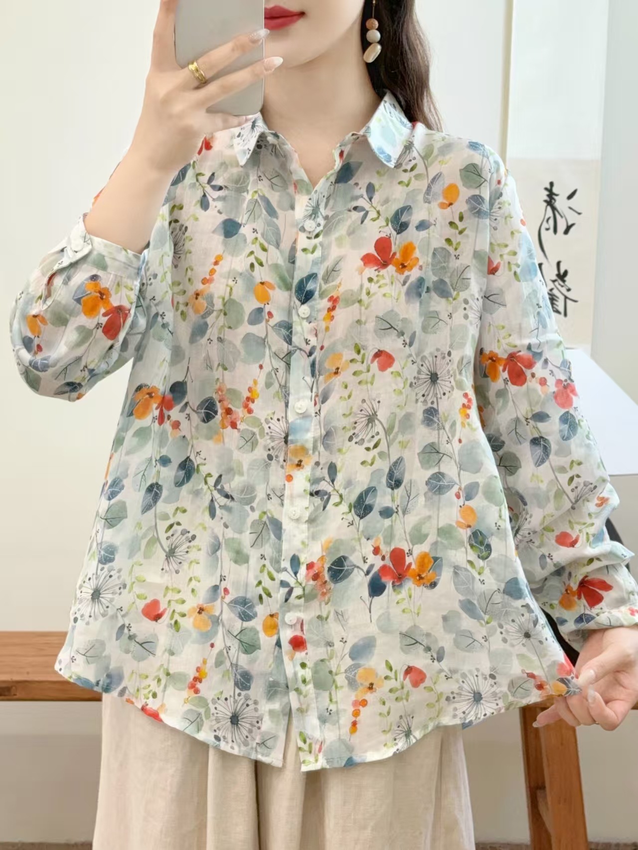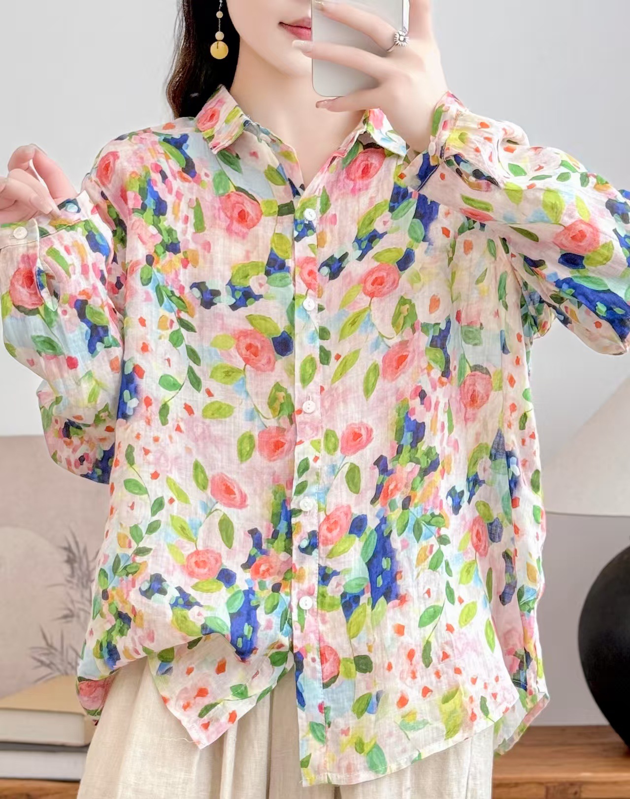 디지털 인쇄 순수 라미 셔츠 느슨한 긴 소매 봄 및 가을 새로운 레트로 예술적 캐주얼 올 매치 싱글 브레스트 셔츠