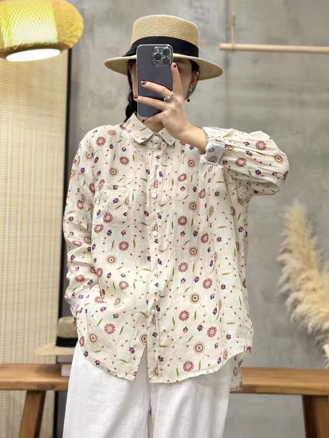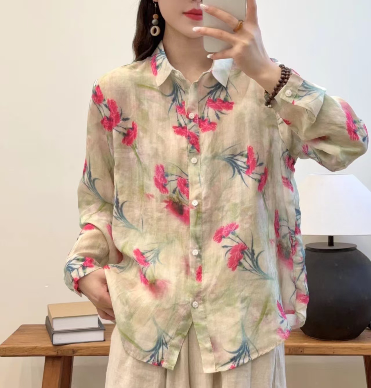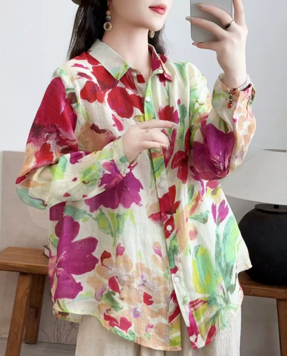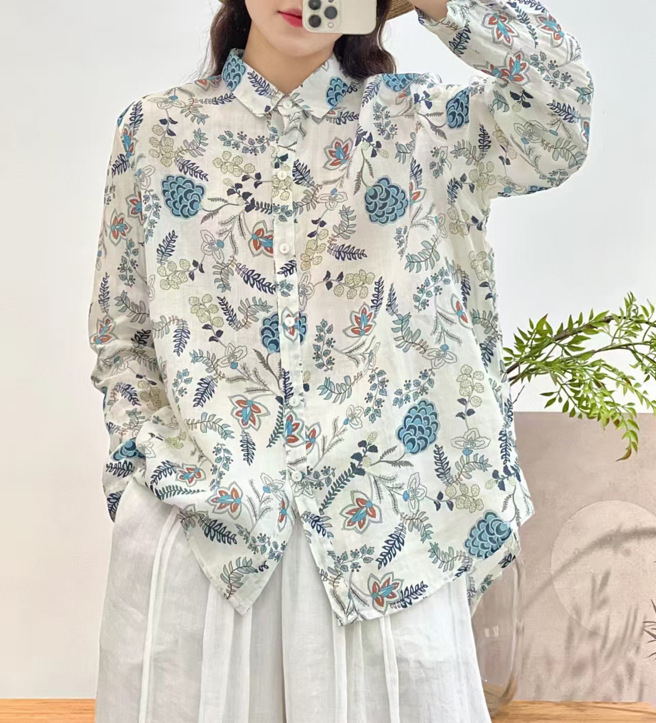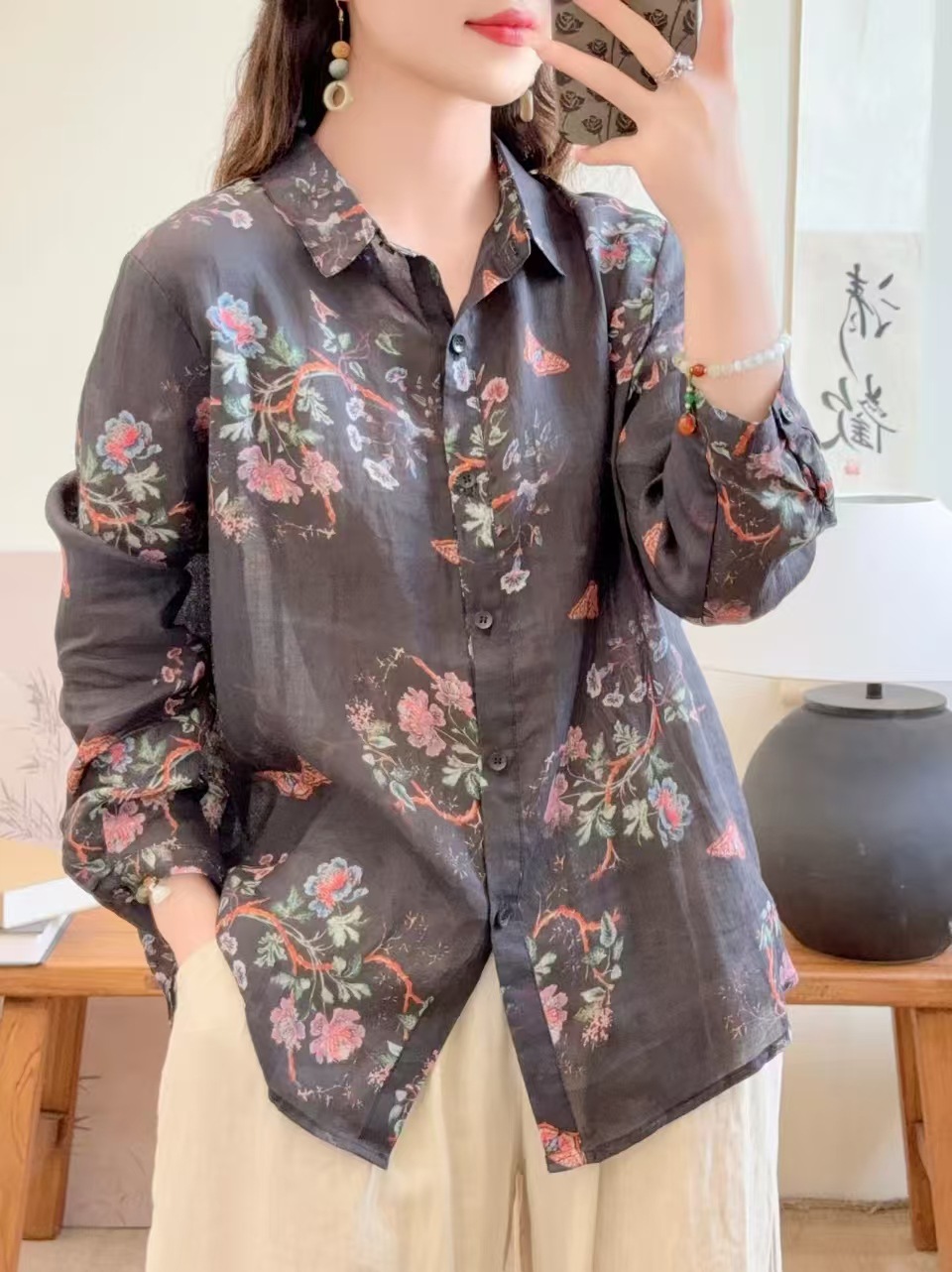 디지털 인쇄 순수 라미 셔츠 느슨한 긴 소매 봄 및 가을 새로운 레트로 예술적 캐주얼 올 매치 싱글 브레스트 셔츠