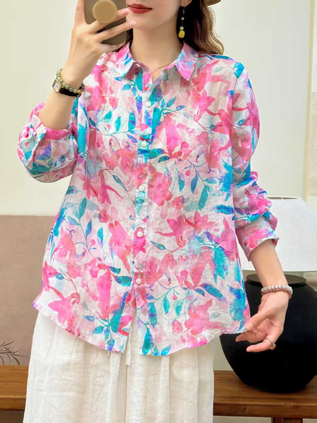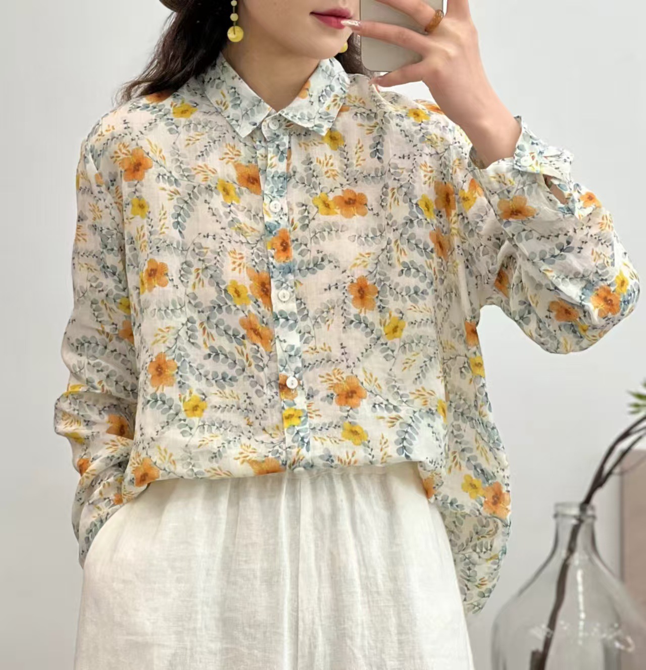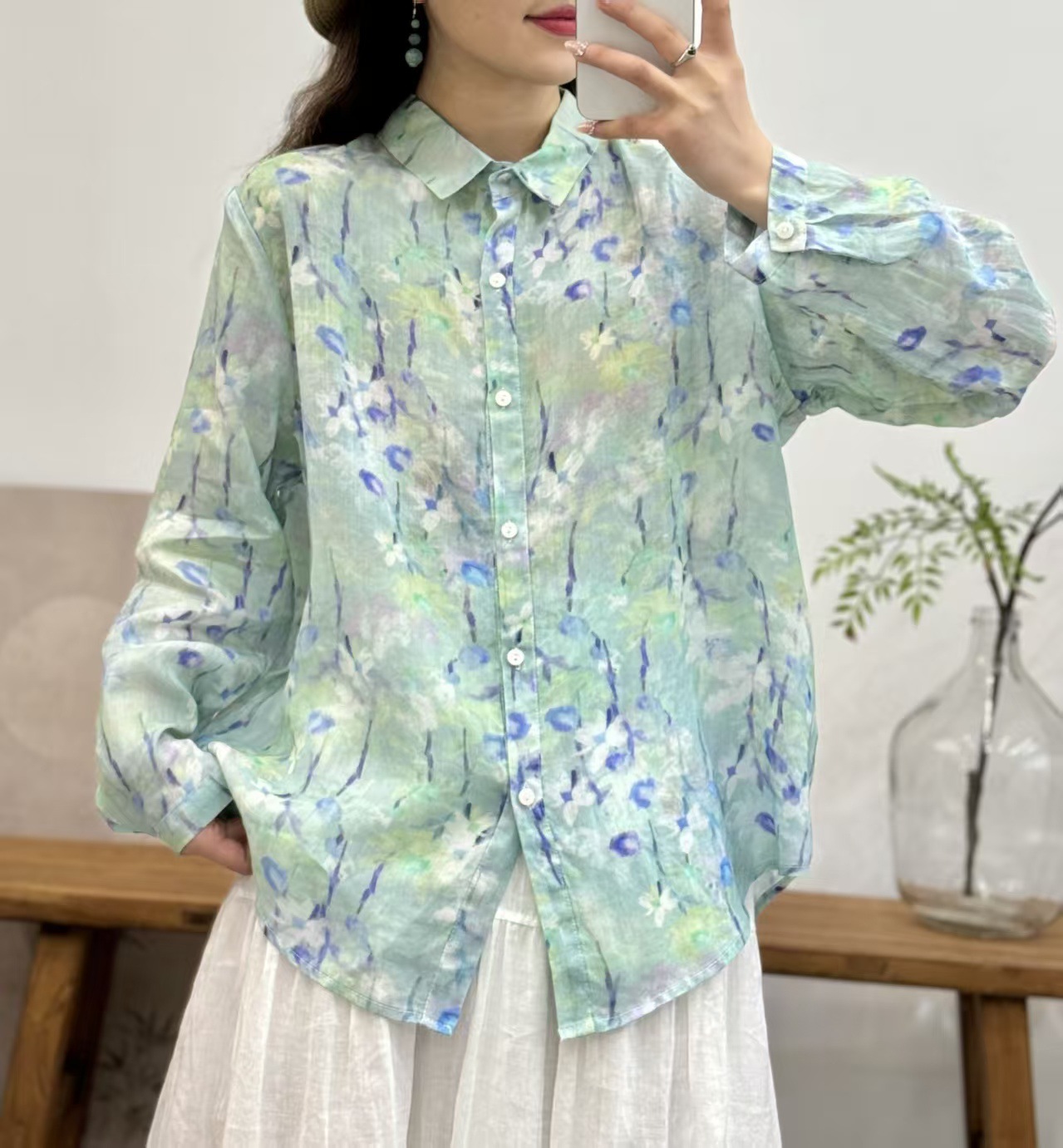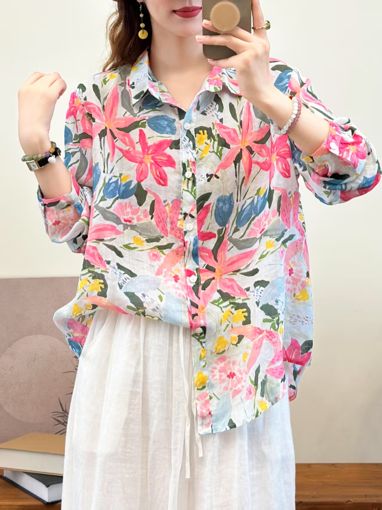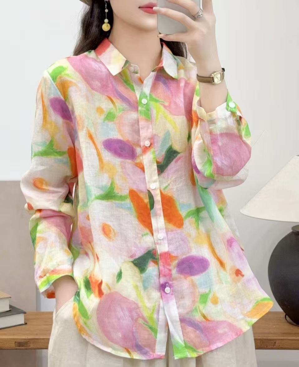 디지털 인쇄 순수 라미 셔츠 느슨한 긴 소매 봄 및 가을 새로운 레트로 예술적 캐주얼 올 매치 싱글 브레스트 셔츠