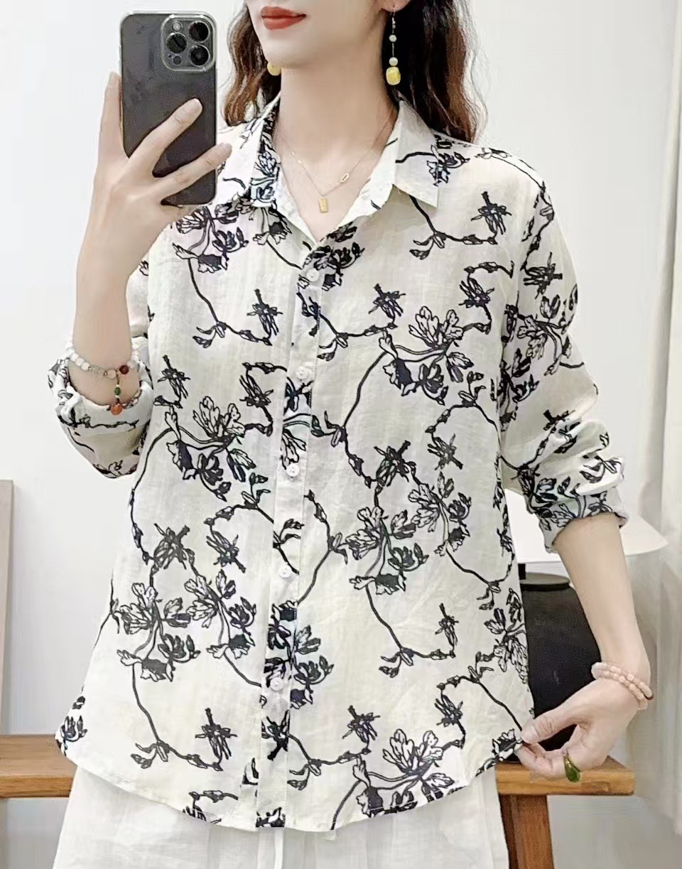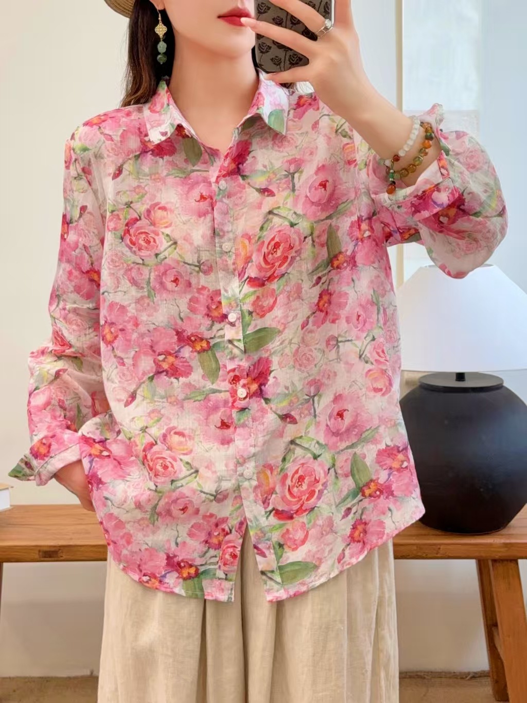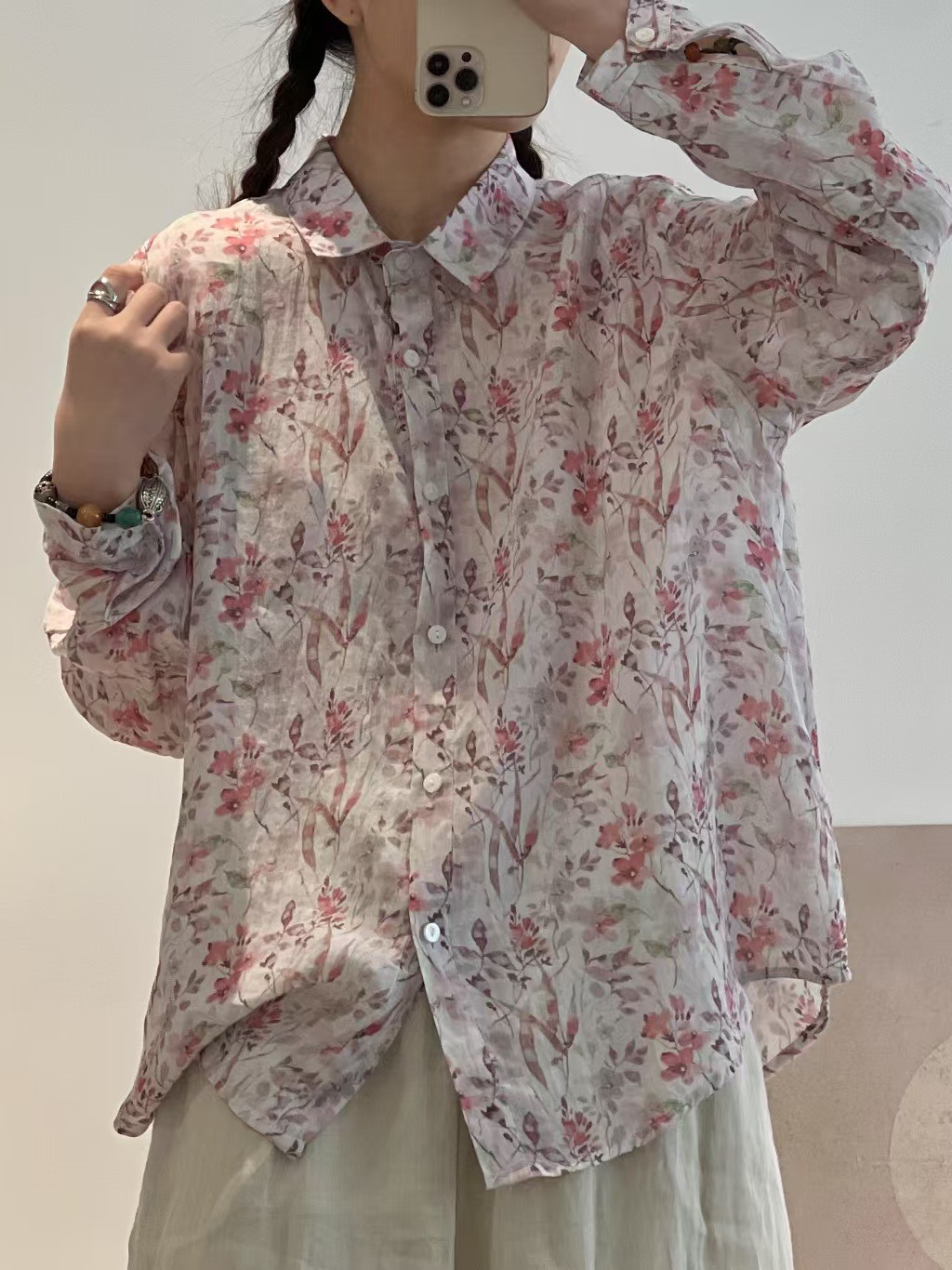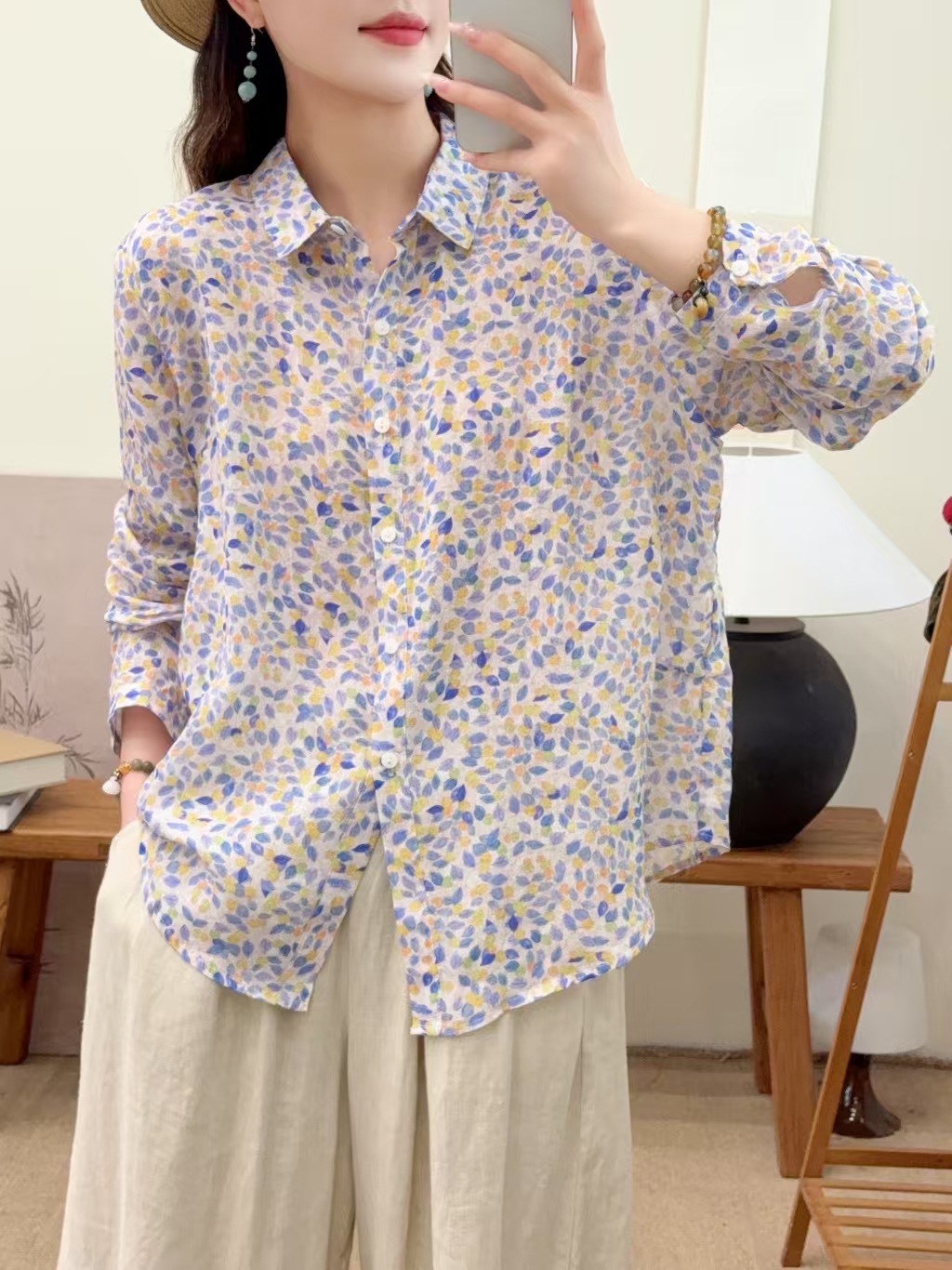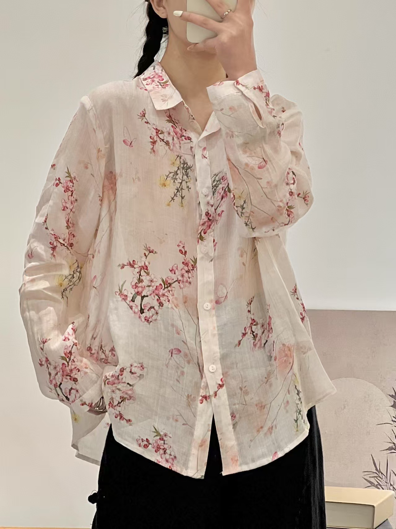 디지털 인쇄 순수 라미 셔츠 느슨한 긴 소매 봄 및 가을 새로운 레트로 예술적 캐주얼 올 매치 싱글 브레스트 셔츠