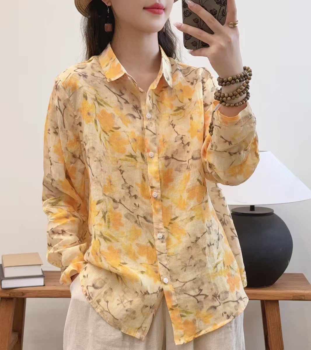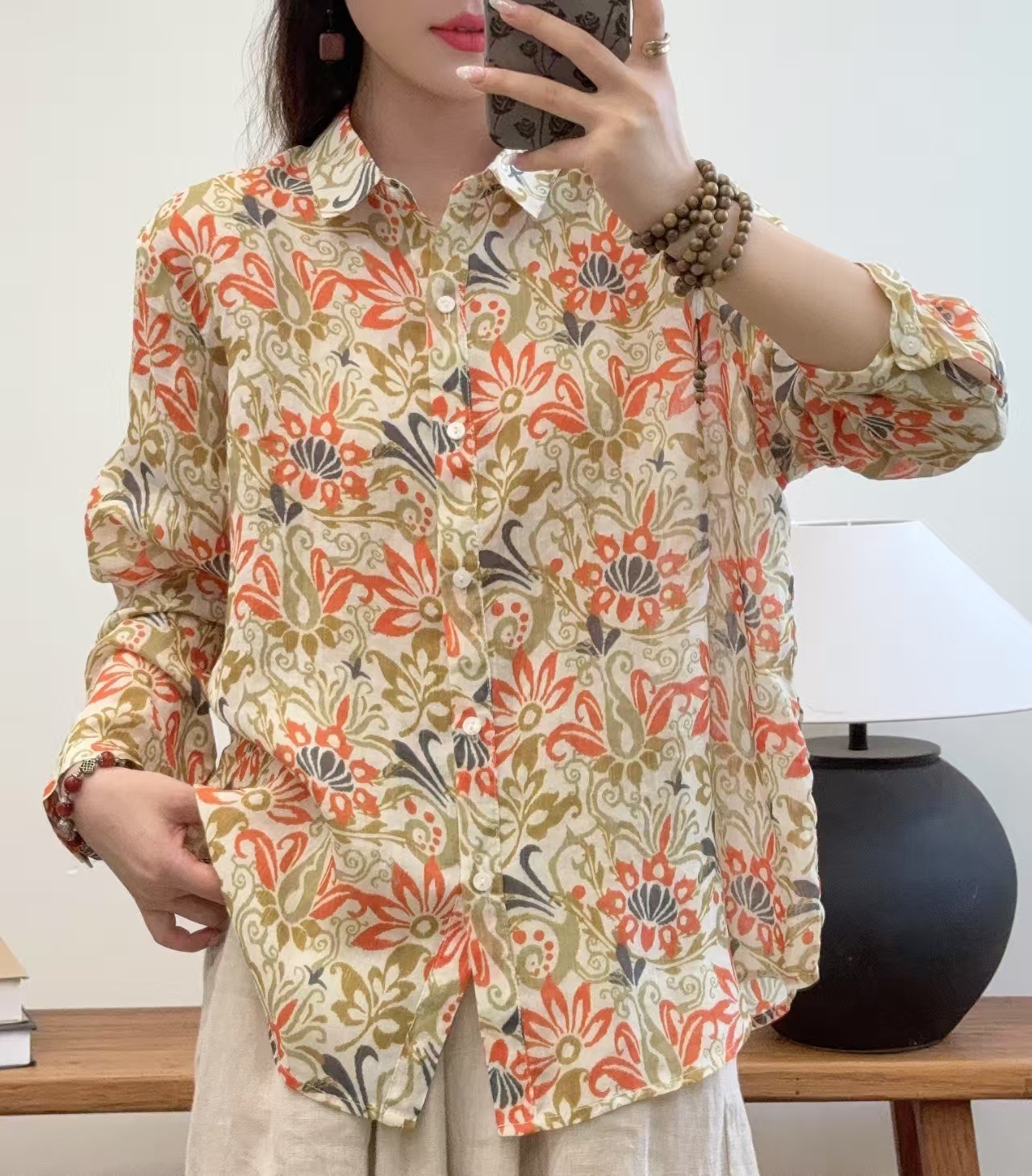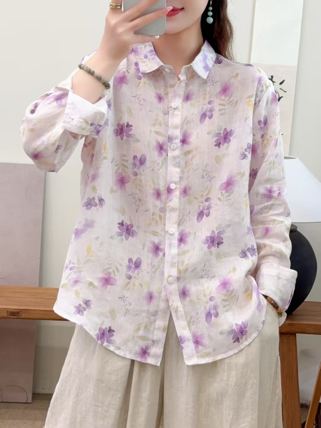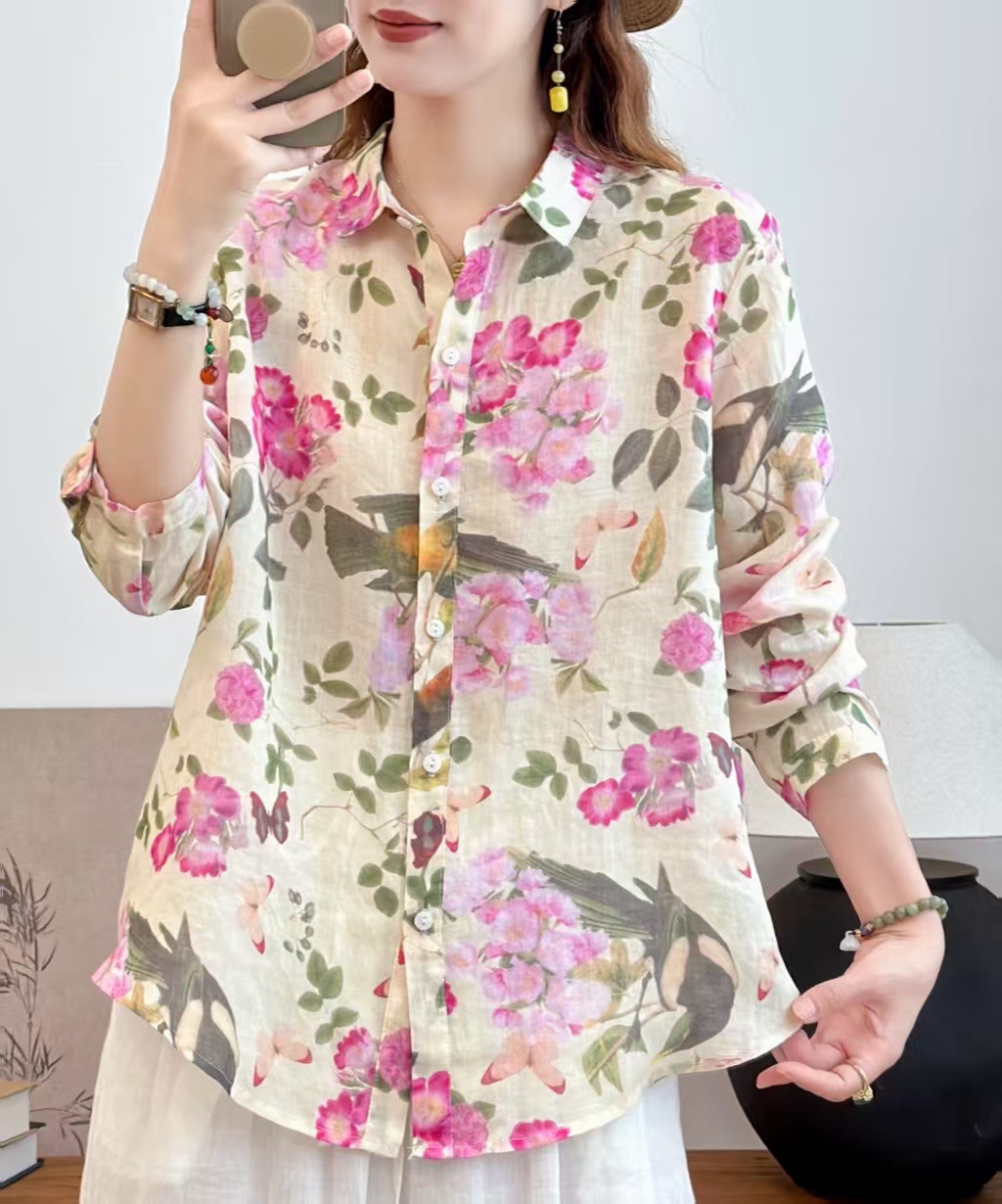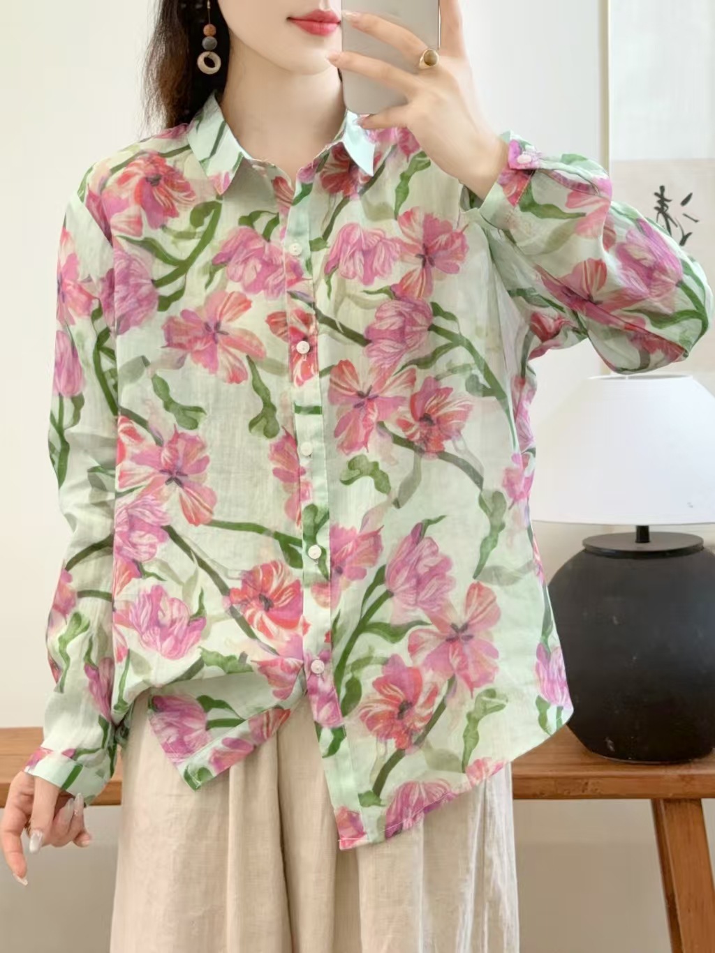 디지털 인쇄 순수 라미 셔츠 느슨한 긴 소매 봄 및 가을 새로운 레트로 예술적 캐주얼 올 매치 싱글 브레스트 셔츠