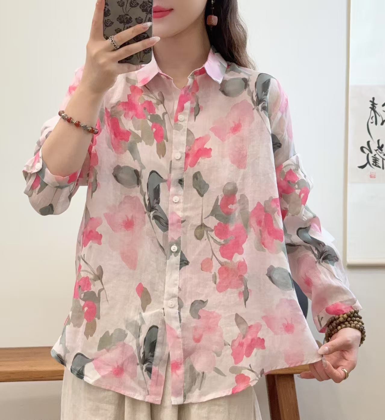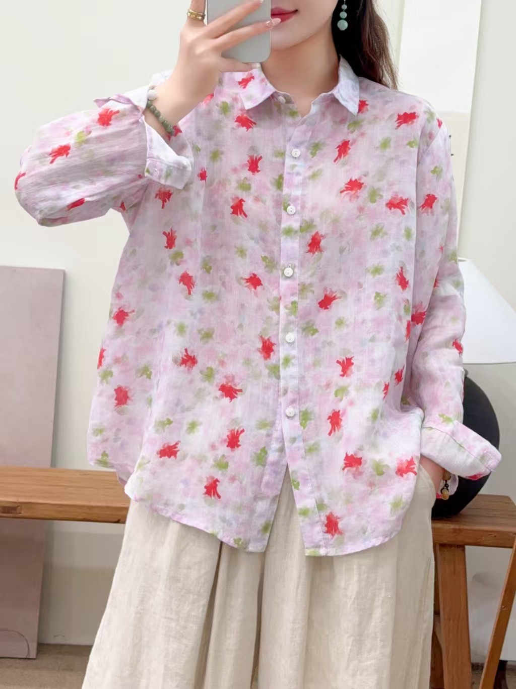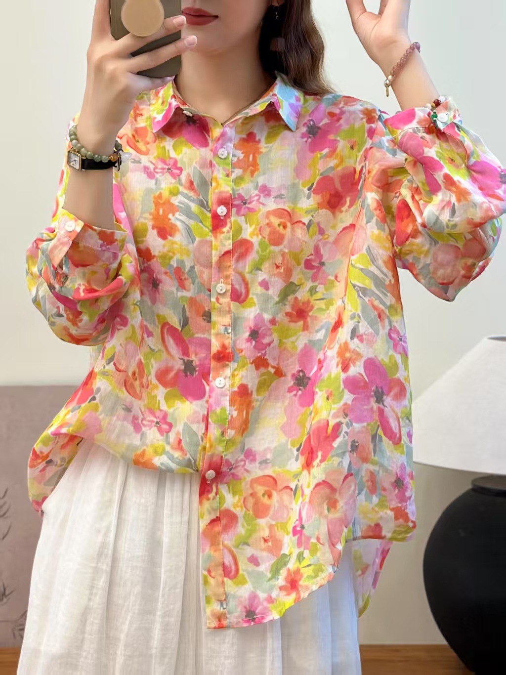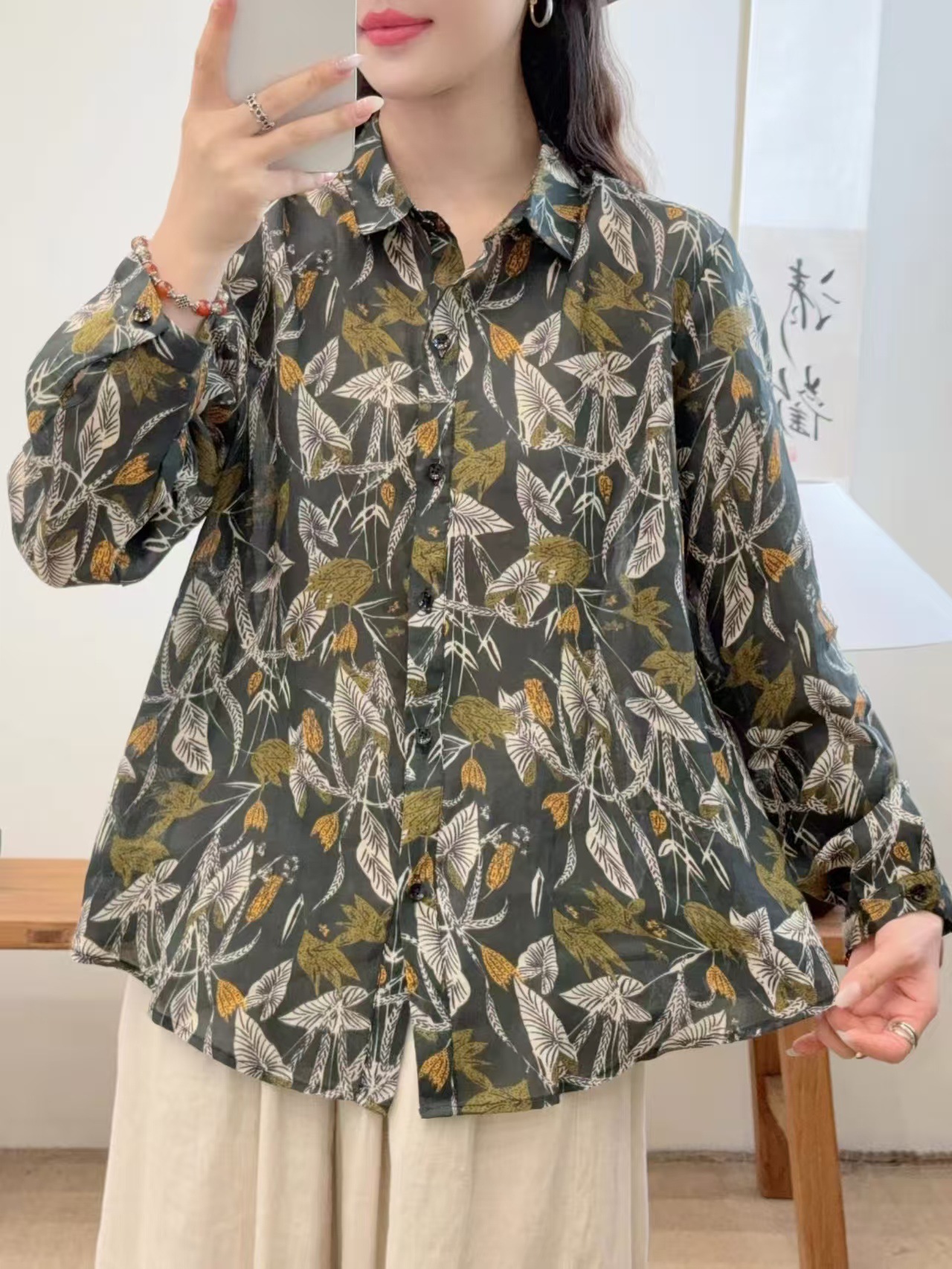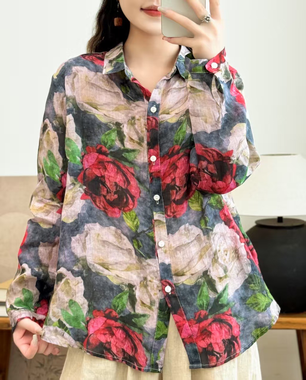 디지털 인쇄 순수 라미 셔츠 느슨한 긴 소매 봄 및 가을 새로운 레트로 예술적 캐주얼 올 매치 싱글 브레스트 셔츠