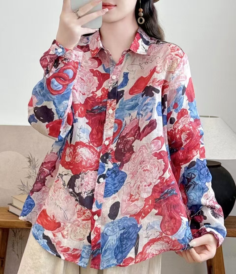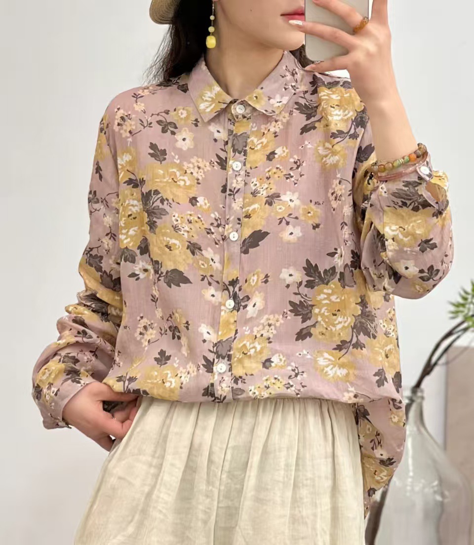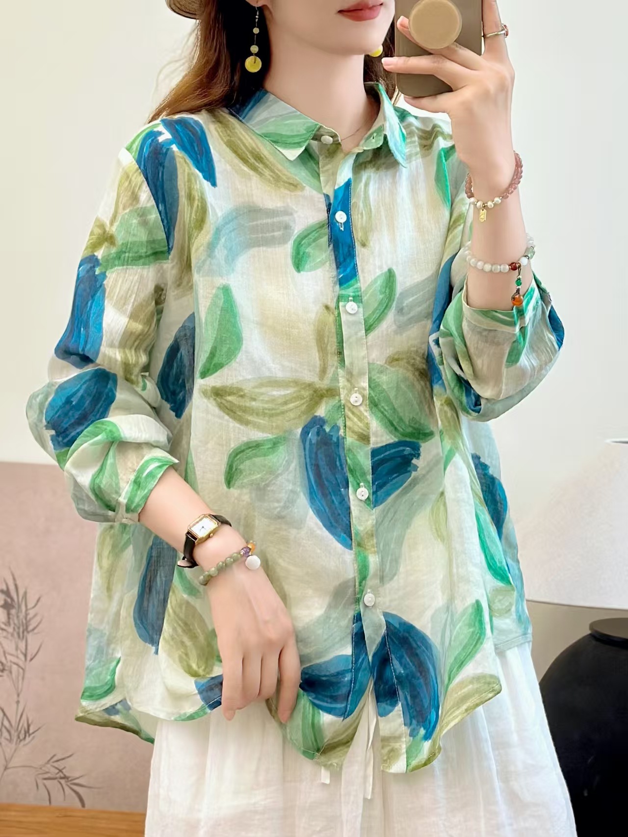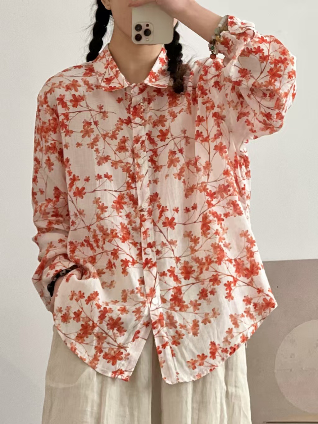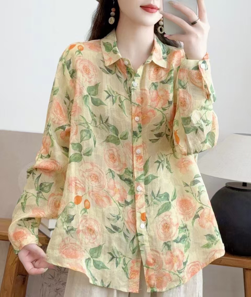 디지털 인쇄 순수 라미 셔츠 느슨한 긴 소매 봄 및 가을 새로운 레트로 예술적 캐주얼 올 매치 싱글 브레스트 셔츠