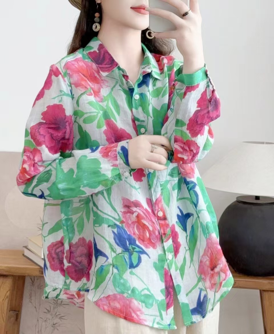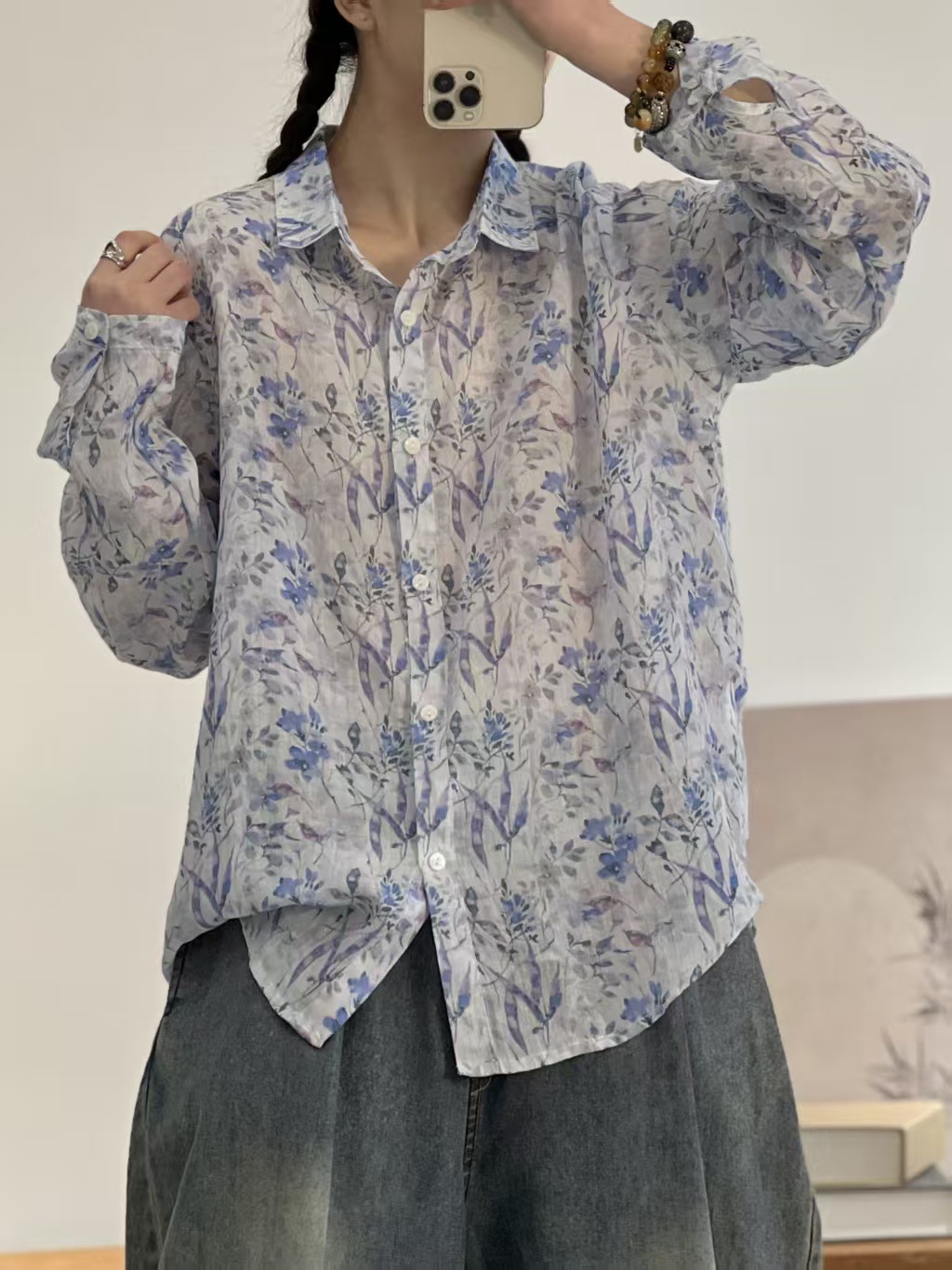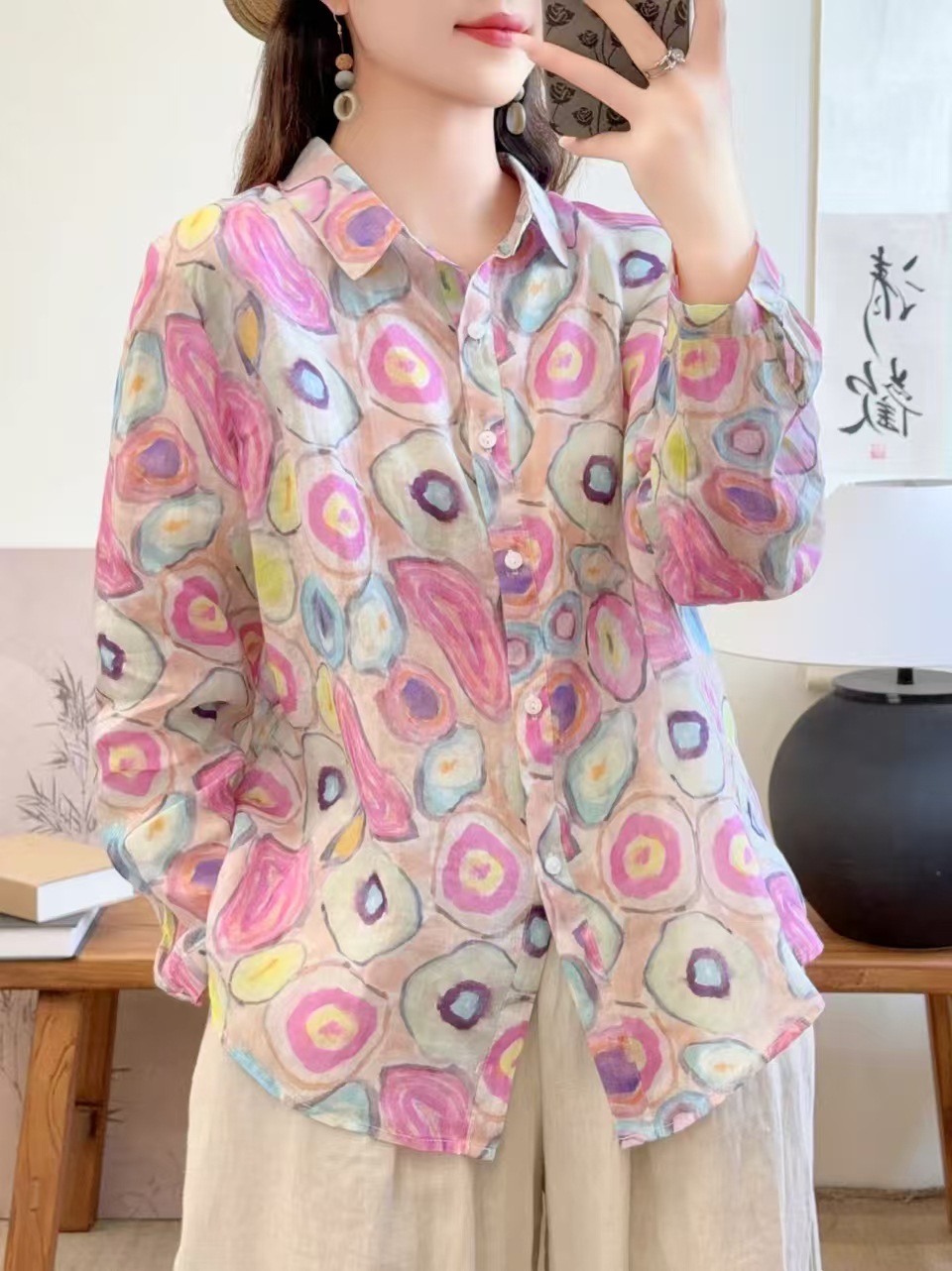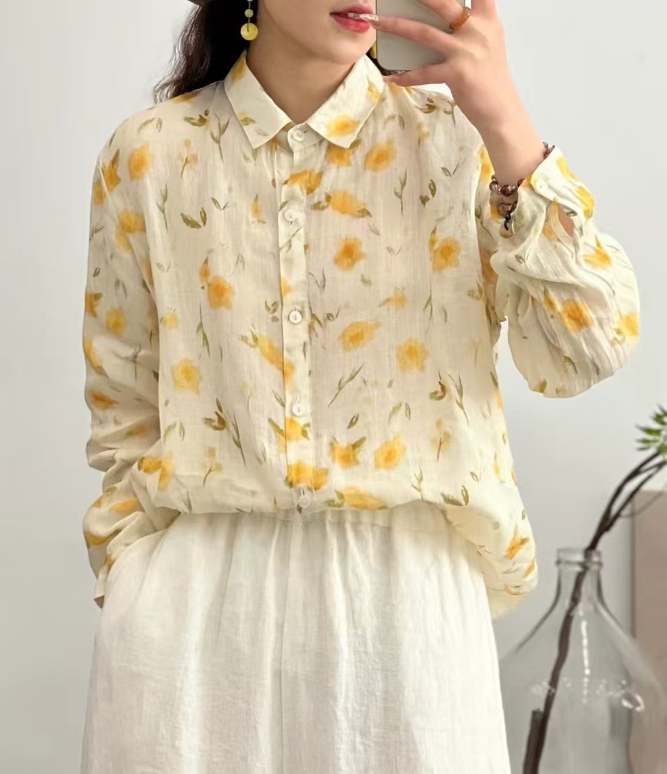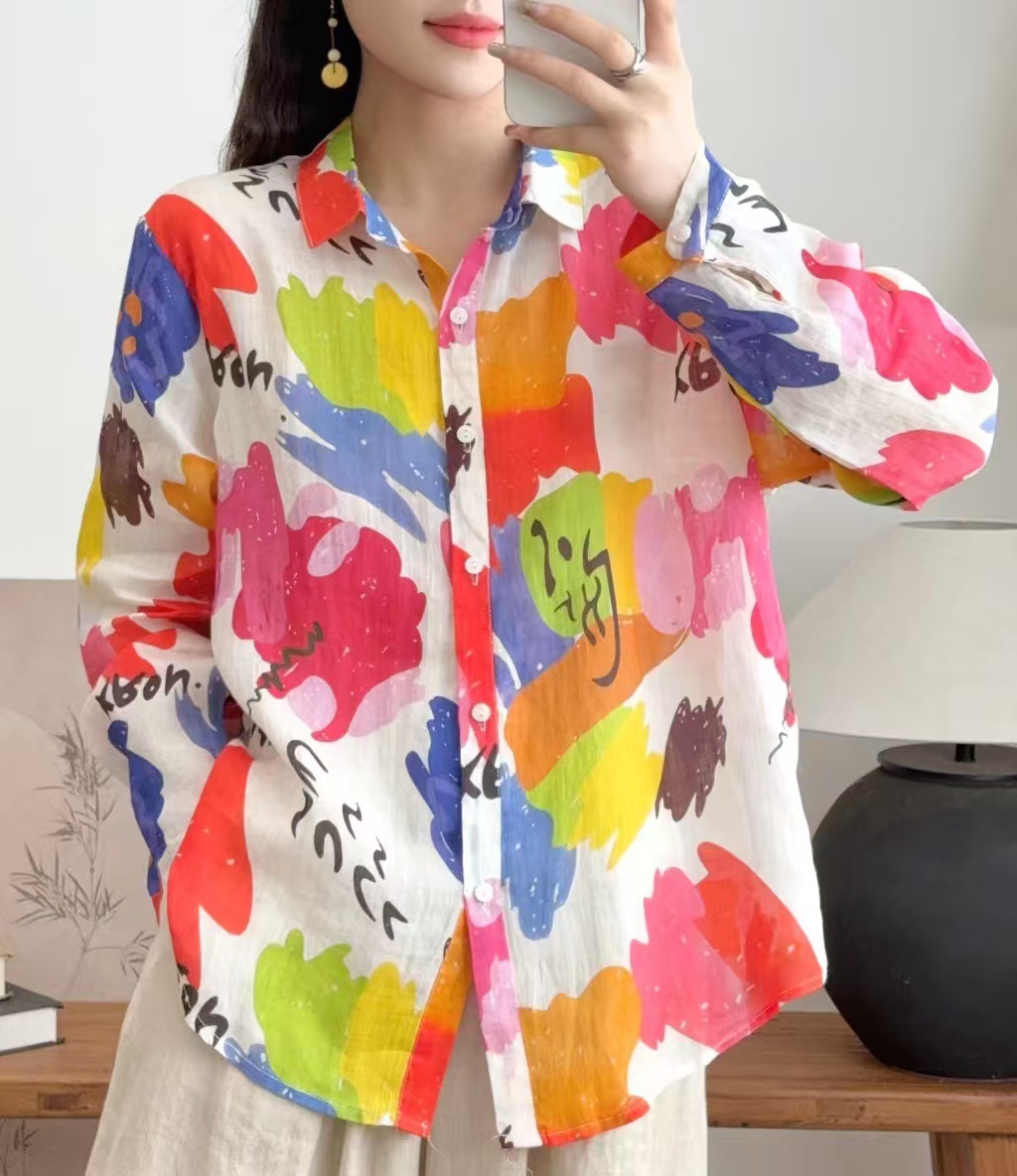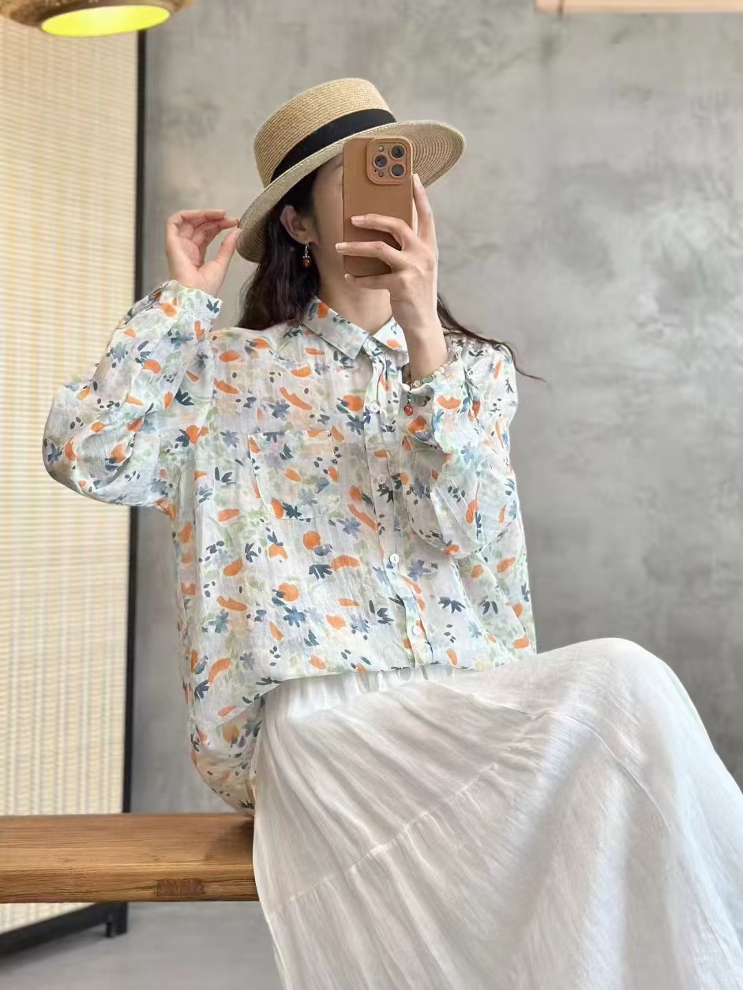 디지털 인쇄 순수 라미 셔츠 느슨한 긴 소매 봄 및 가을 새로운 레트로 예술적 캐주얼 올 매치 싱글 브레스트 셔츠