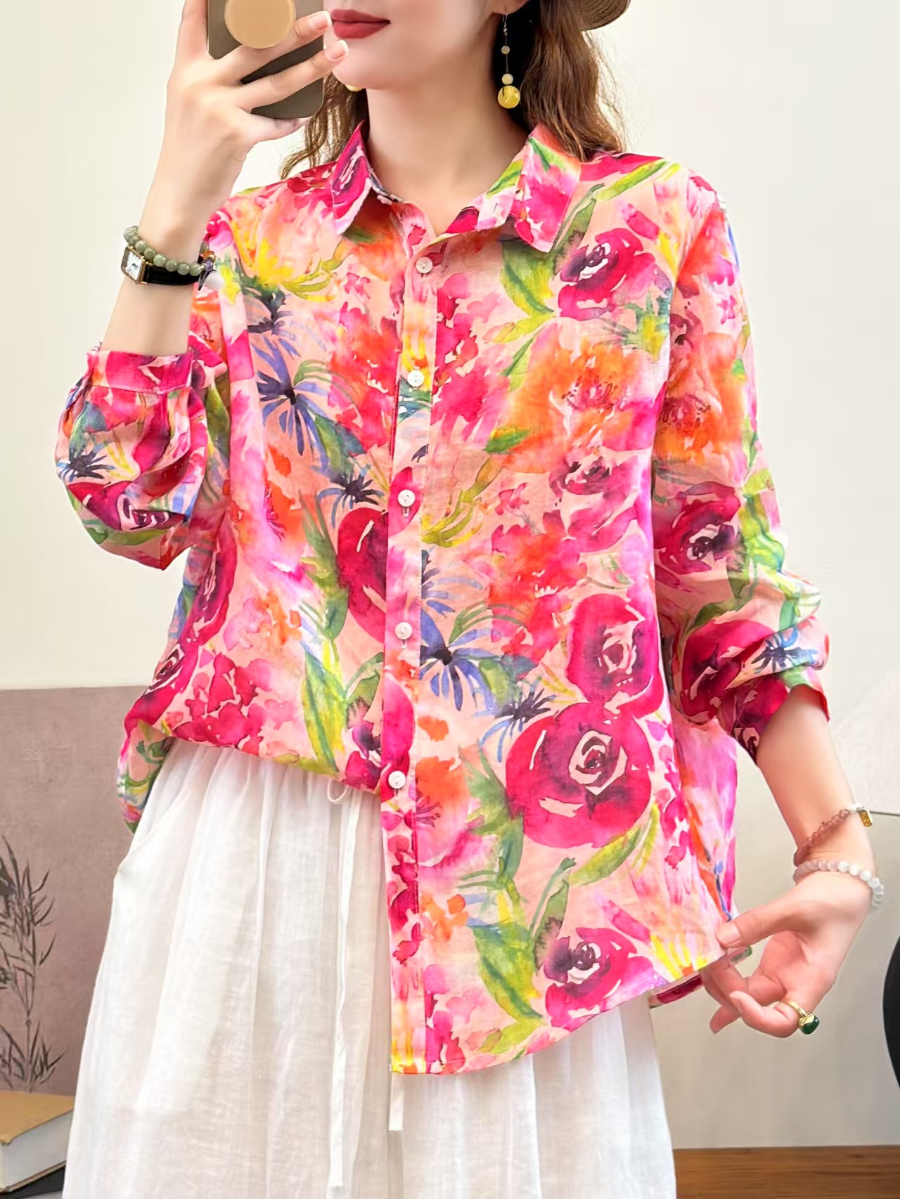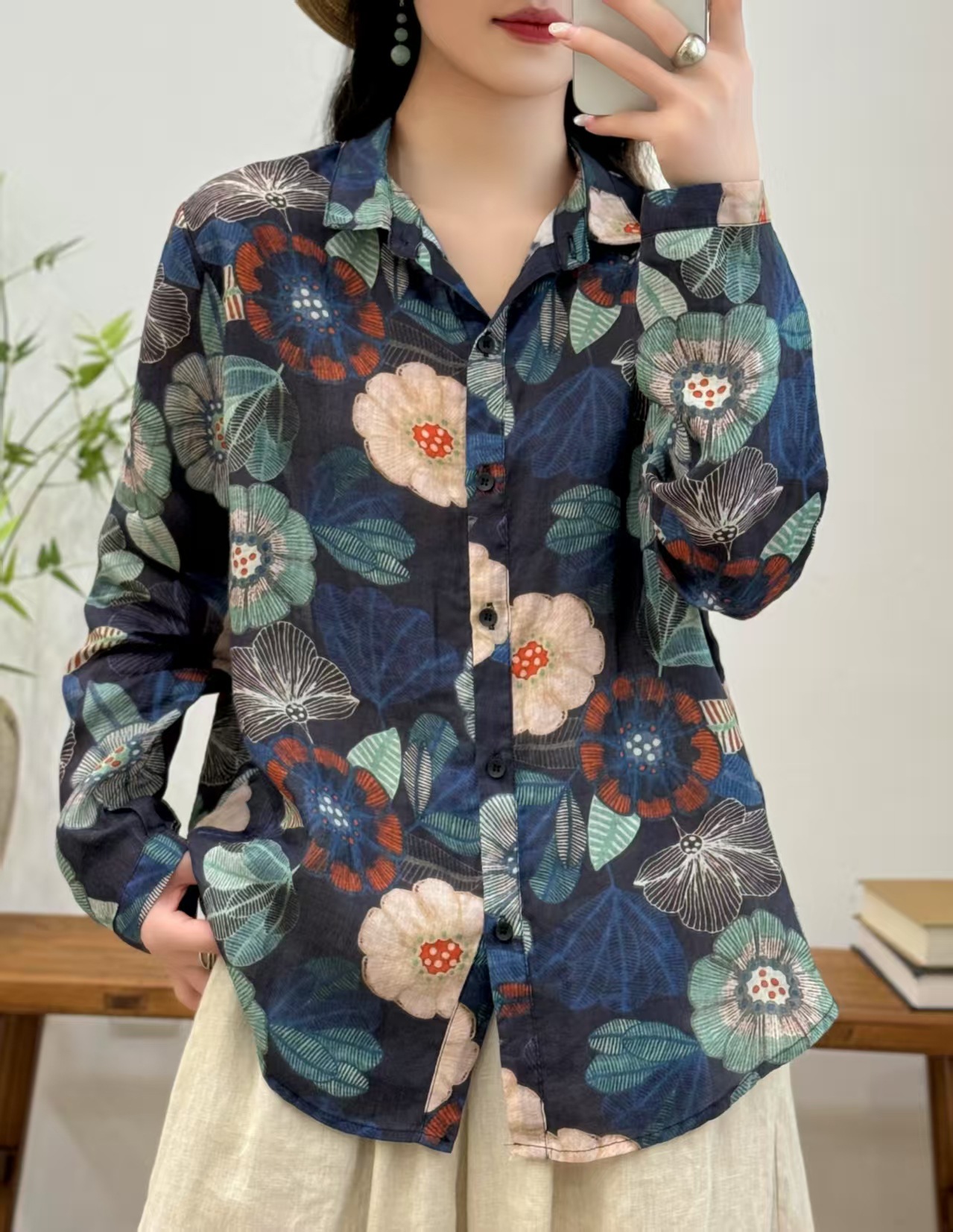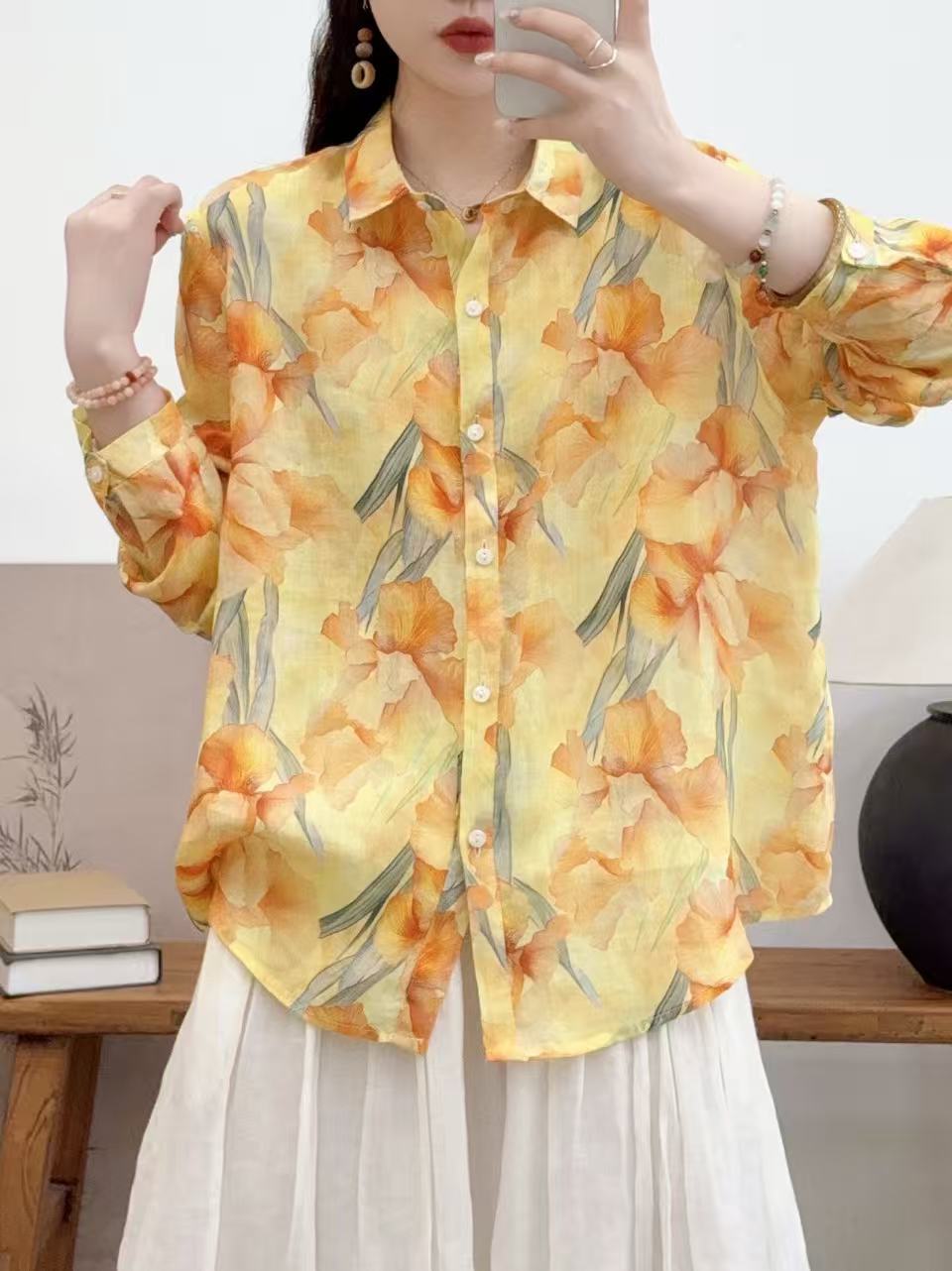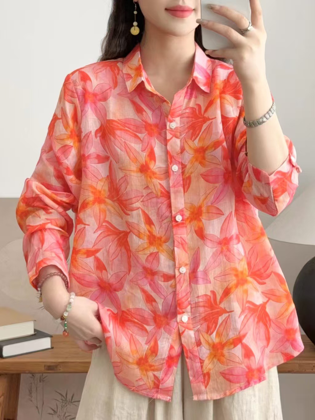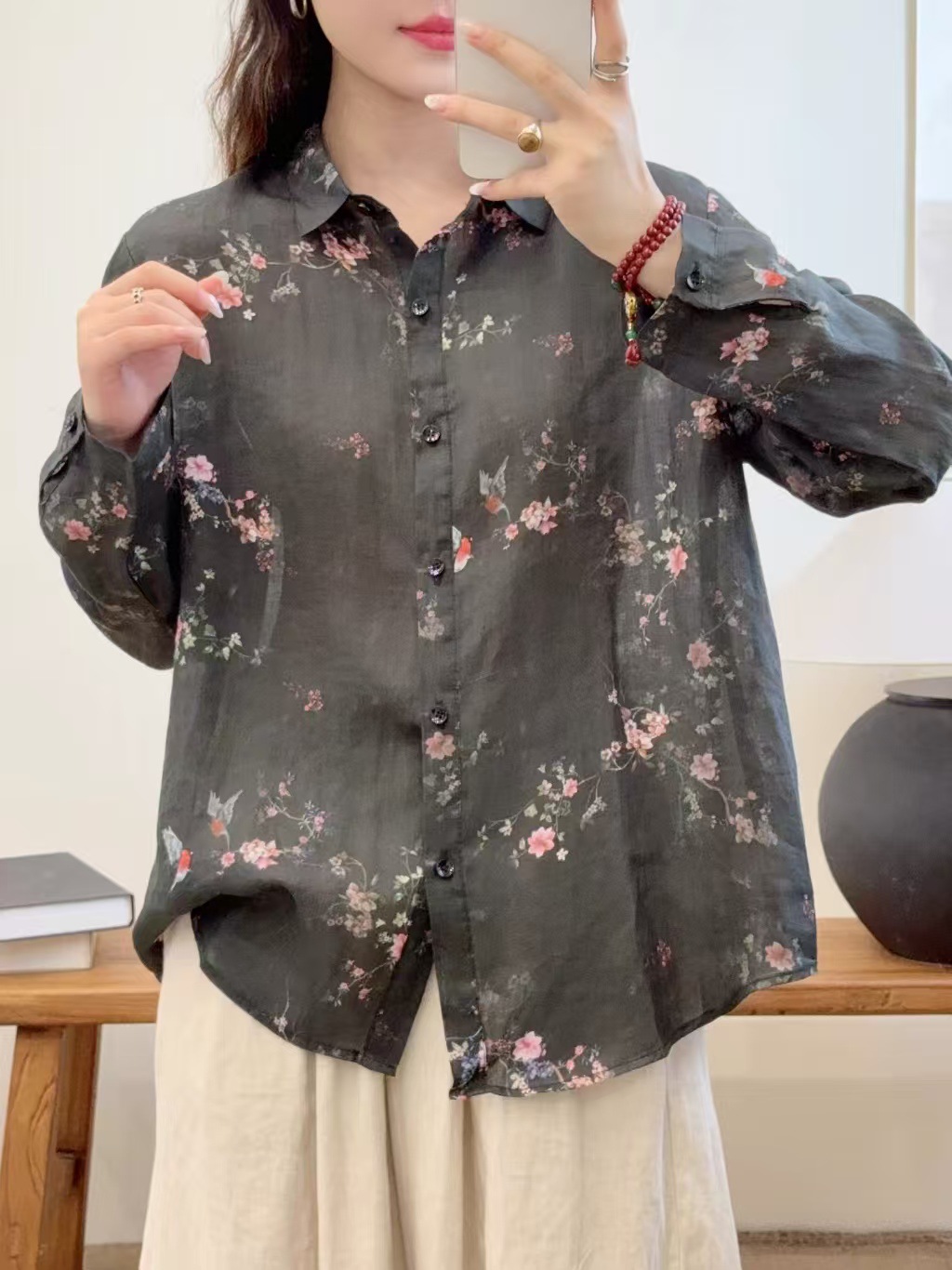 디지털 인쇄 순수 라미 셔츠 느슨한 긴 소매 봄 및 가을 새로운 레트로 예술적 캐주얼 올 매치 싱글 브레스트 셔츠