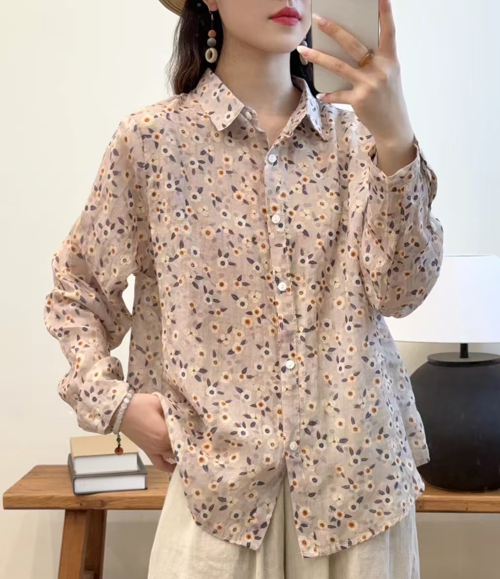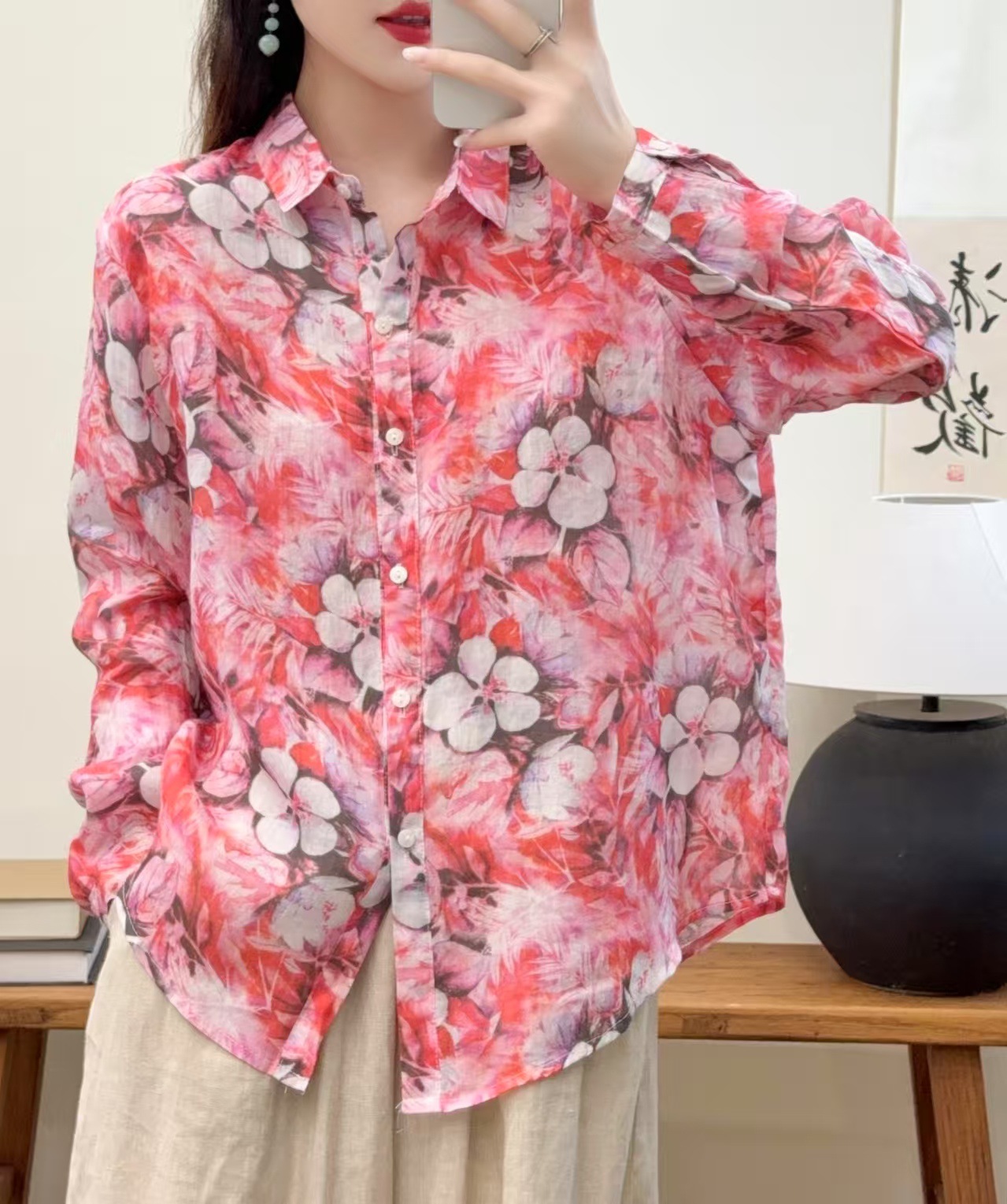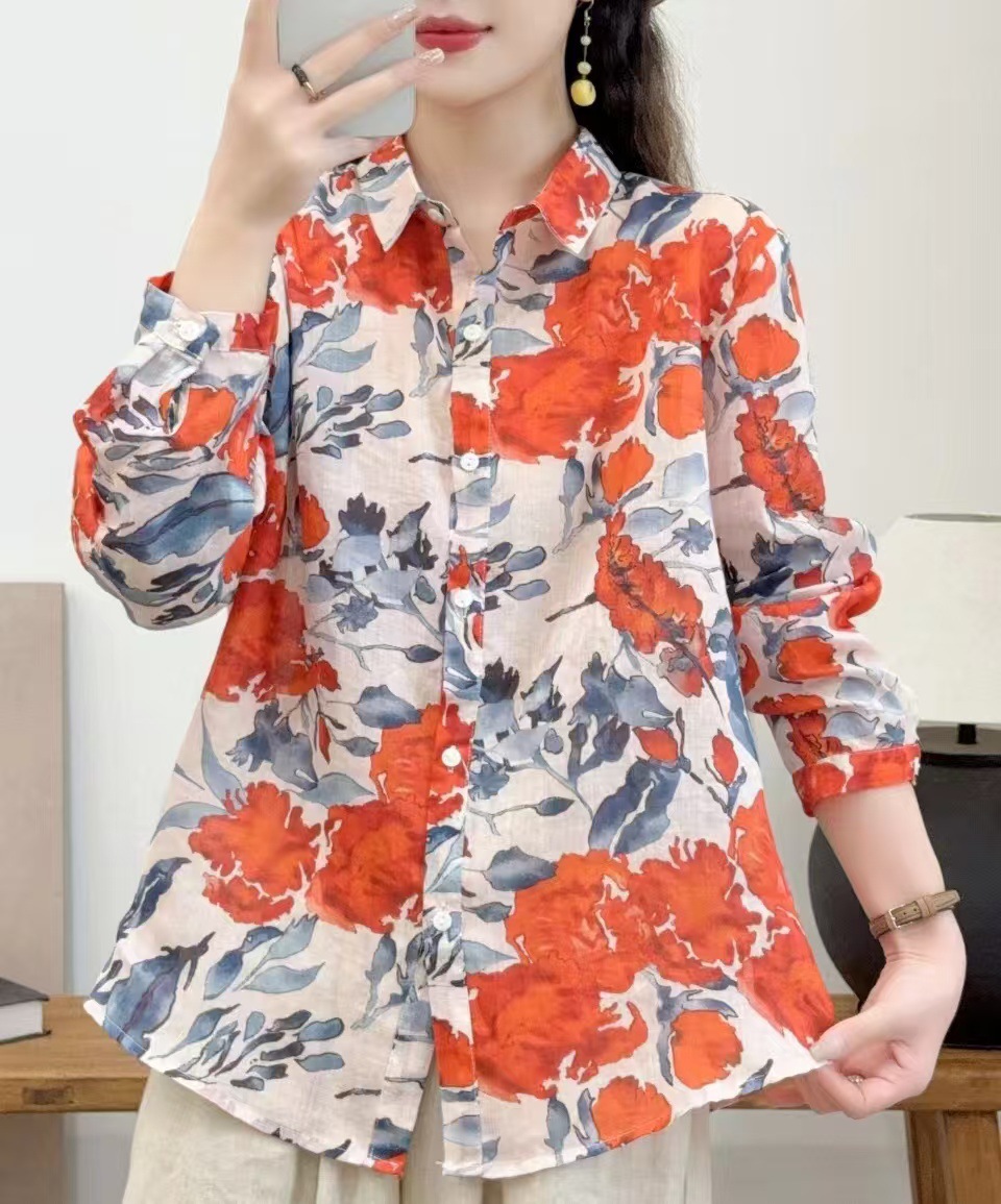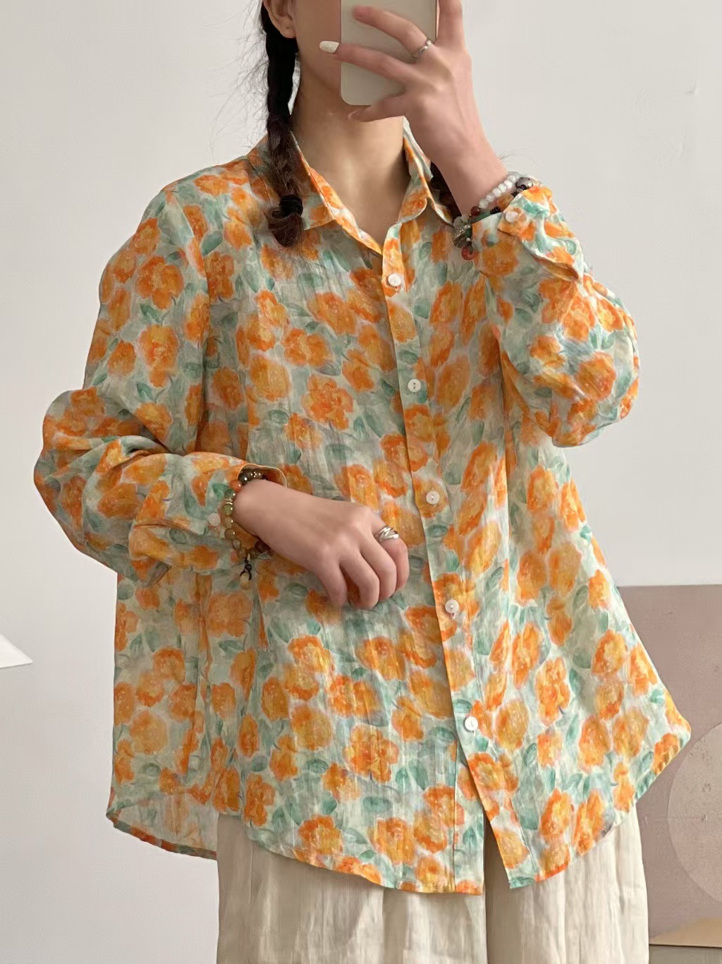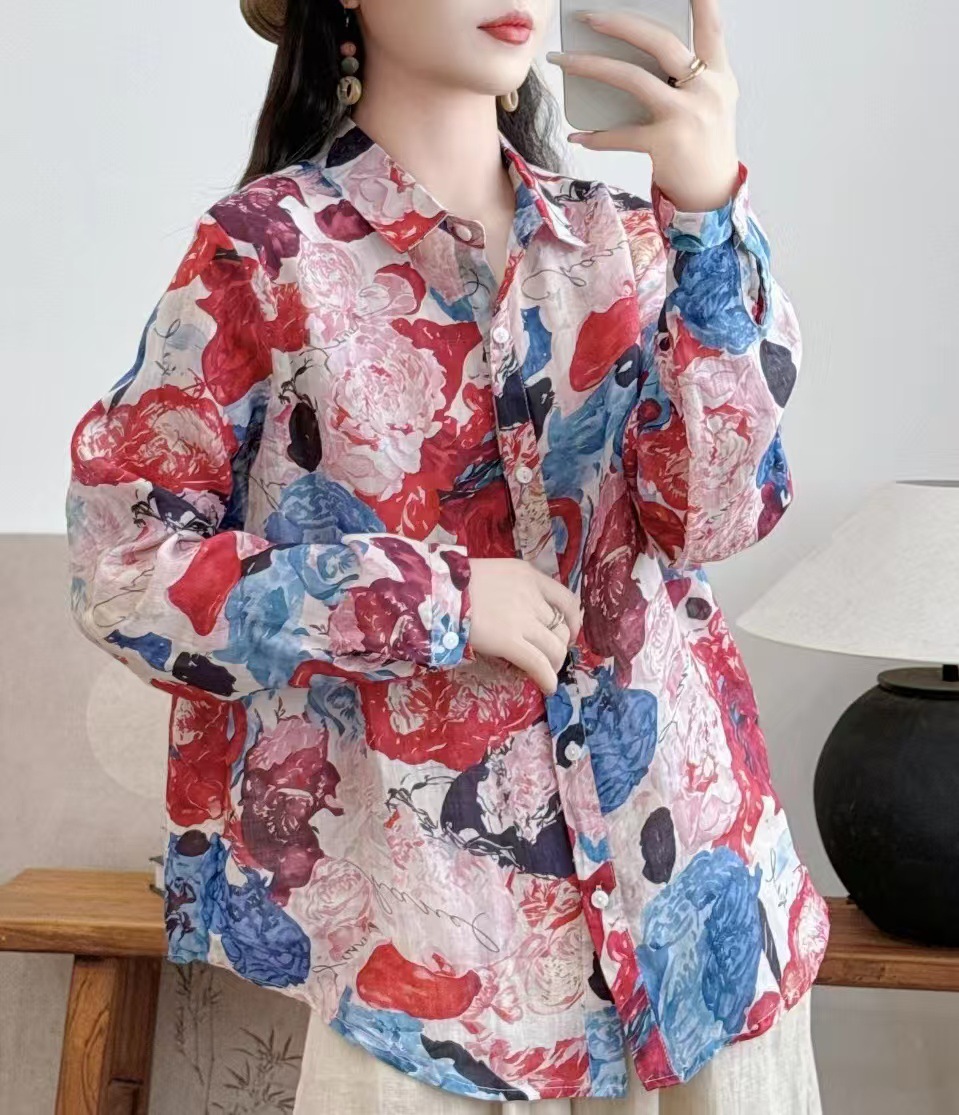 디지털 인쇄 순수 라미 셔츠 느슨한 긴 소매 봄 및 가을 새로운 레트로 예술적 캐주얼 올 매치 싱글 브레스트 셔츠
