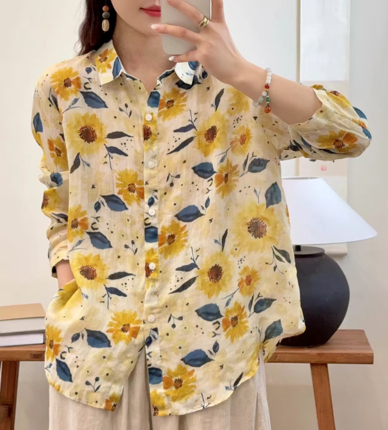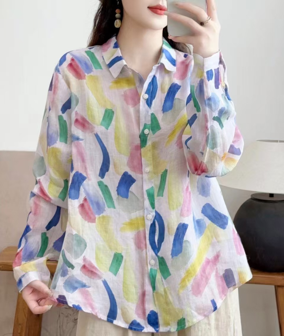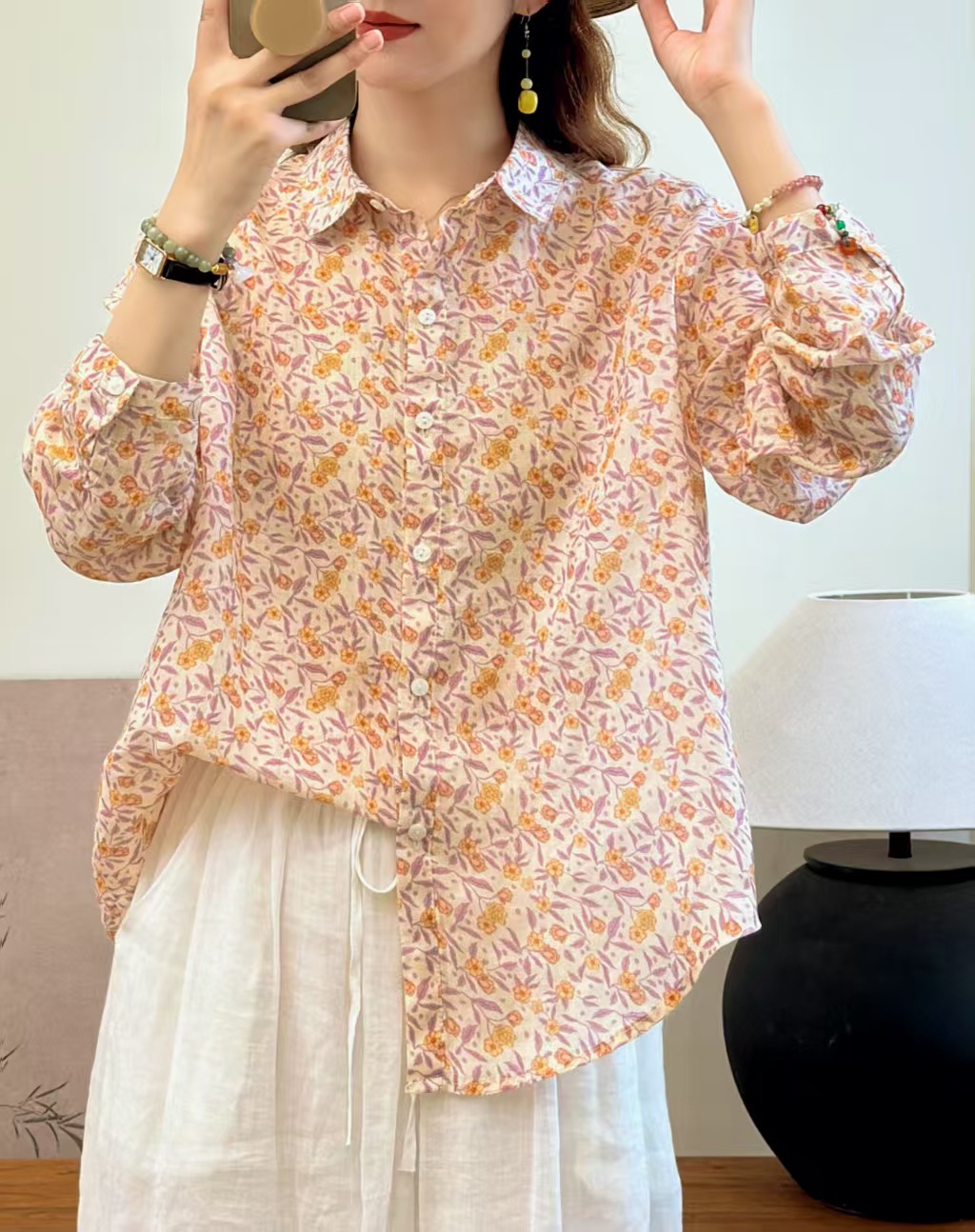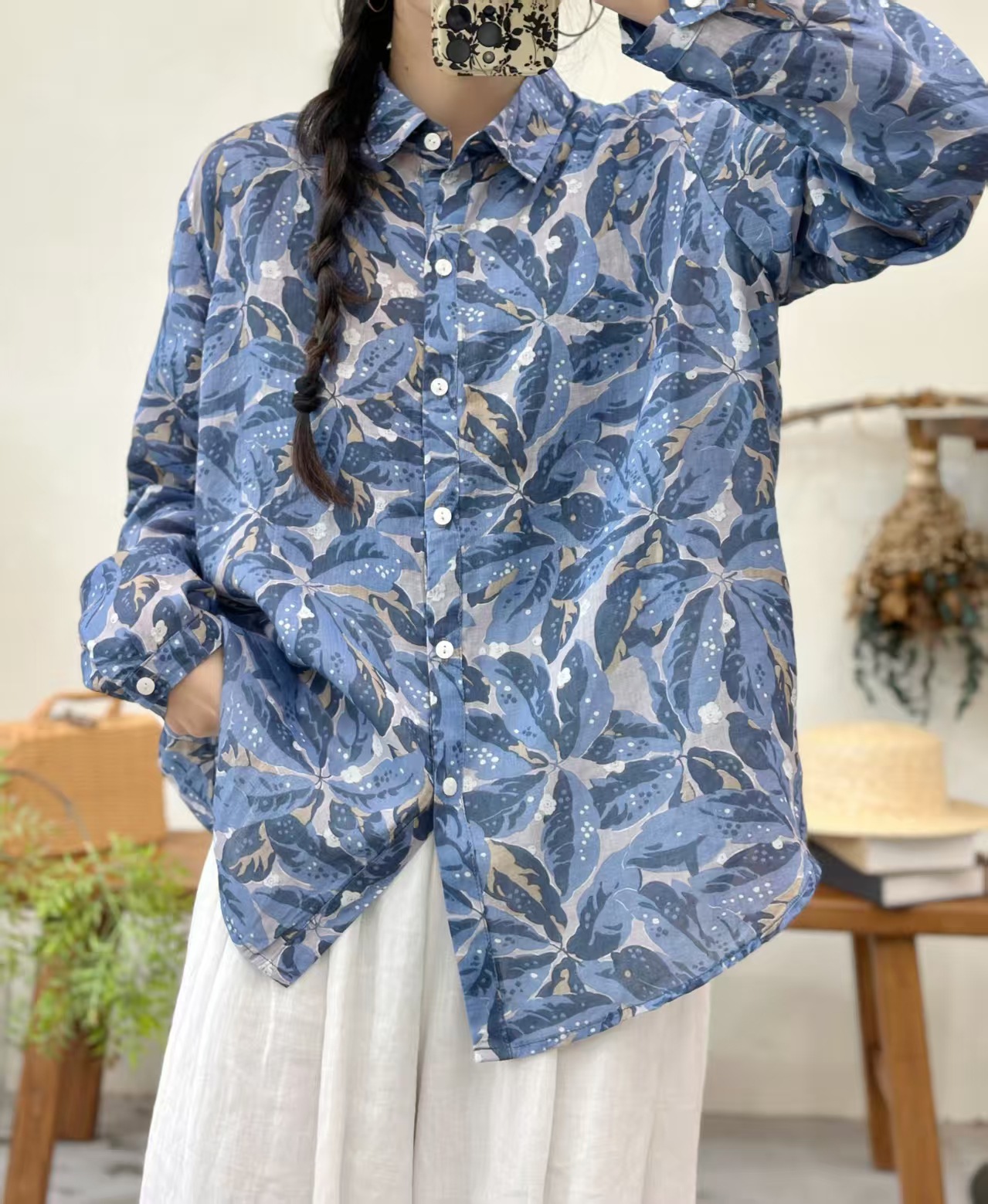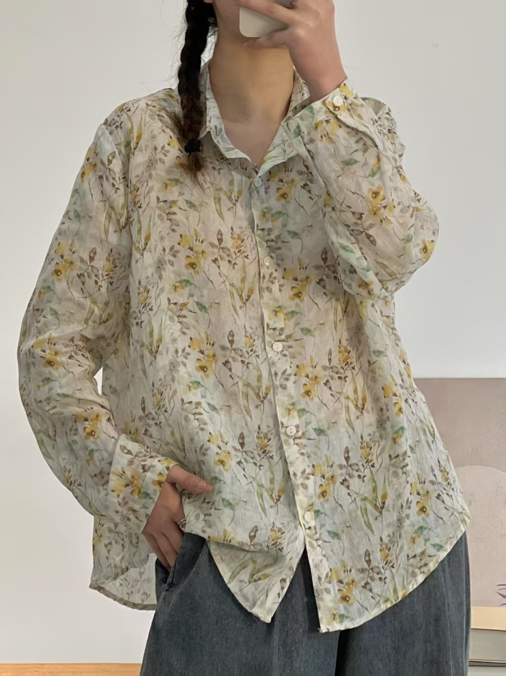 디지털 인쇄 순수 라미 셔츠 느슨한 긴 소매 봄 및 가을 새로운 레트로 예술적 캐주얼 올 매치 싱글 브레스트 셔츠