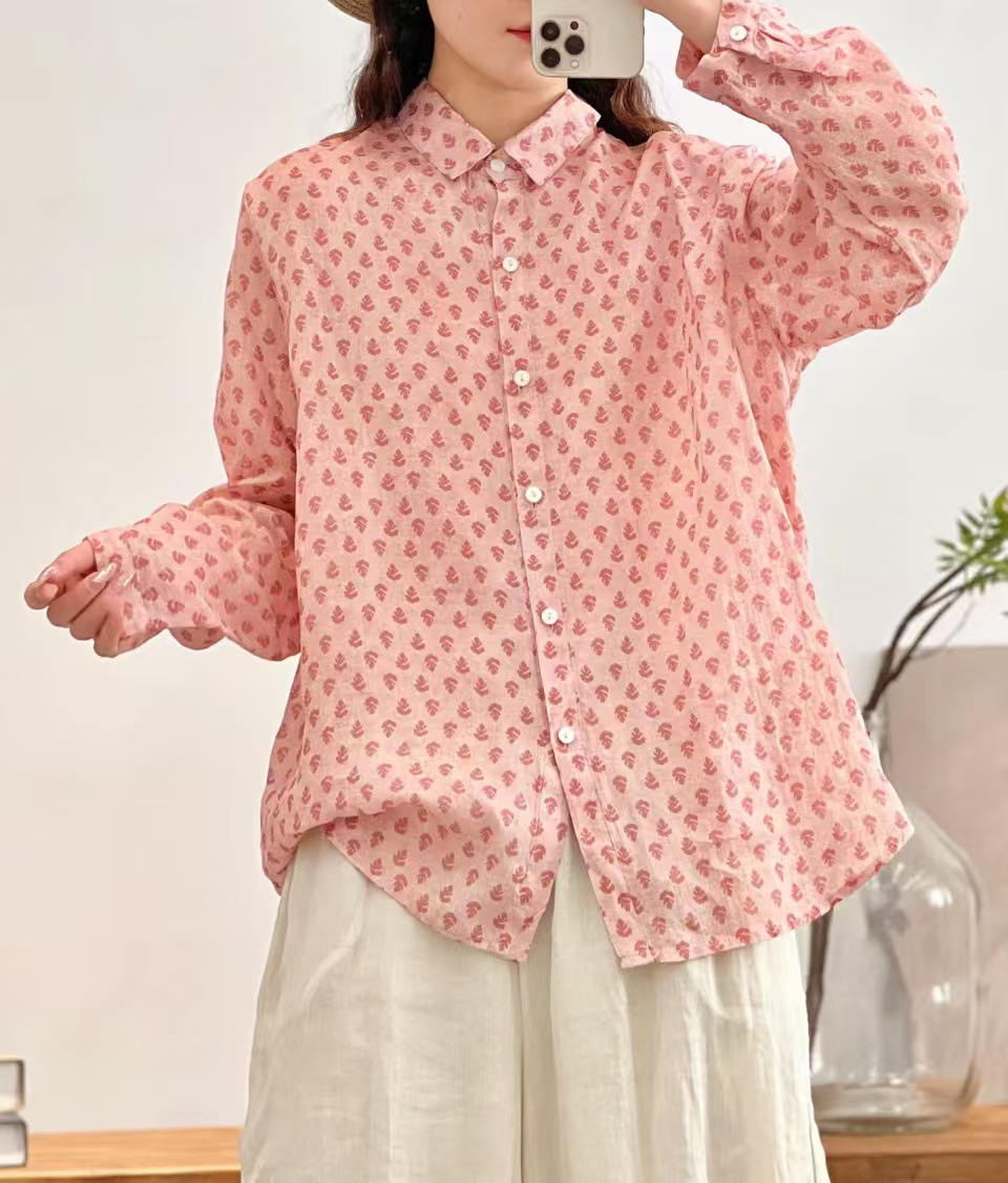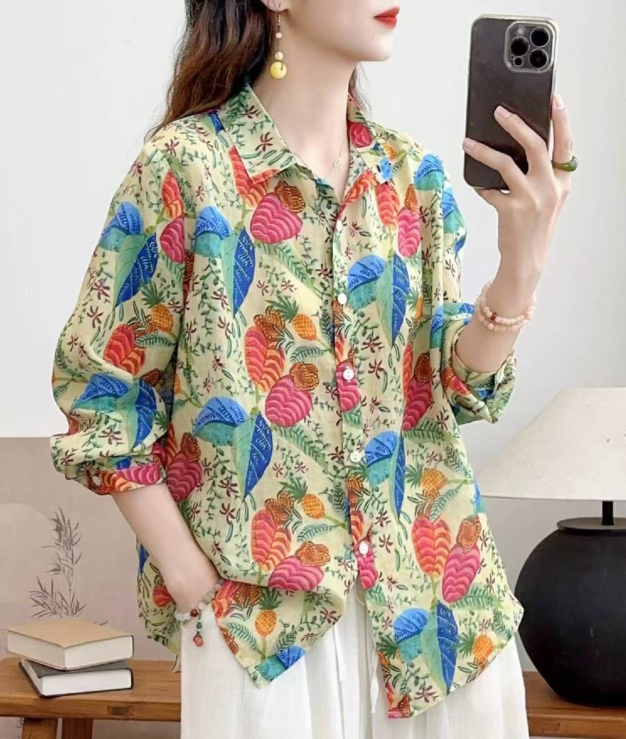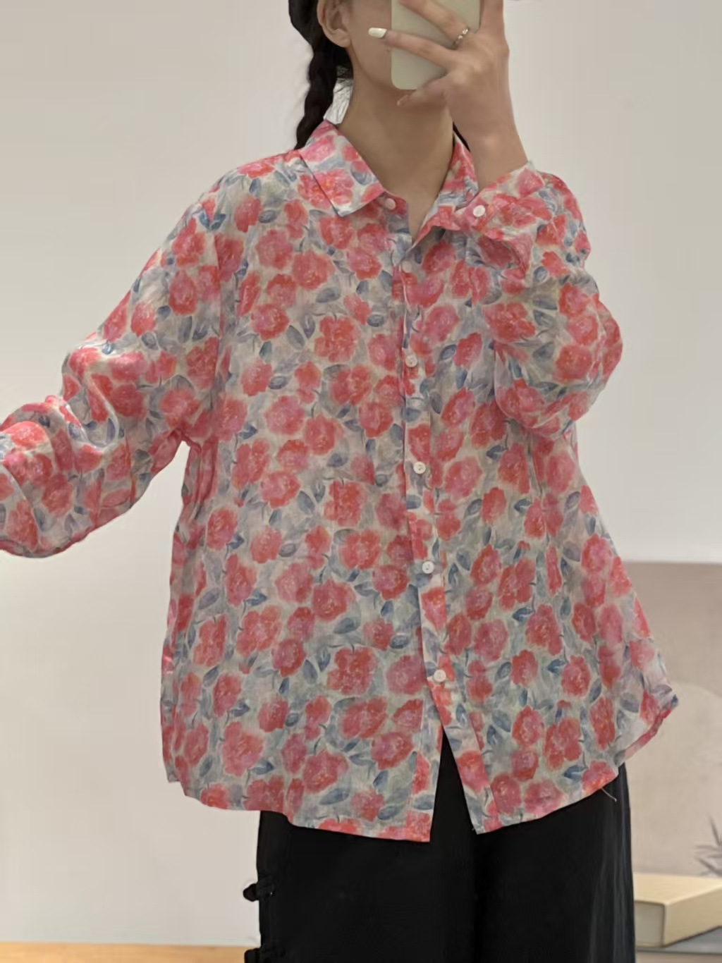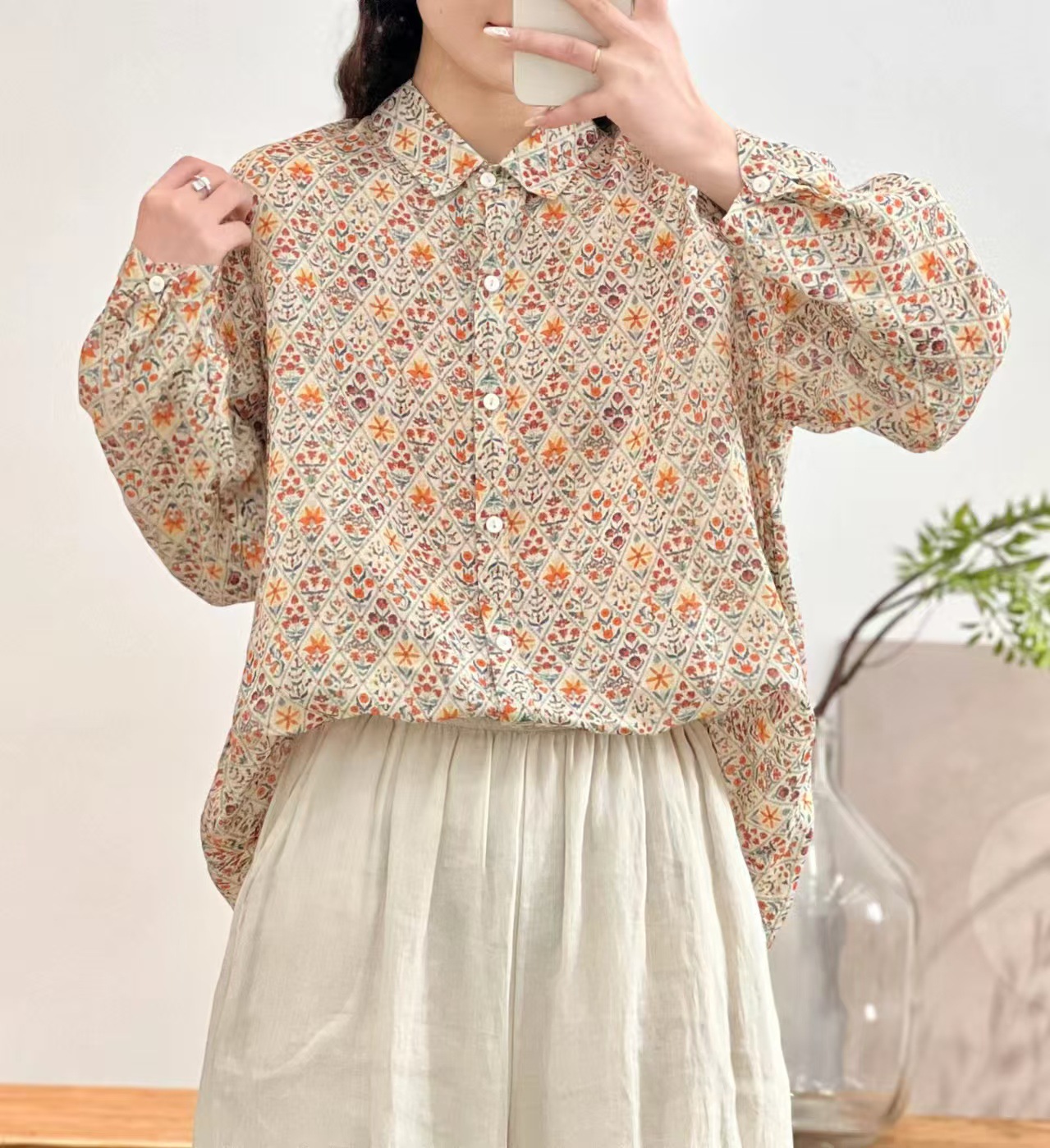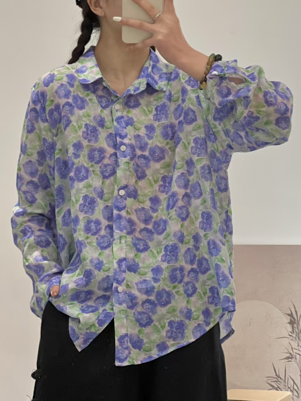디지털 인쇄 순수 라미 셔츠 느슨한 긴 소매 봄 및 가을 새로운 레트로 예술적 캐주얼 올 매치 싱글 브레스트 셔츠