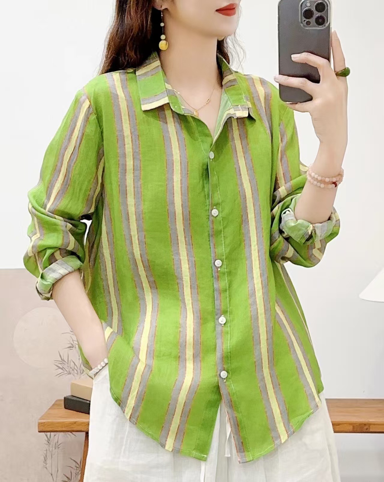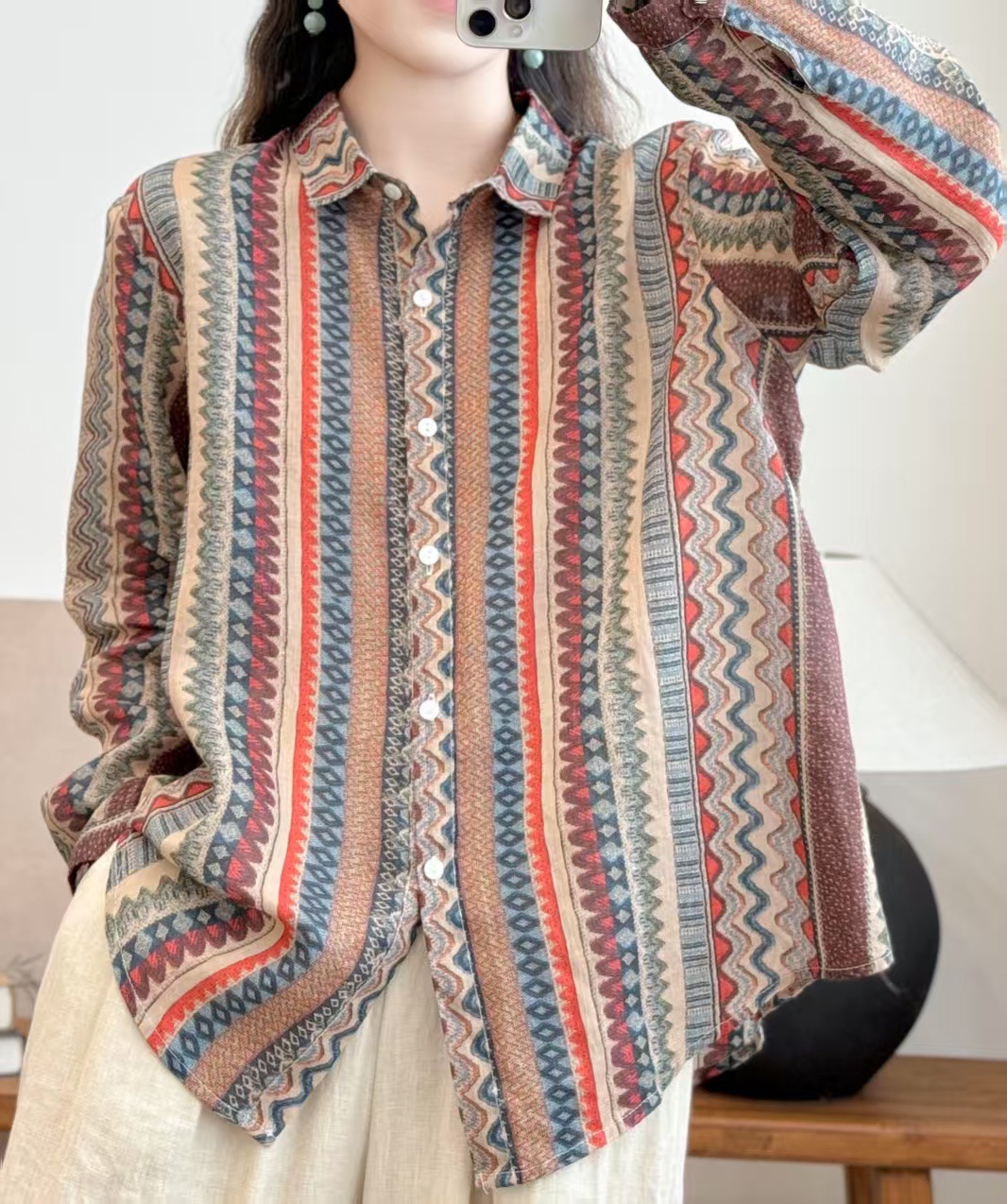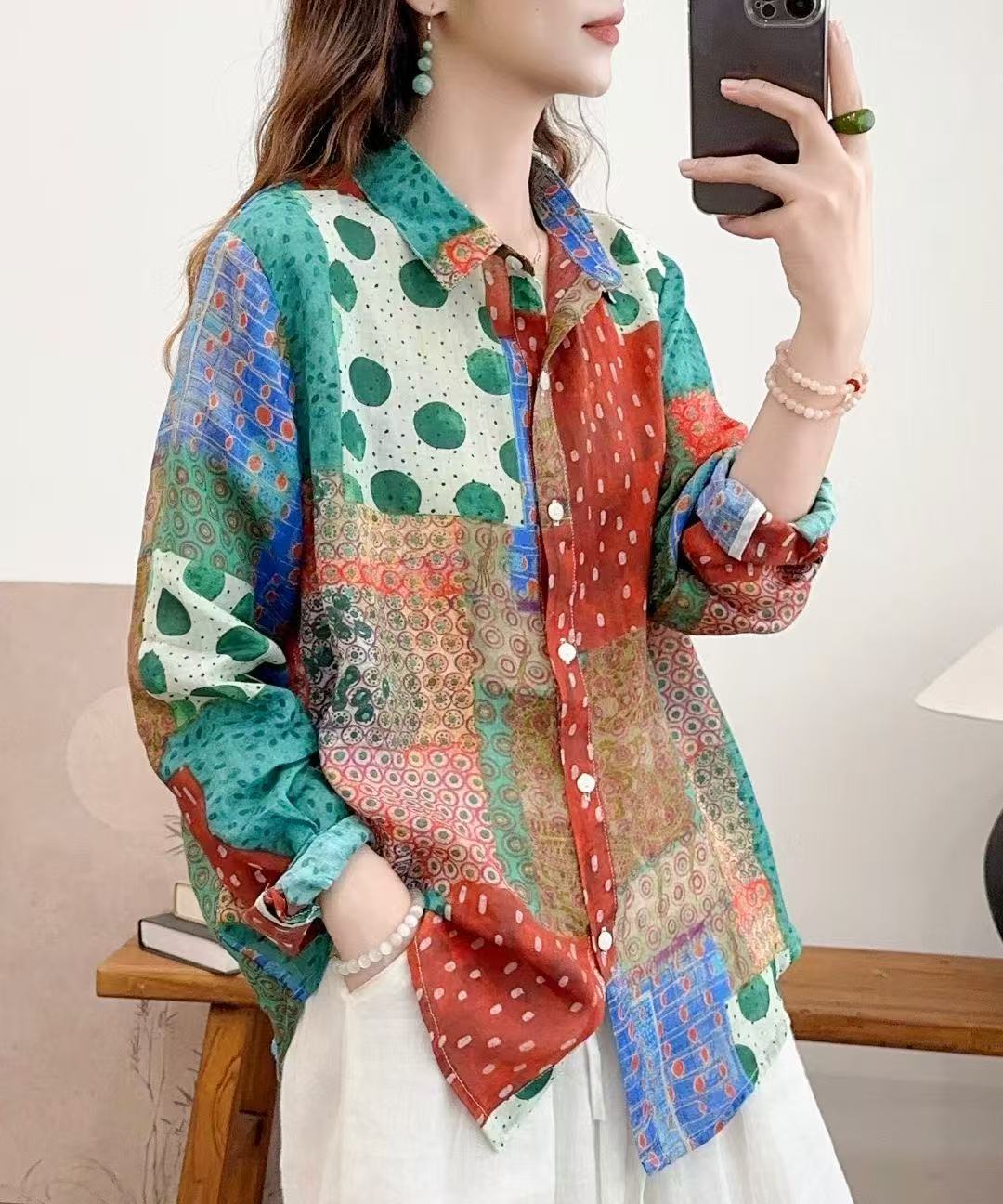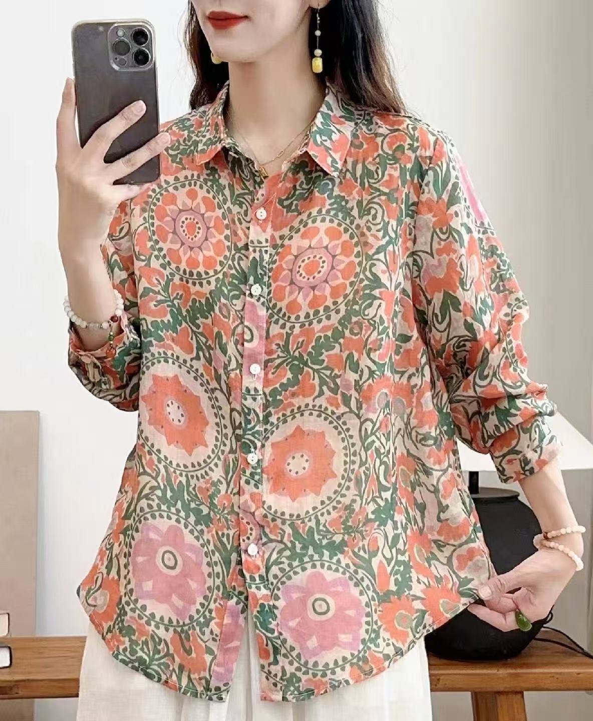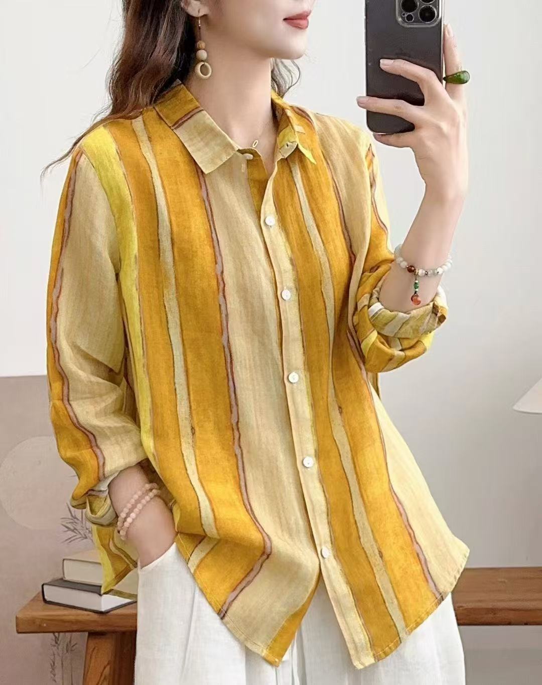 디지털 인쇄 순수 라미 셔츠 느슨한 긴 소매 봄 및 가을 새로운 레트로 예술적 캐주얼 올 매치 싱글 브레스트 셔츠