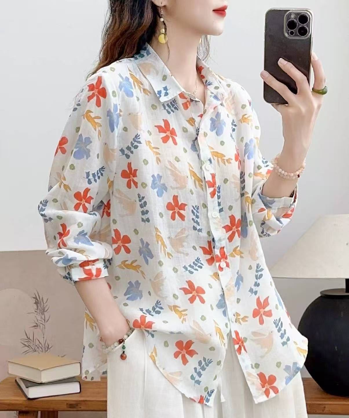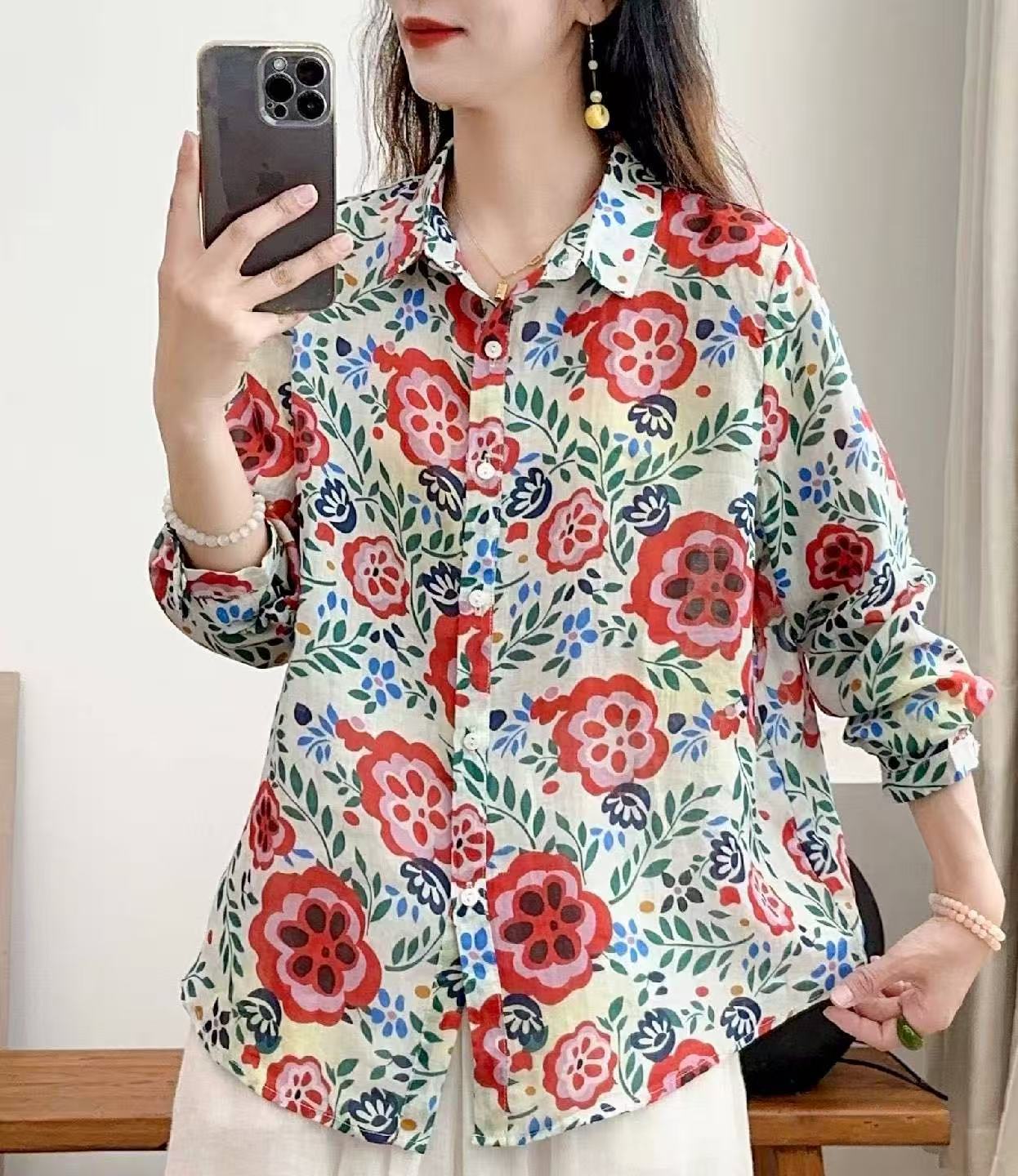 디지털 인쇄 순수 라미 셔츠 느슨한 긴 소매 봄 및 가을 새로운 레트로 예술적 캐주얼 올 매치 싱글 브레스트 셔츠스토어 가기