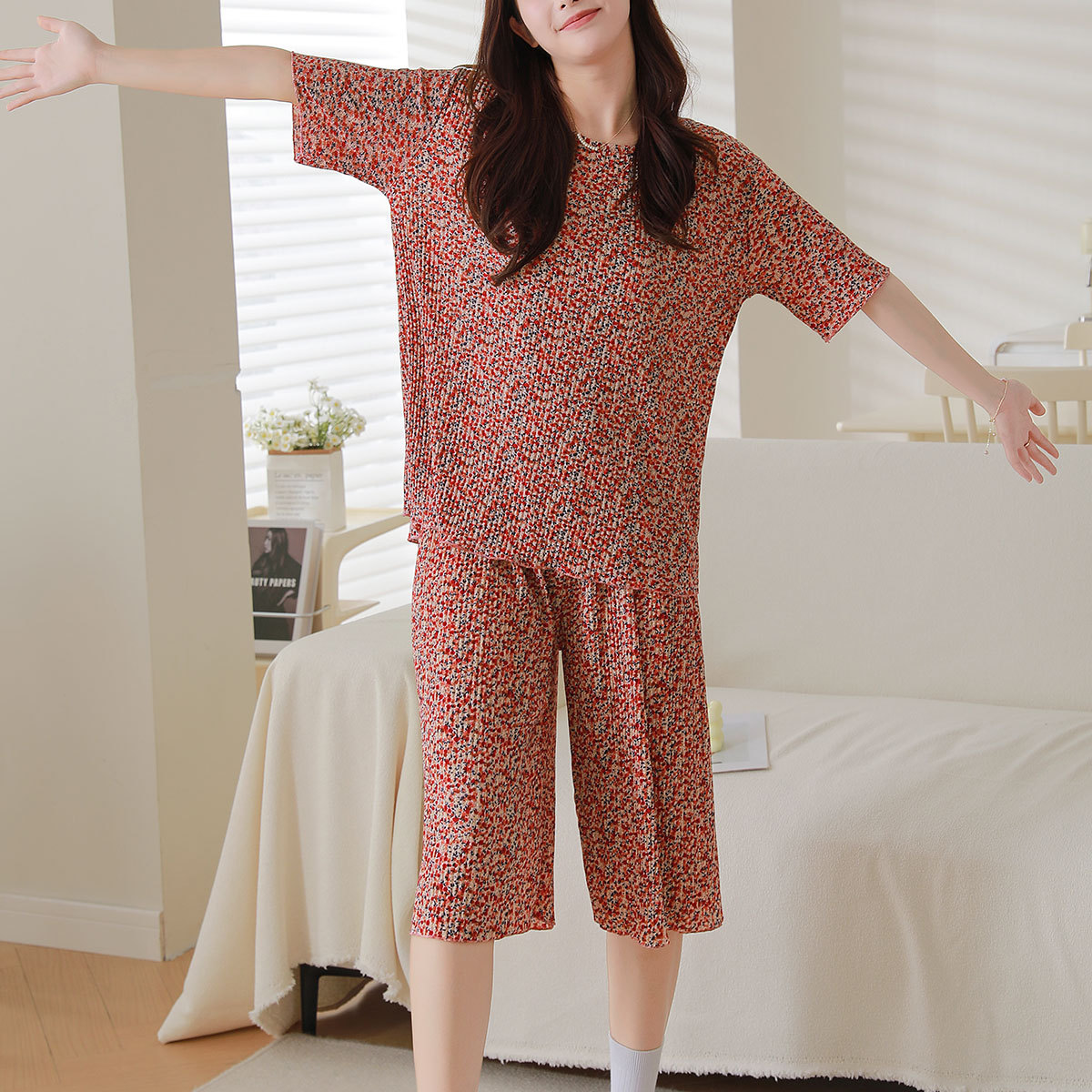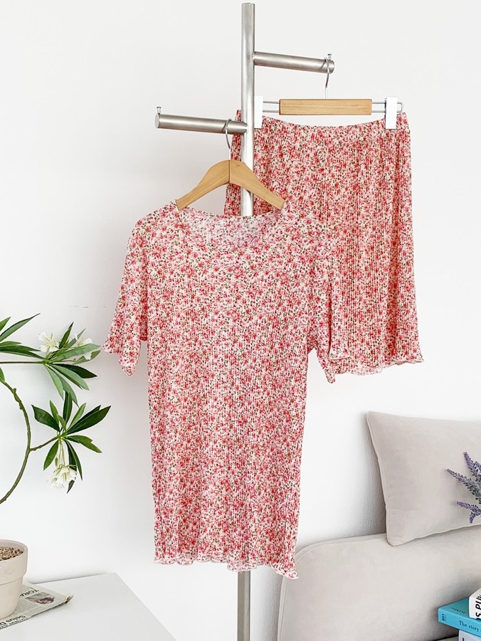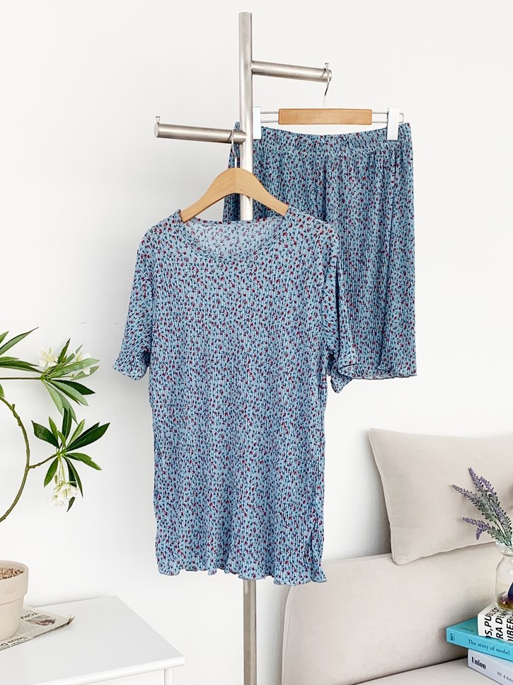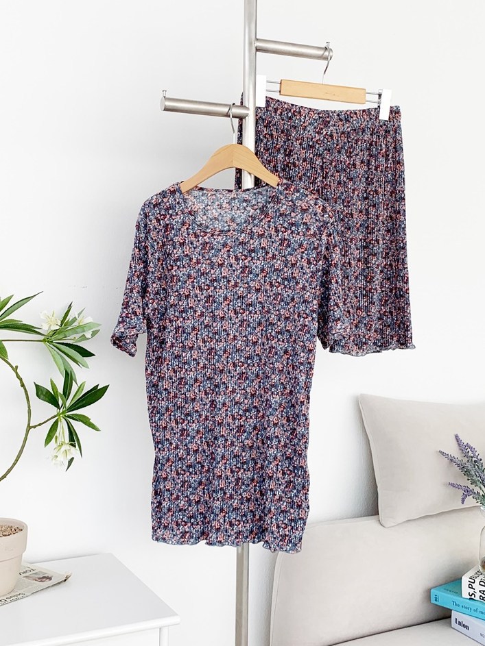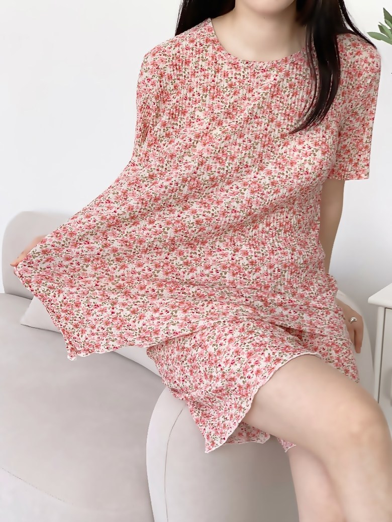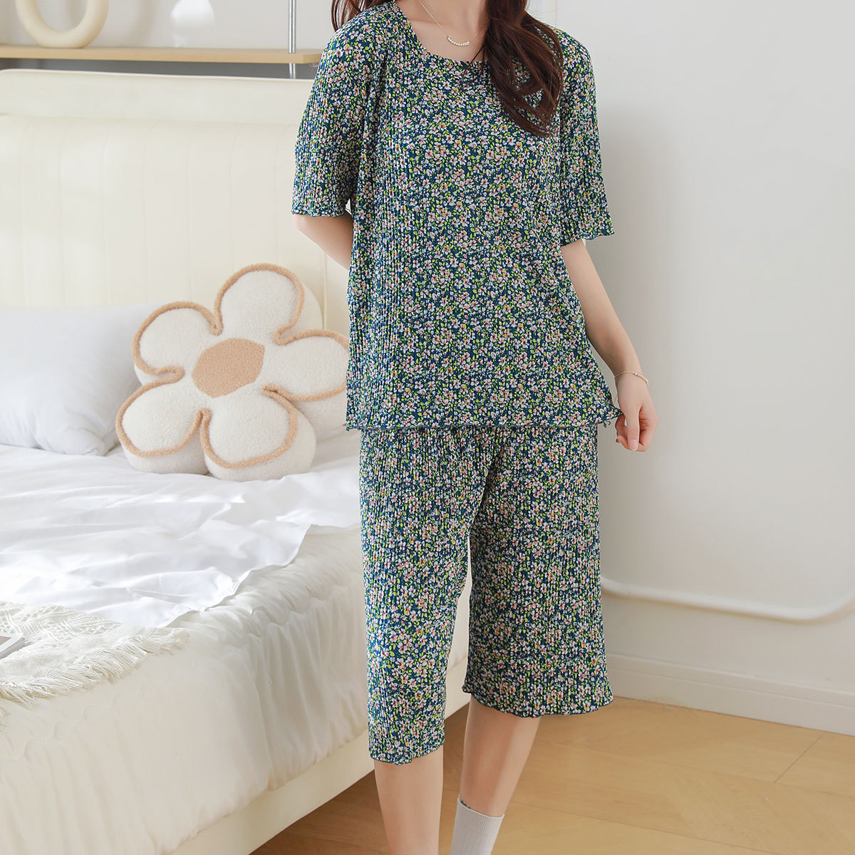 여름 신작 라운드 넥 반팔 탑, 5부 팬츠, 루즈하고 편안한 꽃무늬 주름진 시원한 파자마 세트, 여성이 밖에서 입는다스토어 가기