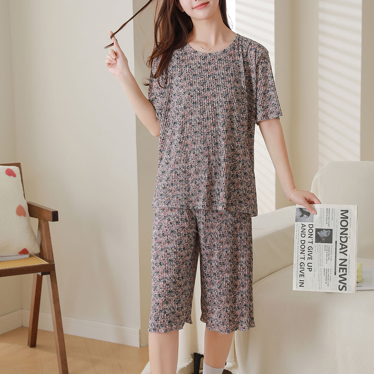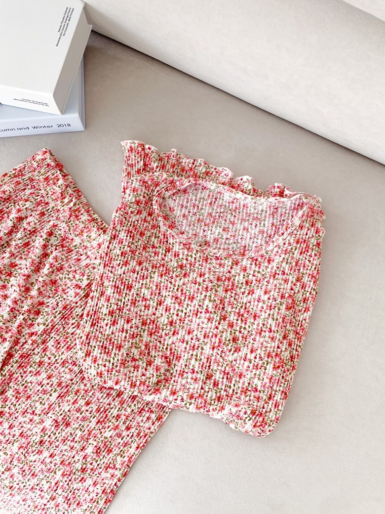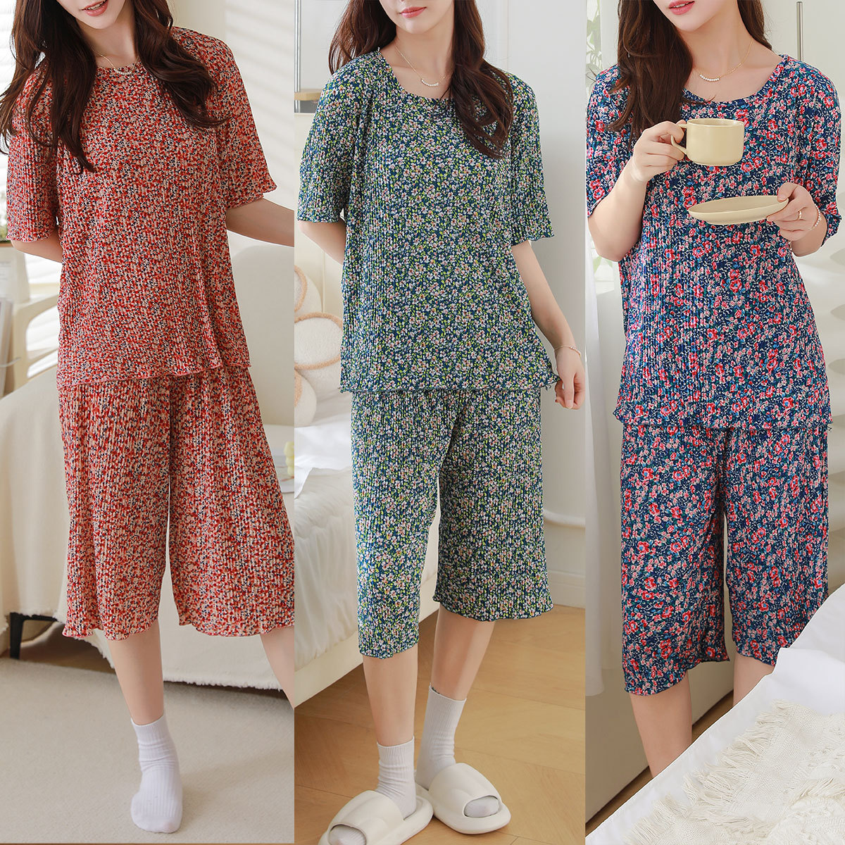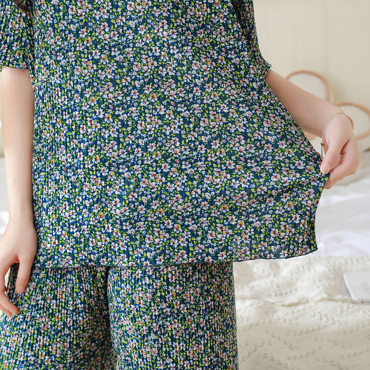 여름 신작 라운드 넥 반팔 탑, 5부 팬츠, 루즈하고 편안한 꽃무늬 주름진 시원한 파자마 세트, 여성이 밖에서 입는다스토어 가기