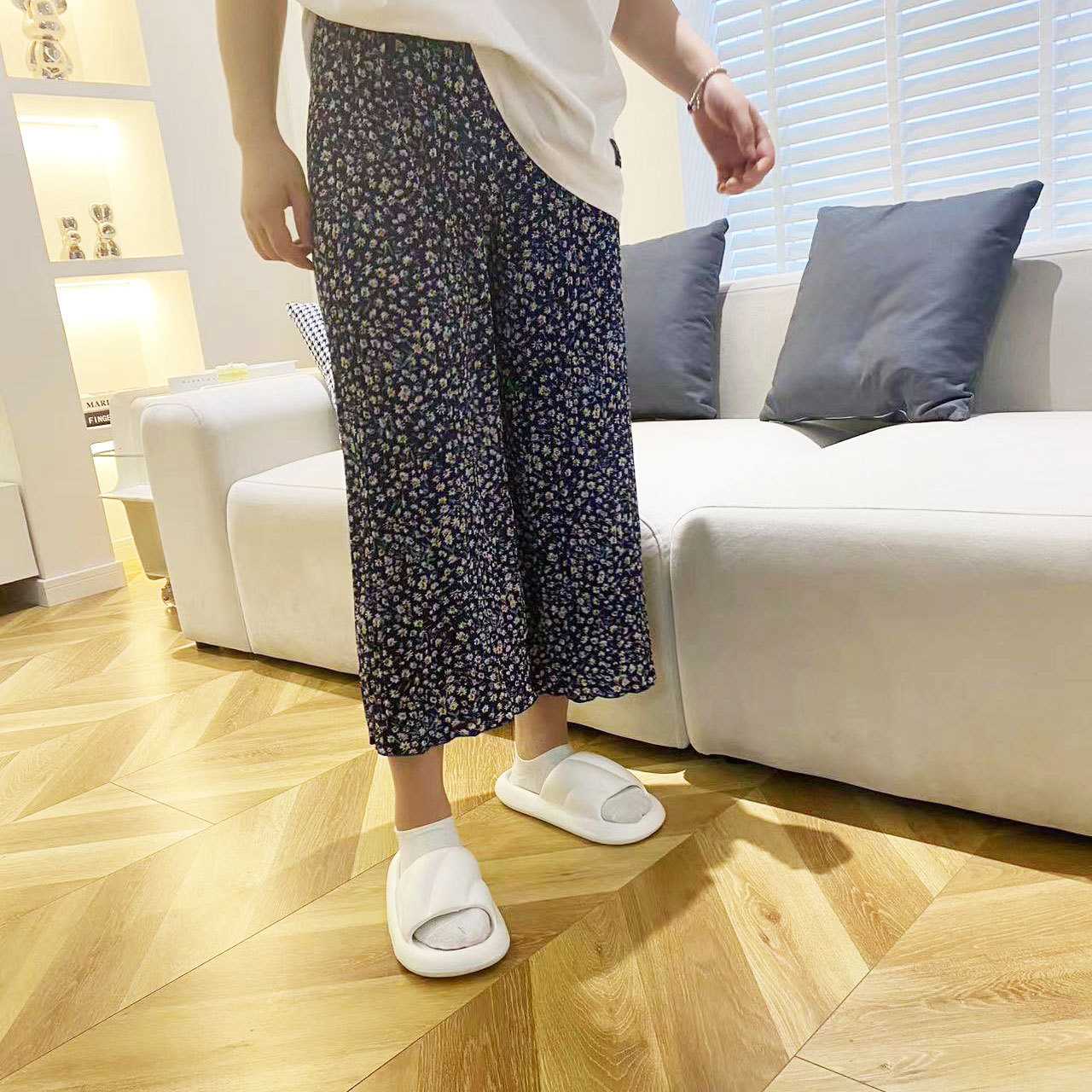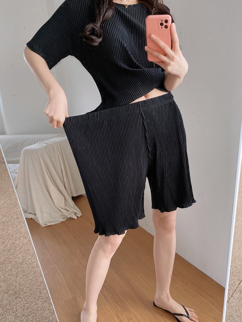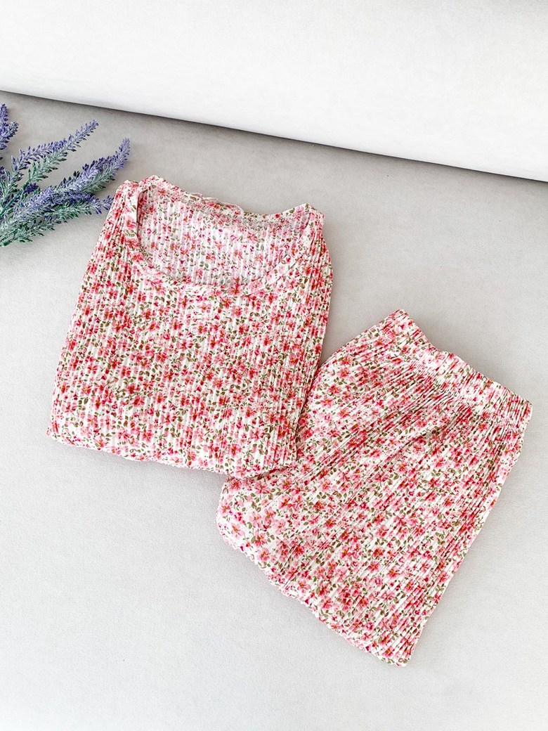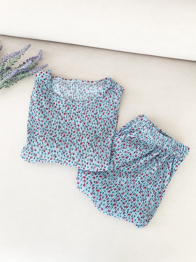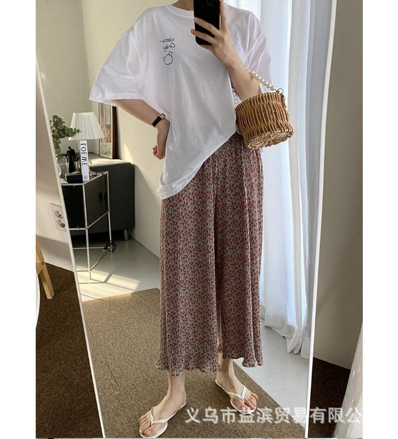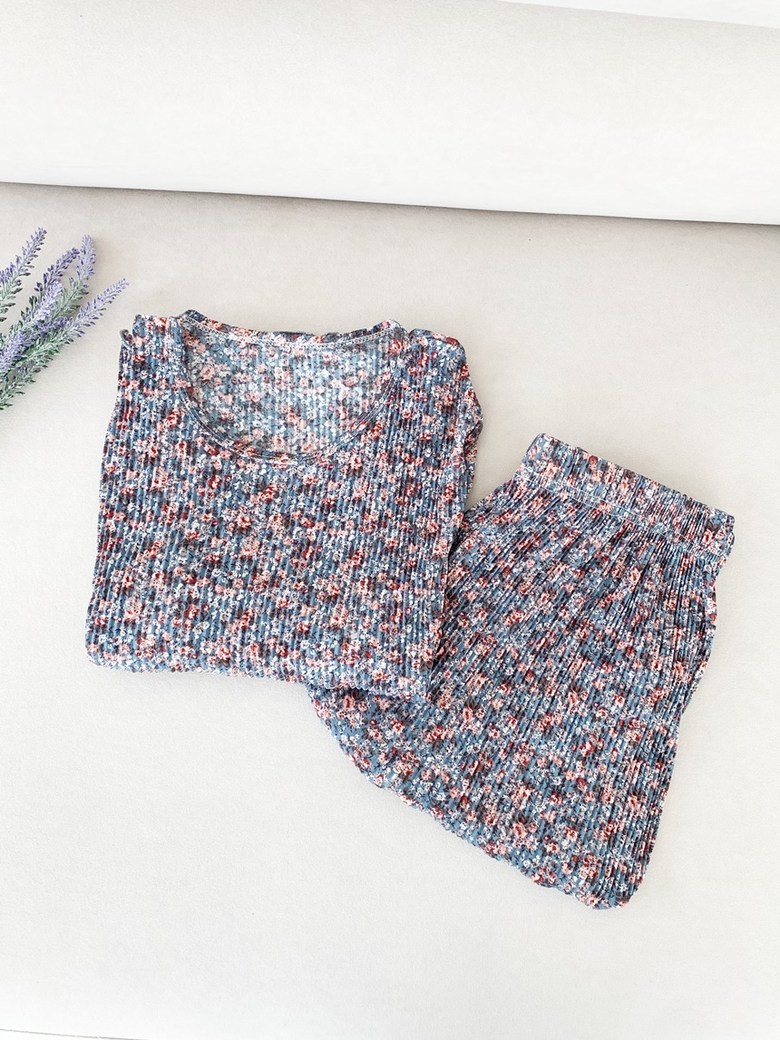 여름 신작 라운드 넥 반팔 탑, 5부 팬츠, 루즈하고 편안한 꽃무늬 주름진 시원한 파자마 세트, 여성이 밖에서 입는다스토어 가기