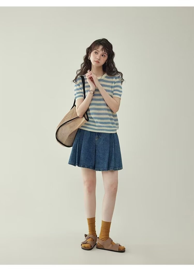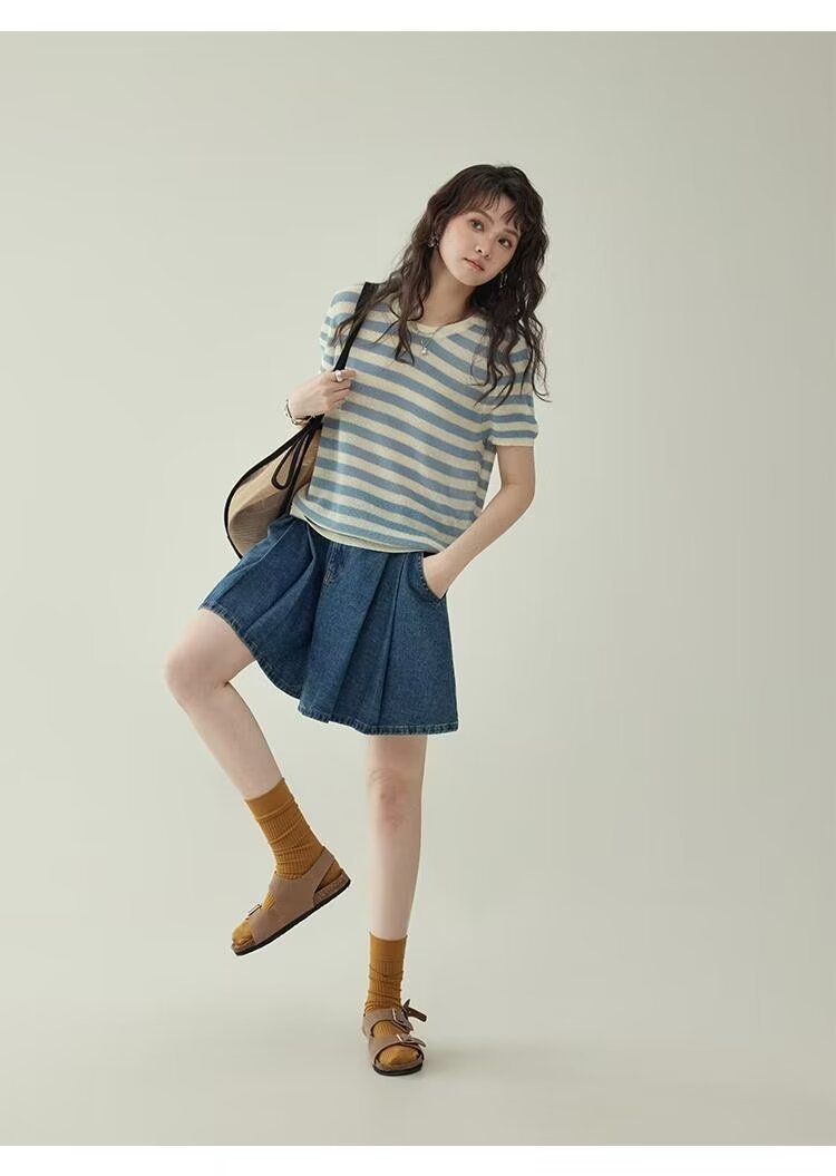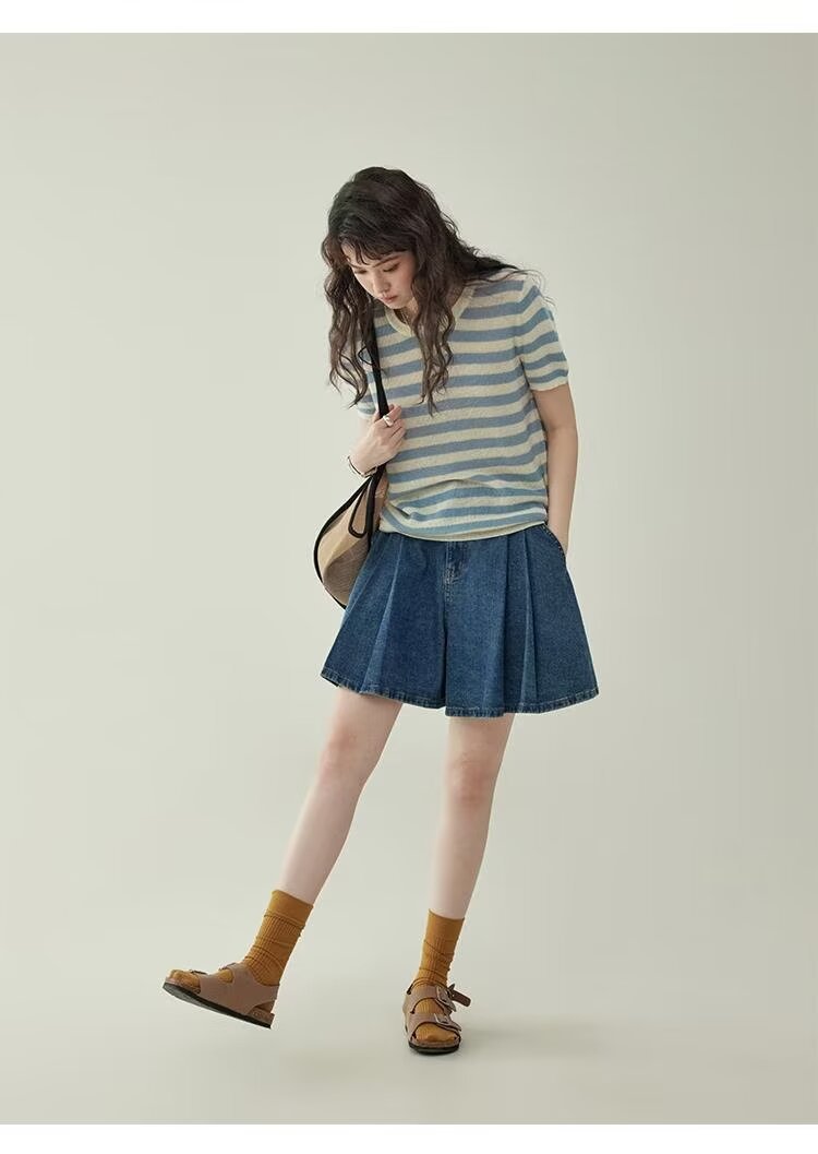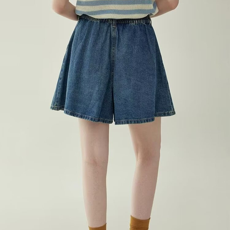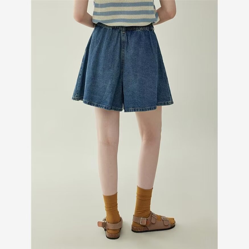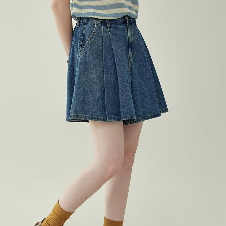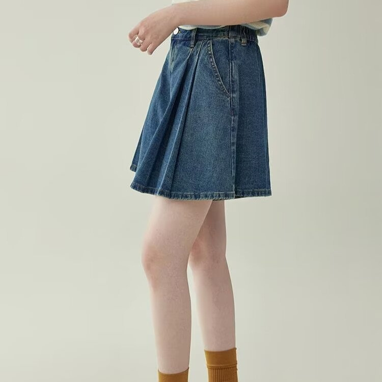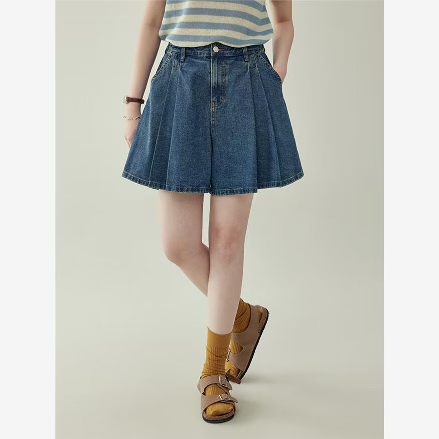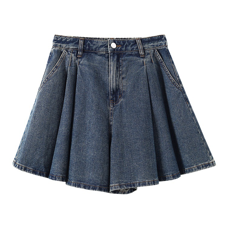 2025 여름 새로운 레트로 하이 웨스트 플리츠 데님 스커트 바지 여성용 블루 a 라인 와이드 레그 팬츠 신축성있는 허리스토어 가기