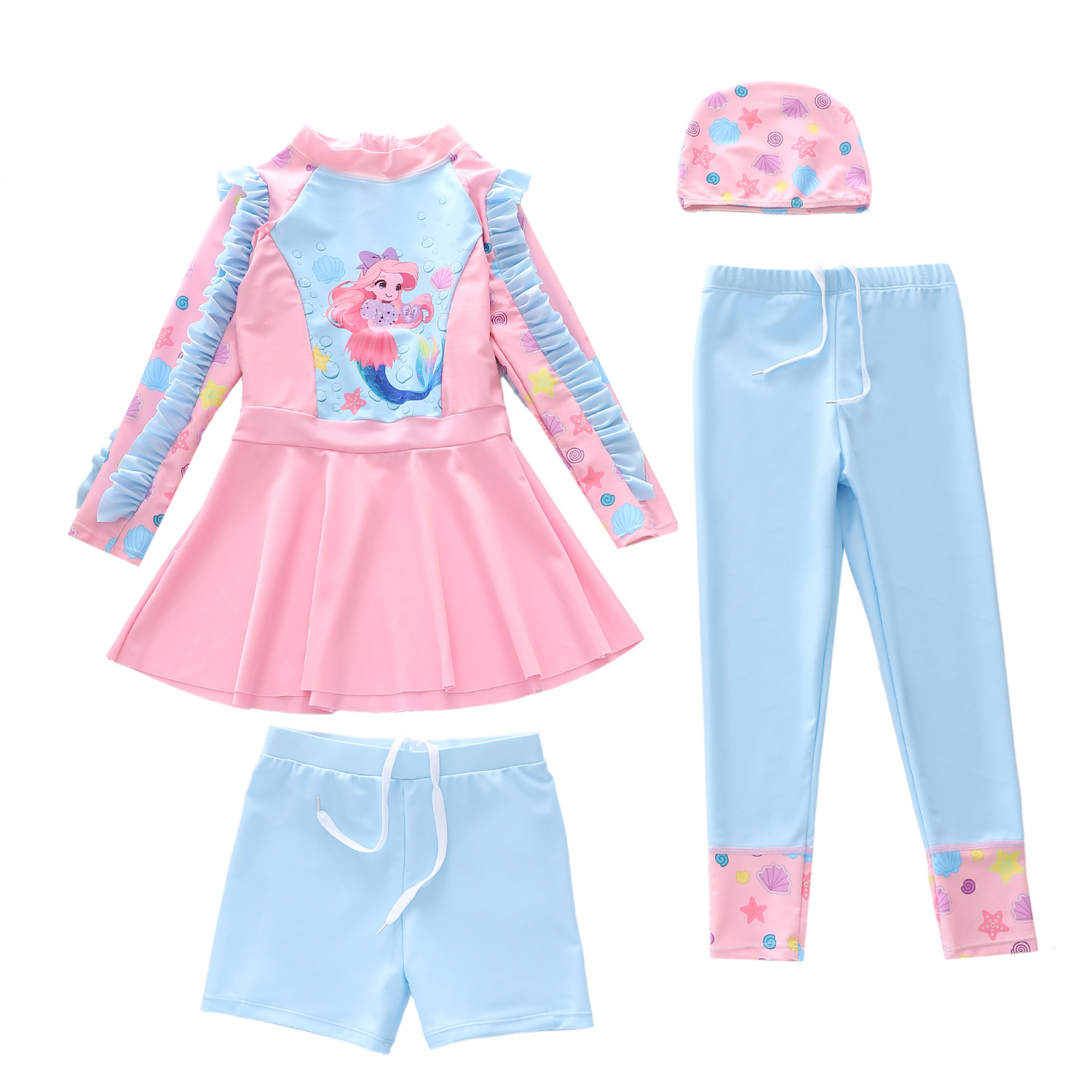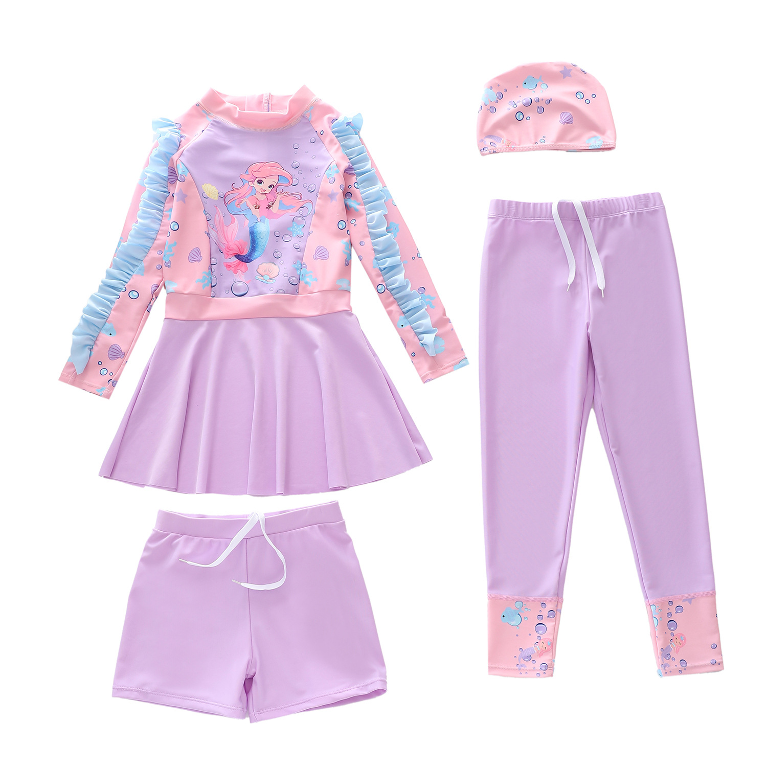 새로운 아동용 수영복, 여아용 수영복 세트, 소형, 중형, 대형 아동용 여아용 분리형 긴팔 4종 세트, 자외선 차단 수영복