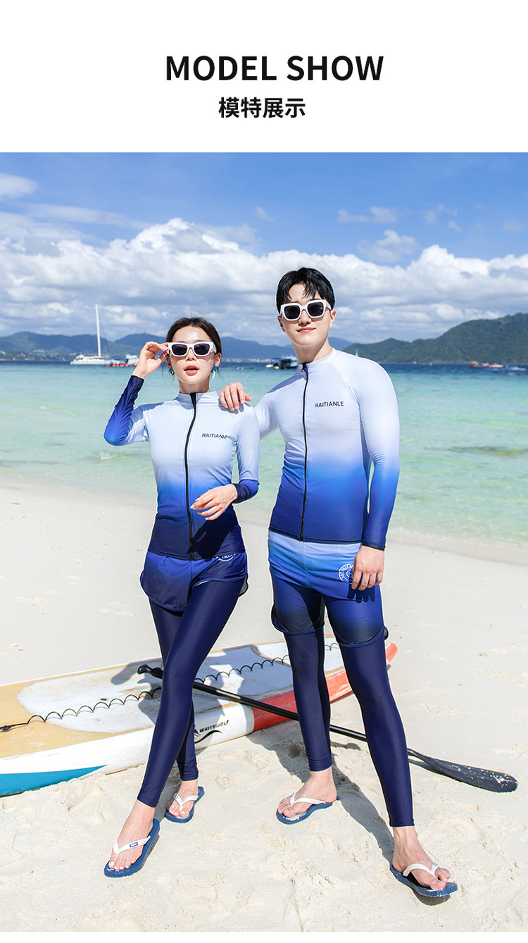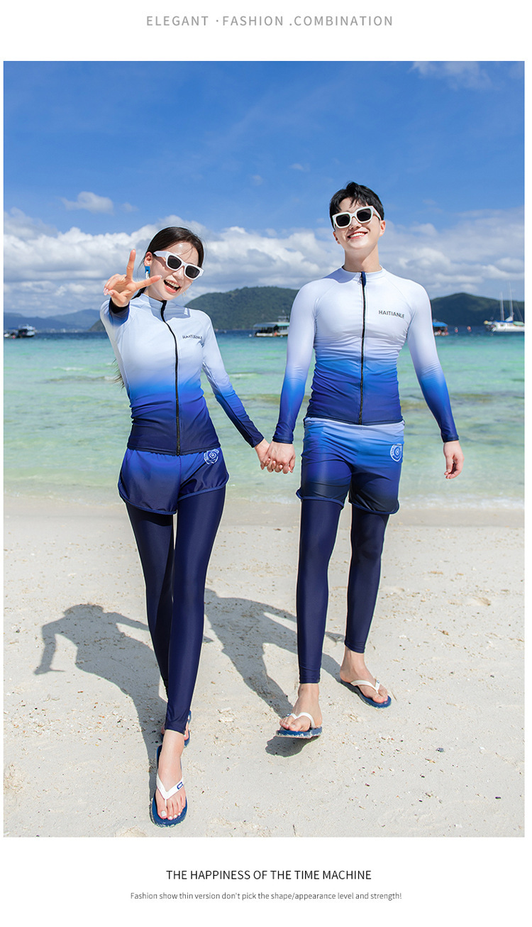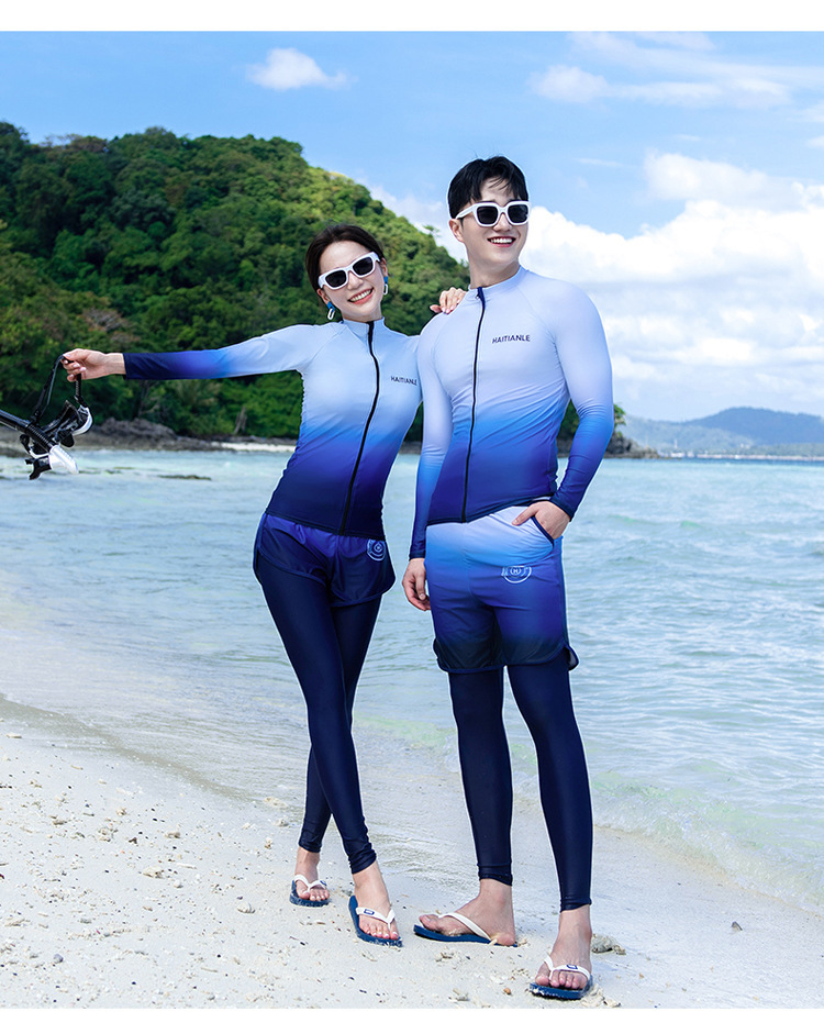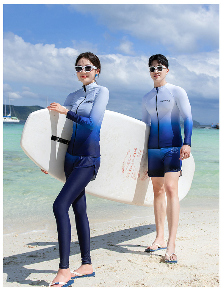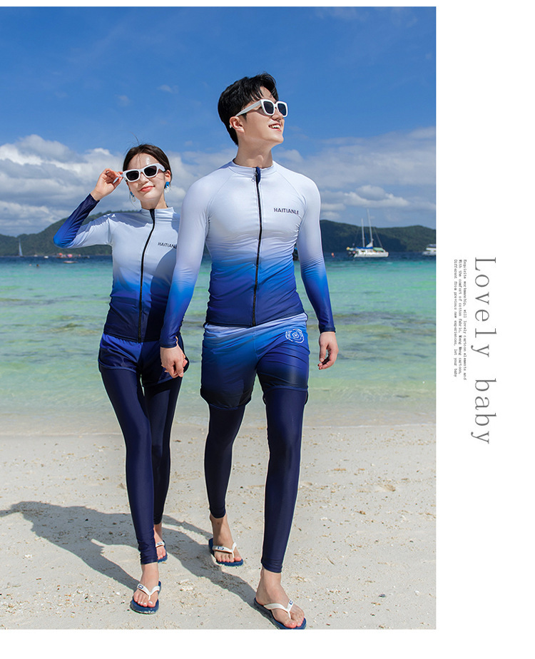 情侣款游泳衣 分体长袖长裤套装渐变遮肚显瘦保守潜水服冲浪沙滩