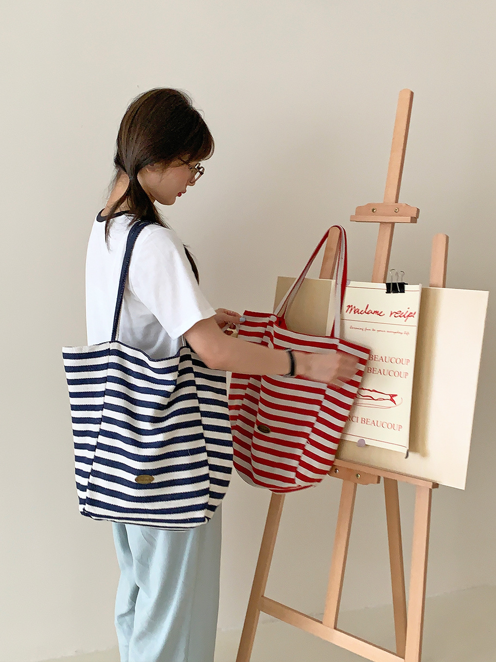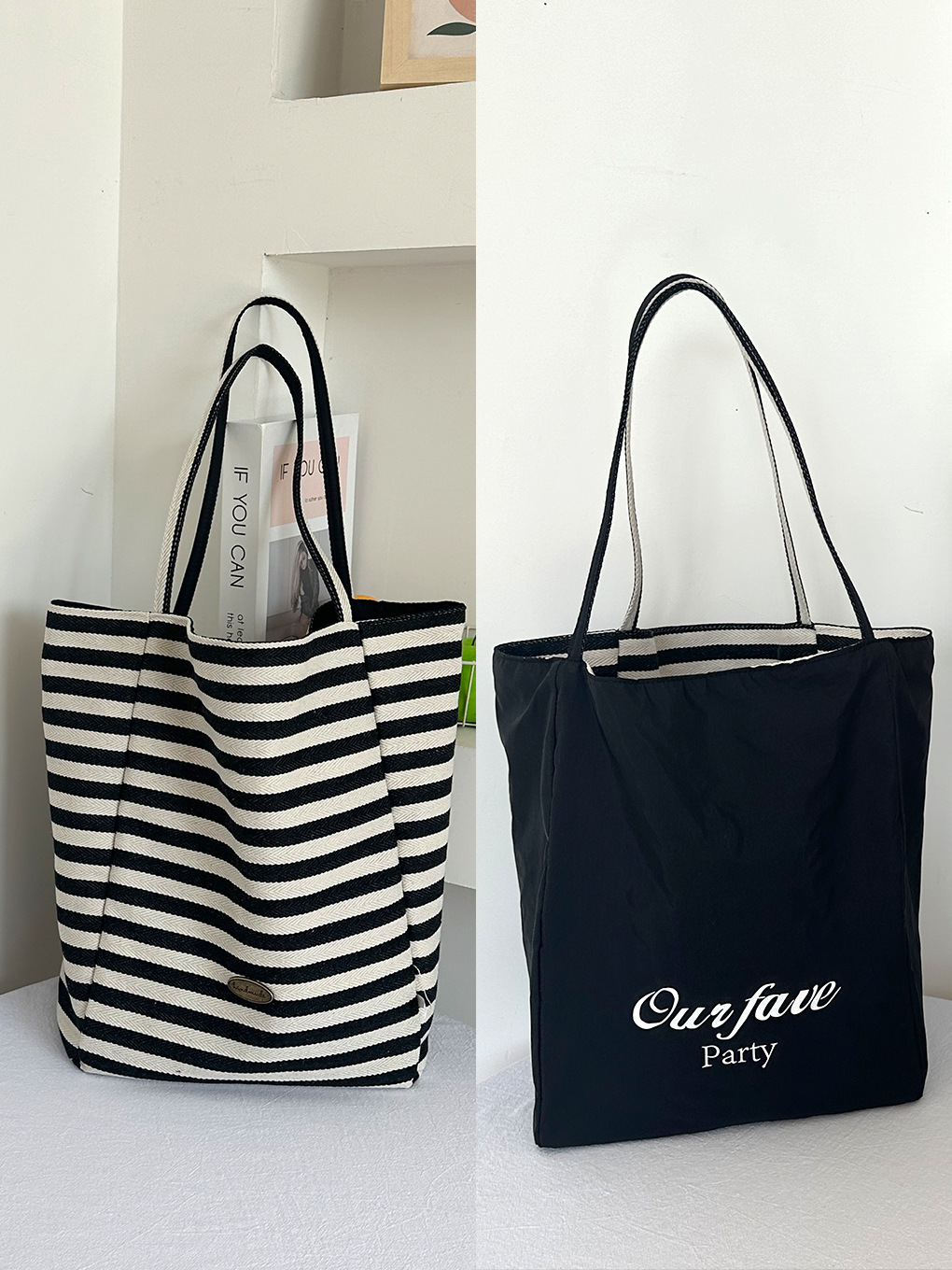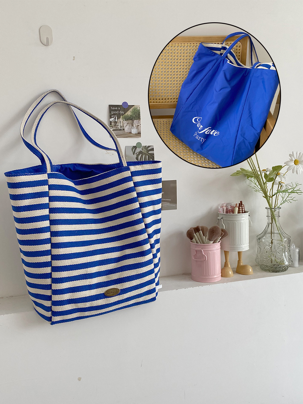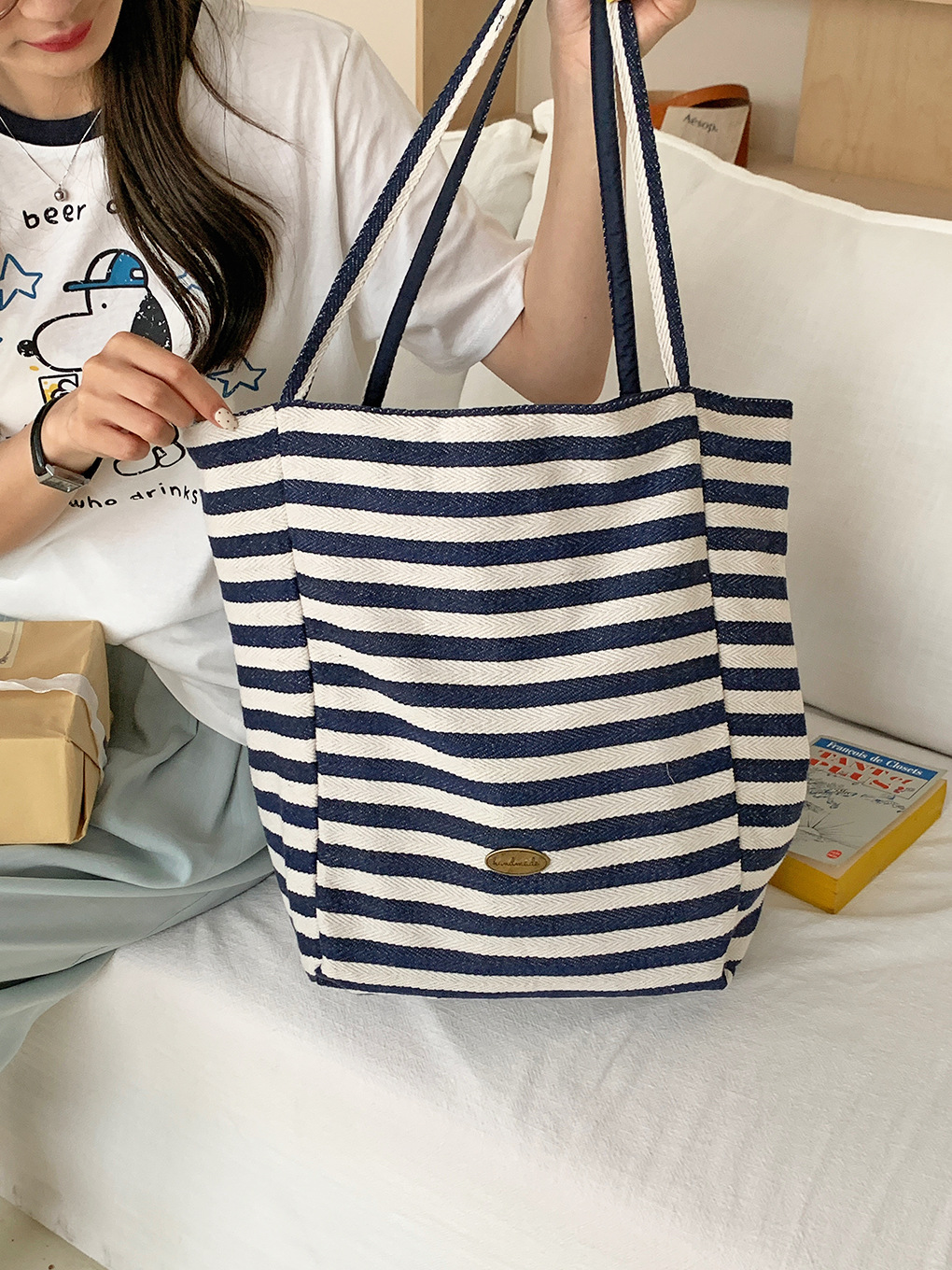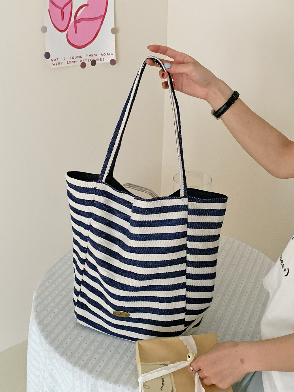 [두꺼운 재고] 줄무늬 캔버스 가방 2024 새로운 한국 스타일 인 토트 캐주얼 가방 어깨 가방스토어 가기