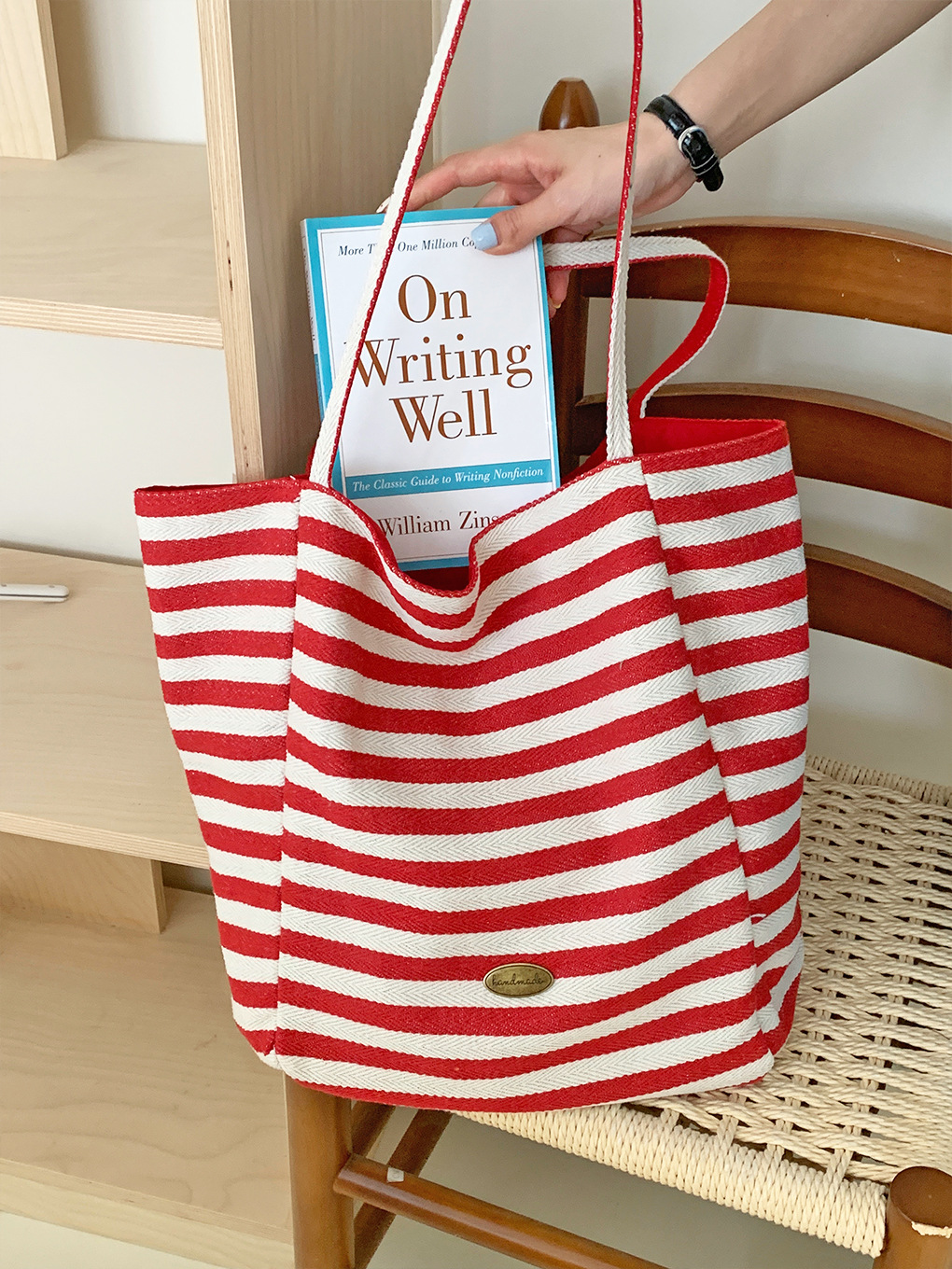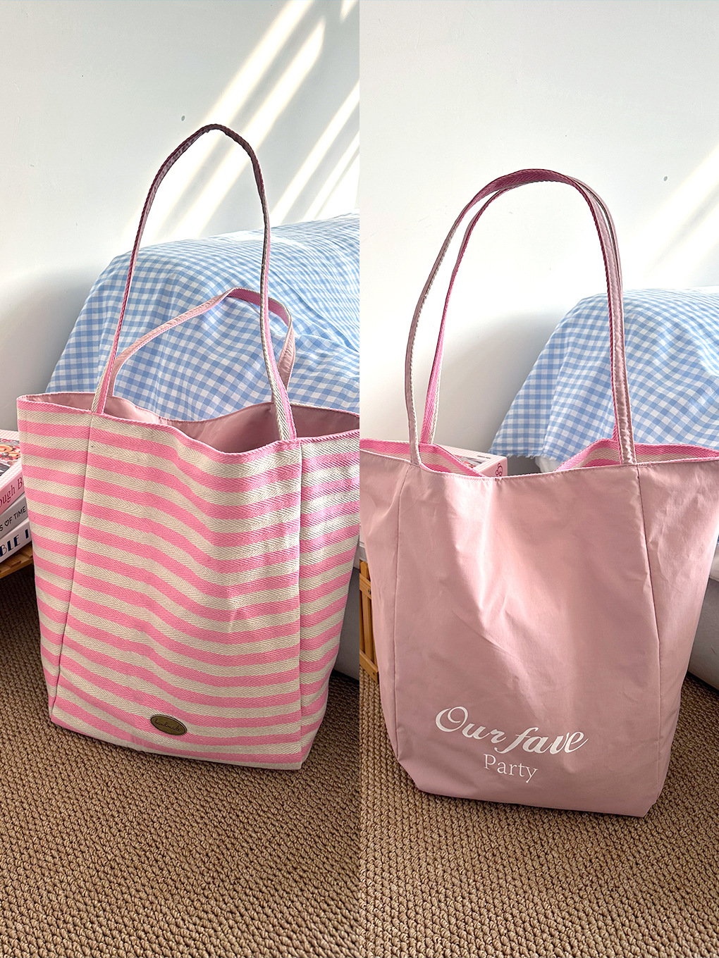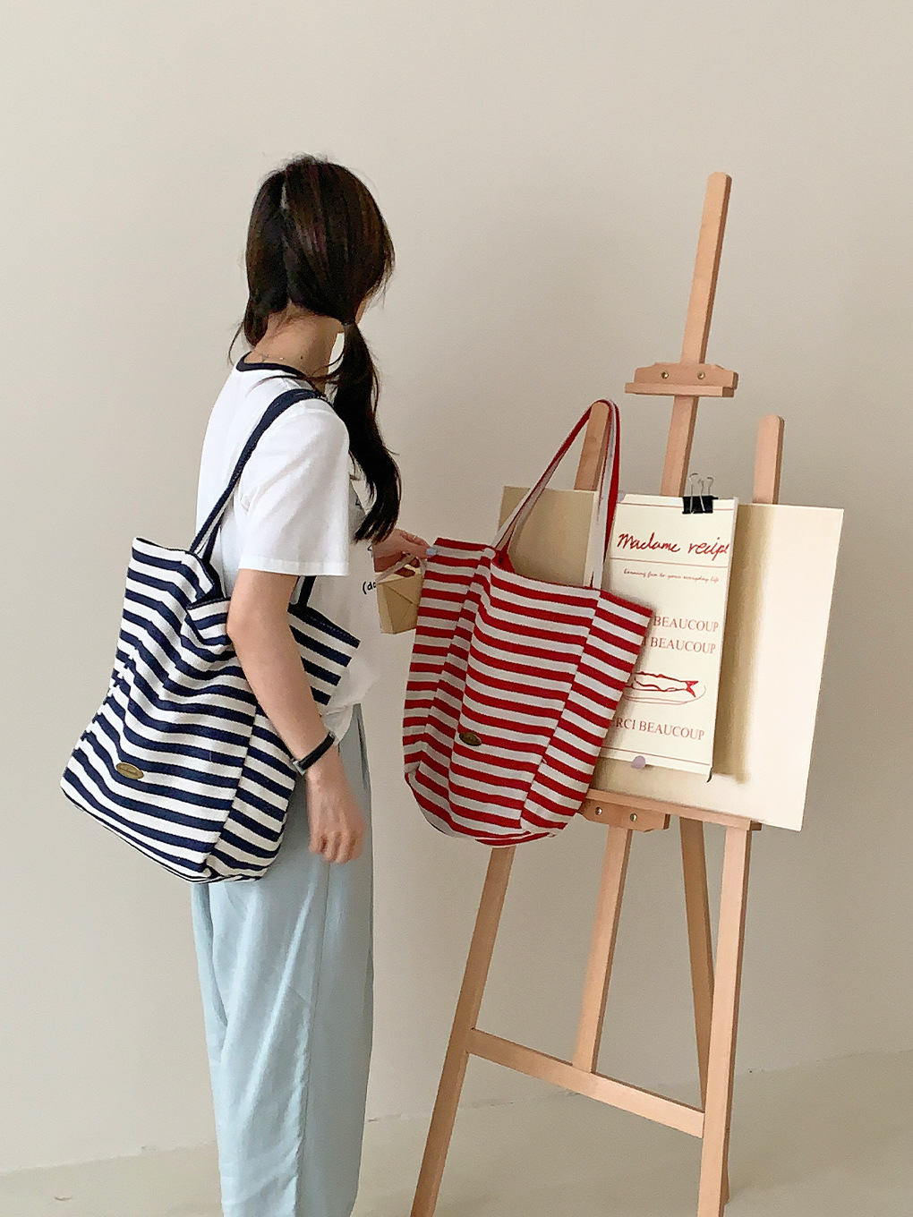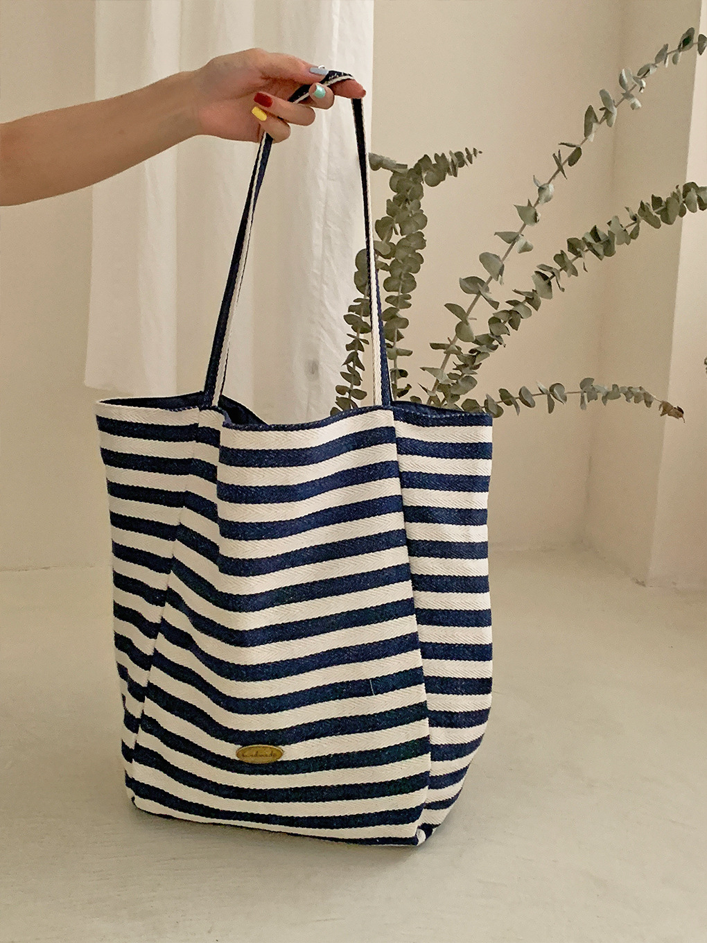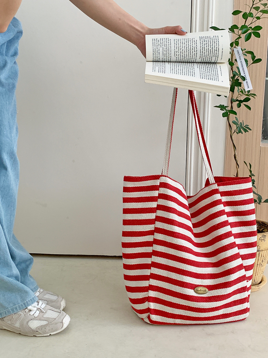 [두꺼운 재고] 줄무늬 캔버스 가방 2024 새로운 한국 스타일 인 토트 캐주얼 가방 어깨 가방스토어 가기