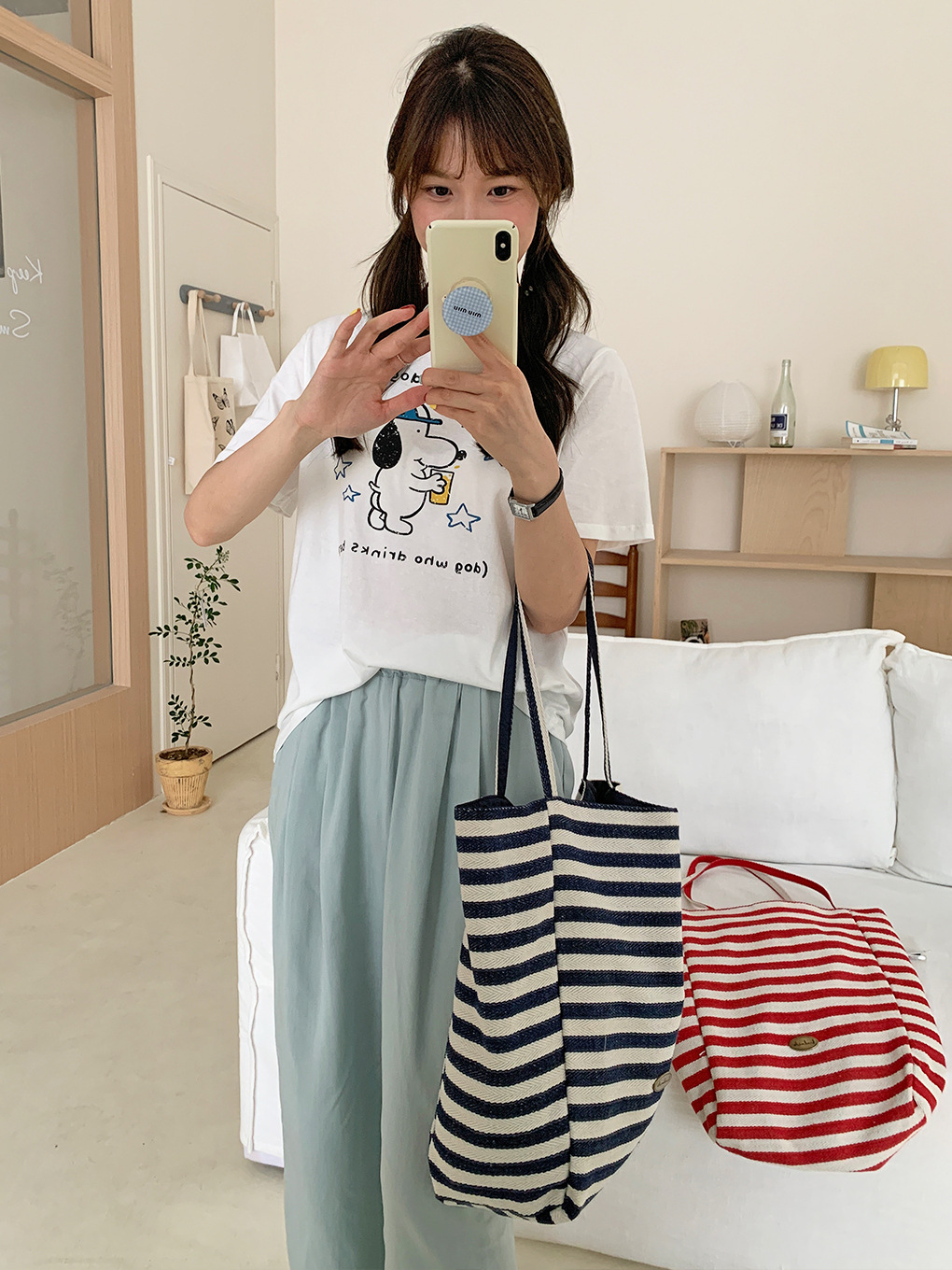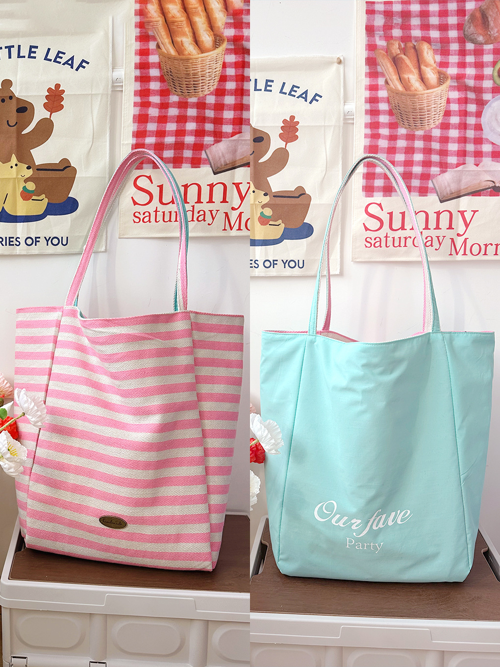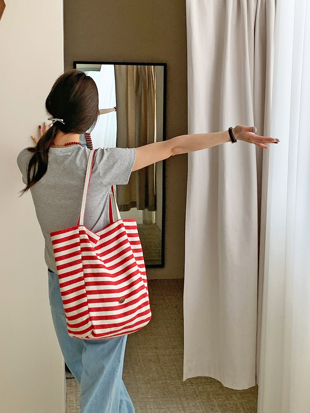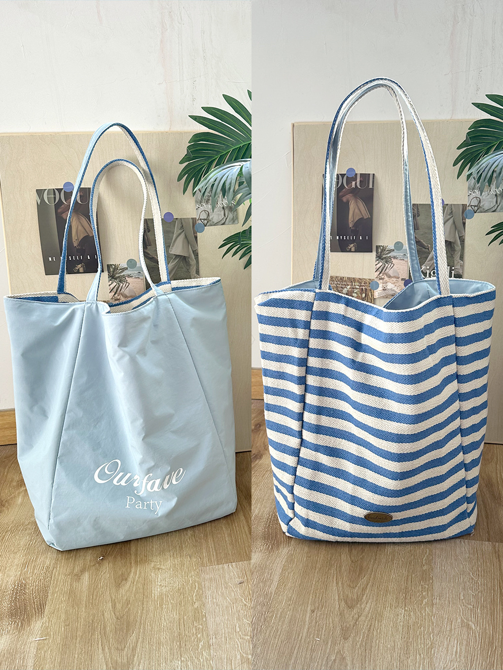 [두꺼운 재고] 줄무늬 캔버스 가방 2024 새로운 한국 스타일 인 토트 캐주얼 가방 어깨 가방스토어 가기
