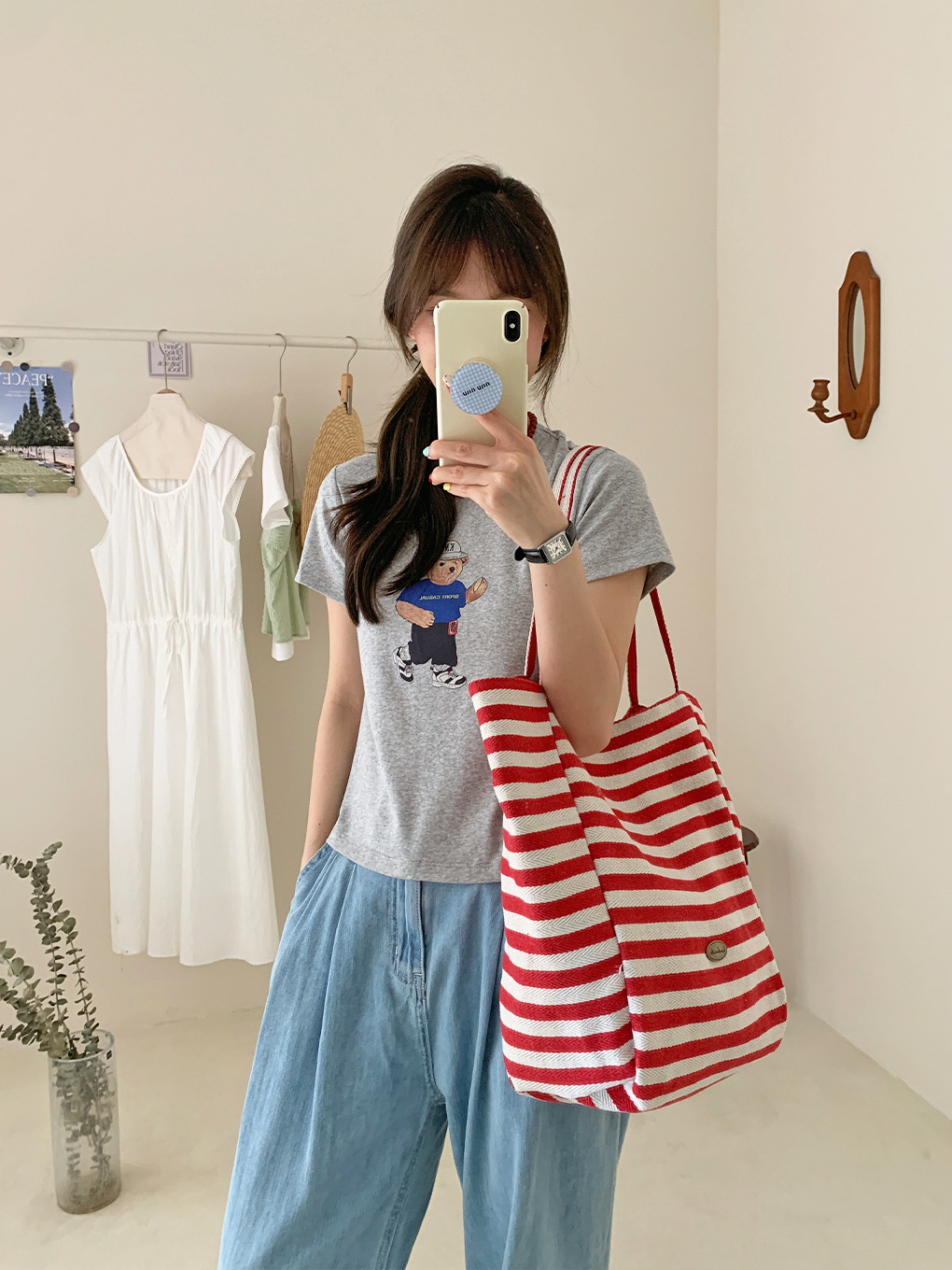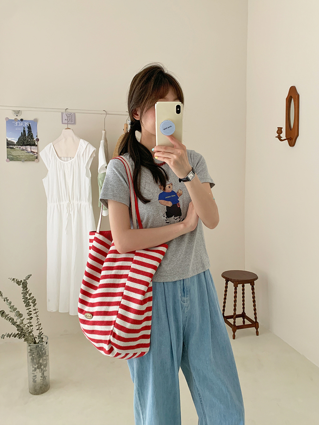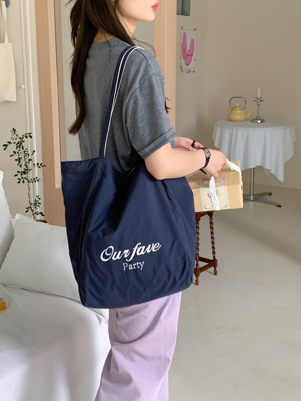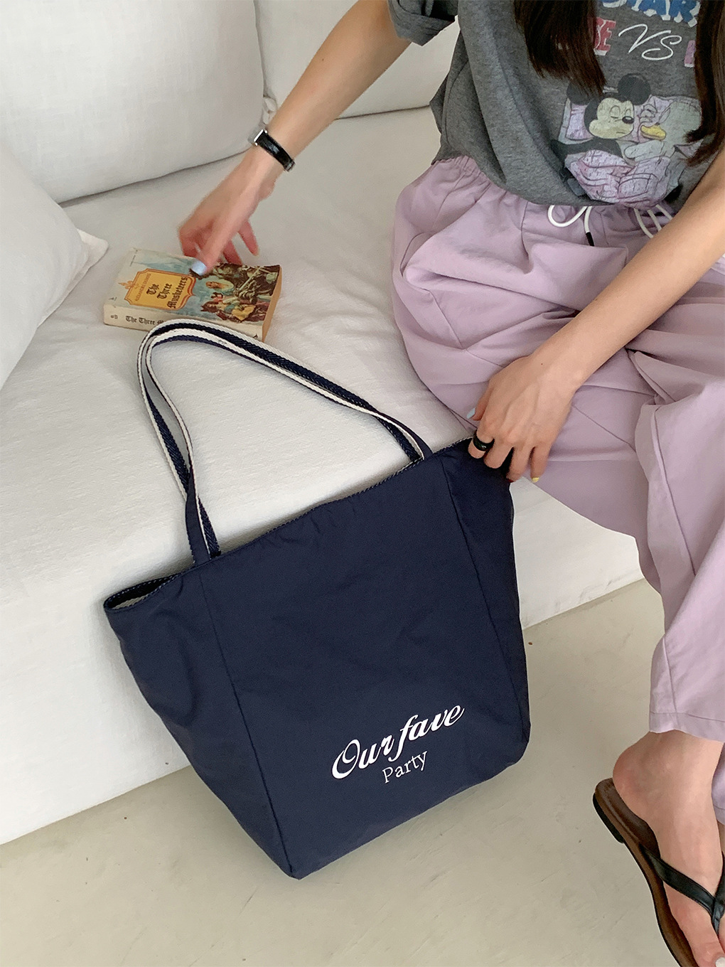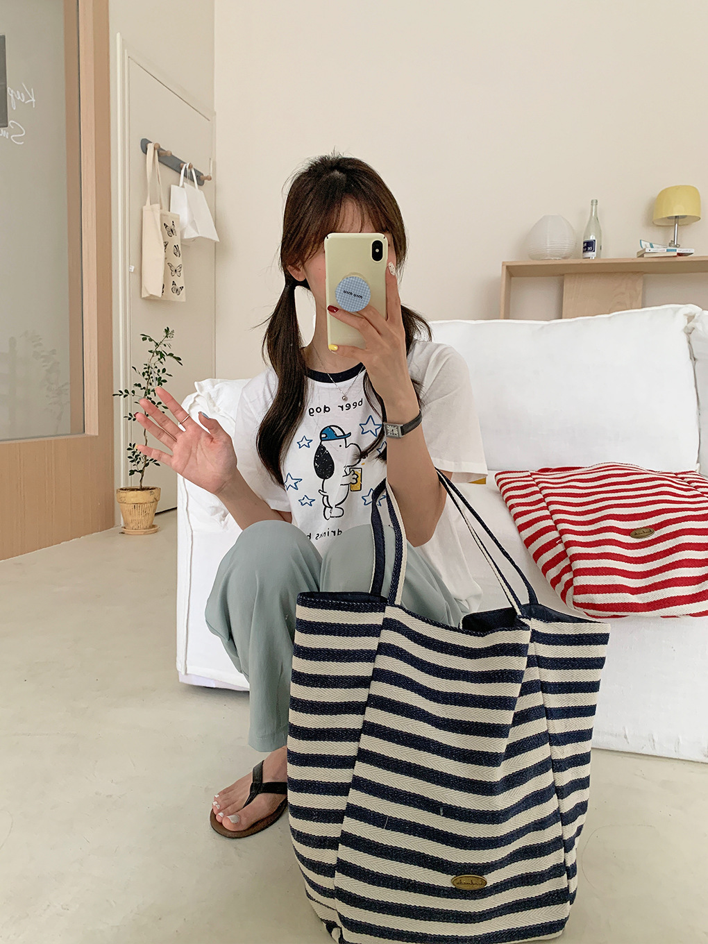[두꺼운 재고] 줄무늬 캔버스 가방 2024 새로운 한국 스타일 인 토트 캐주얼 가방 어깨 가방스토어 가기