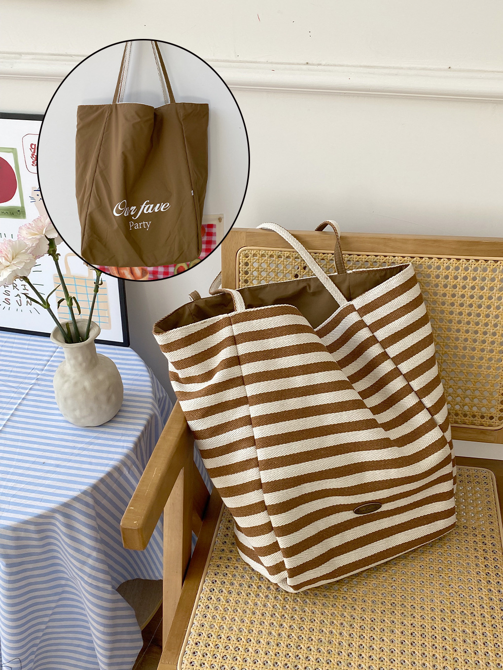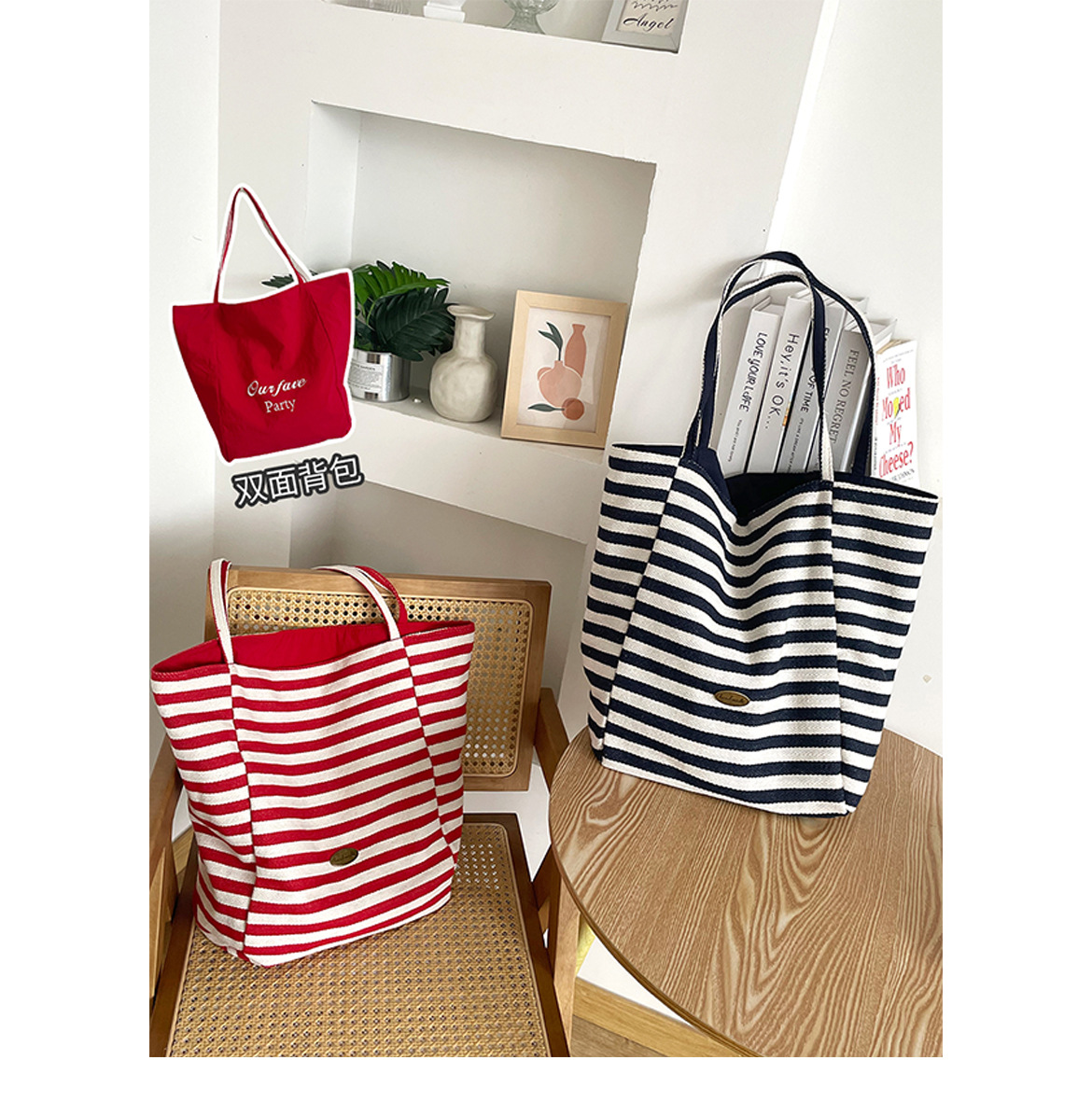 [두꺼운 재고] 줄무늬 캔버스 가방 2024 새로운 한국 스타일 인 토트 캐주얼 가방 어깨 가방