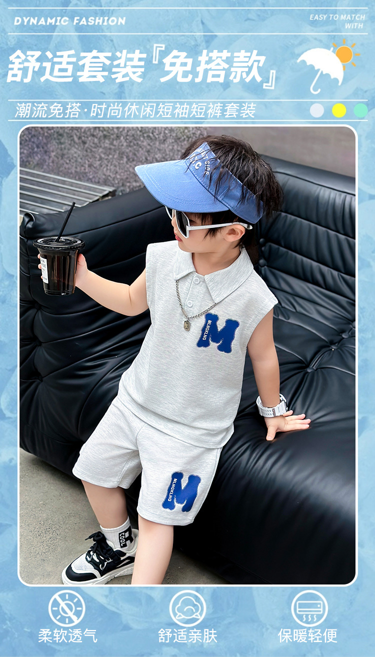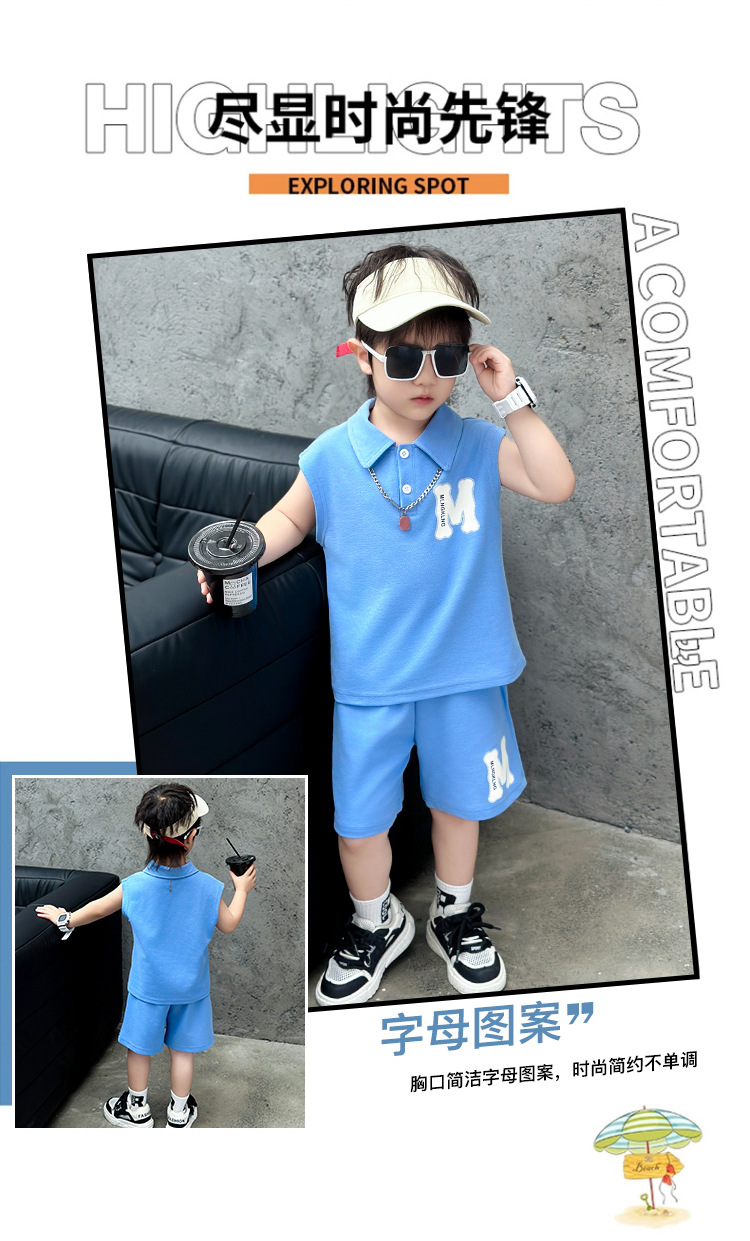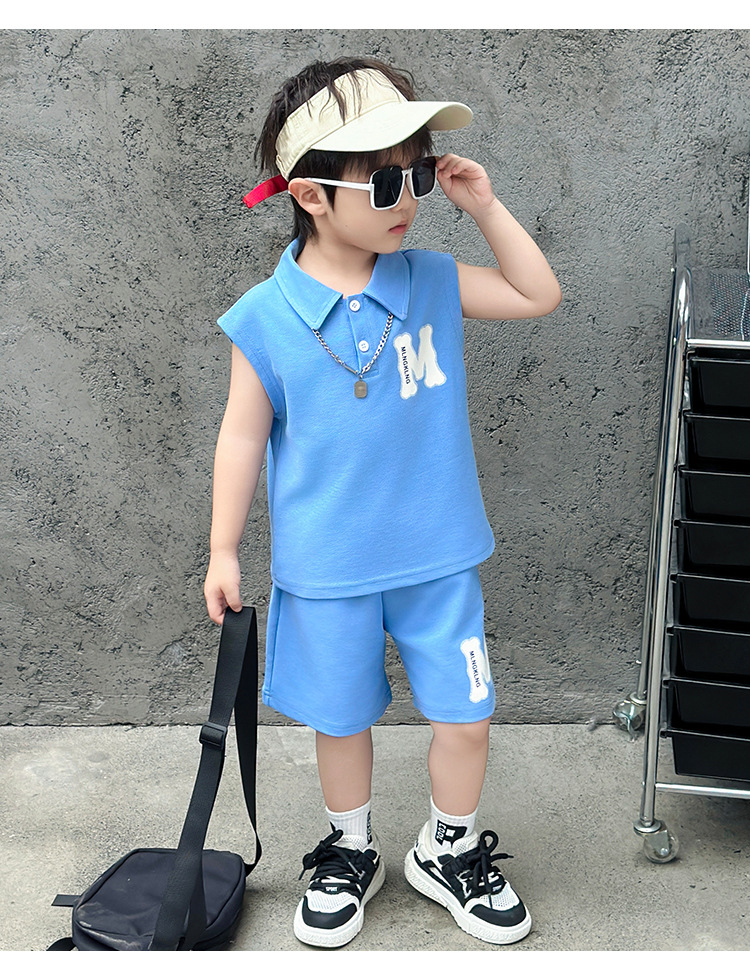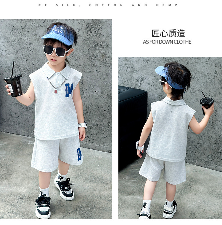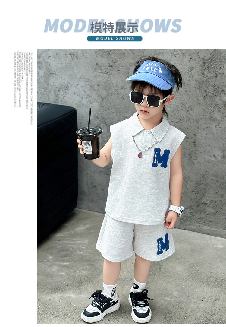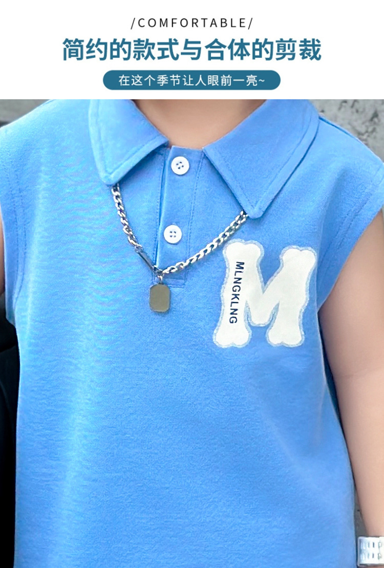 남학생 옷깃 민소매 조끼 세트 2024 년 여름 새 어린이 잘 생긴 캐주얼 투피스 아기 옷 트렌디스토어 가기