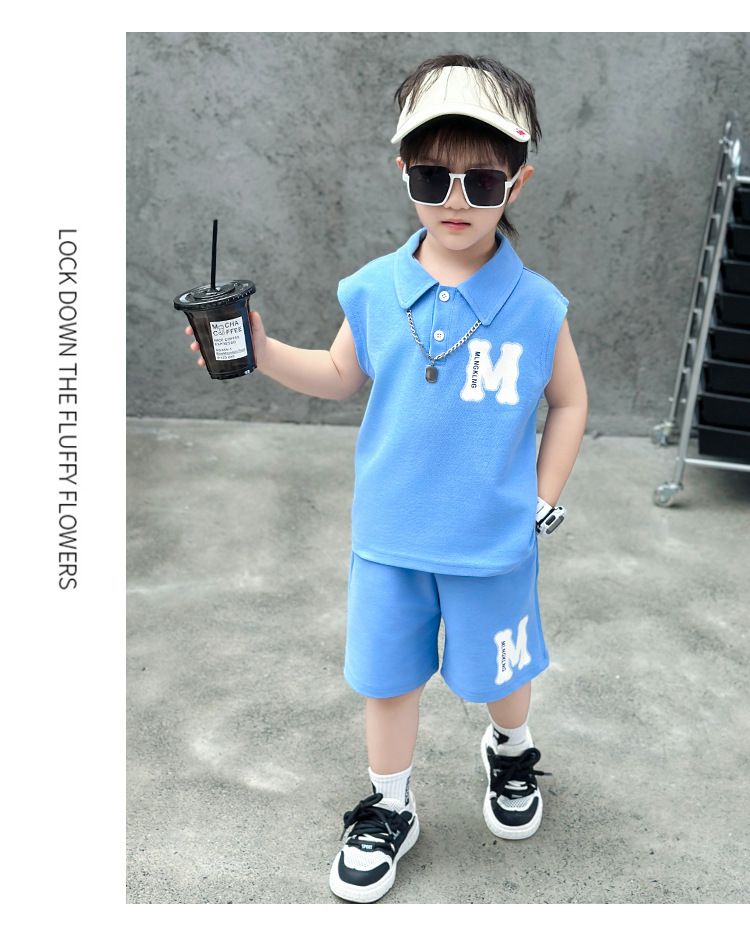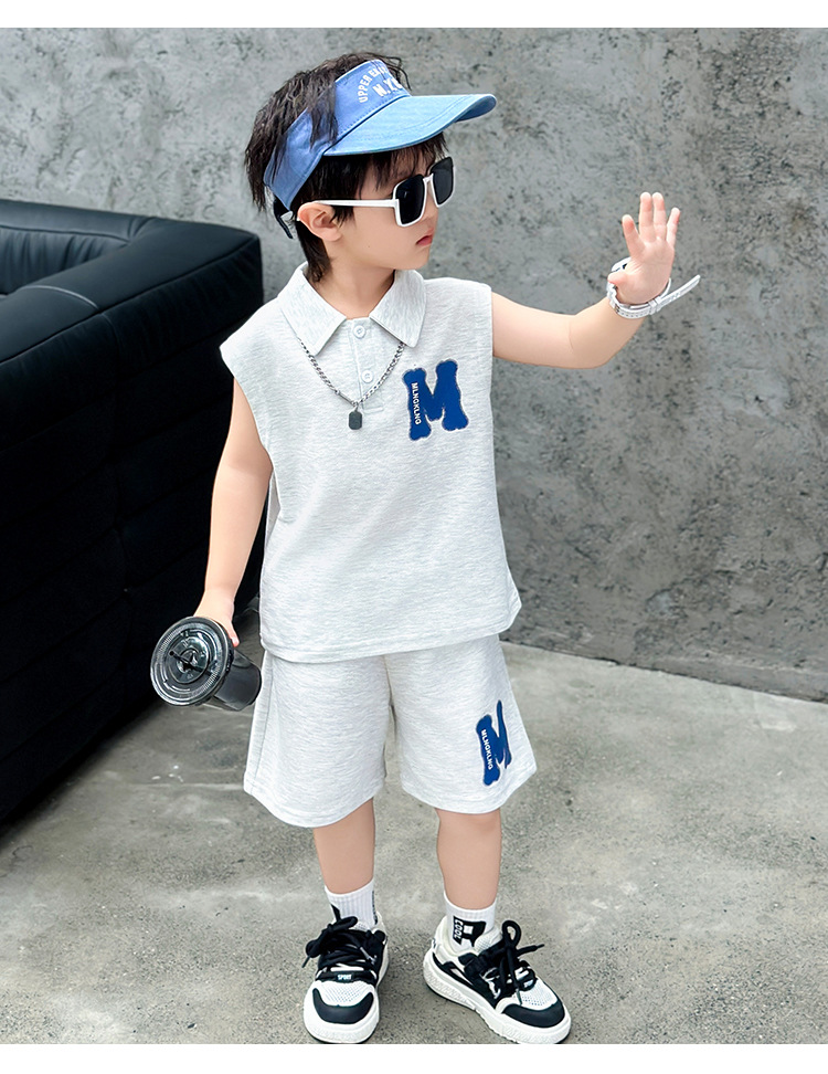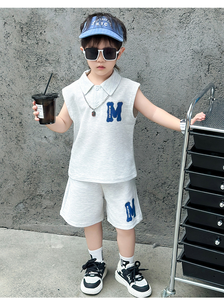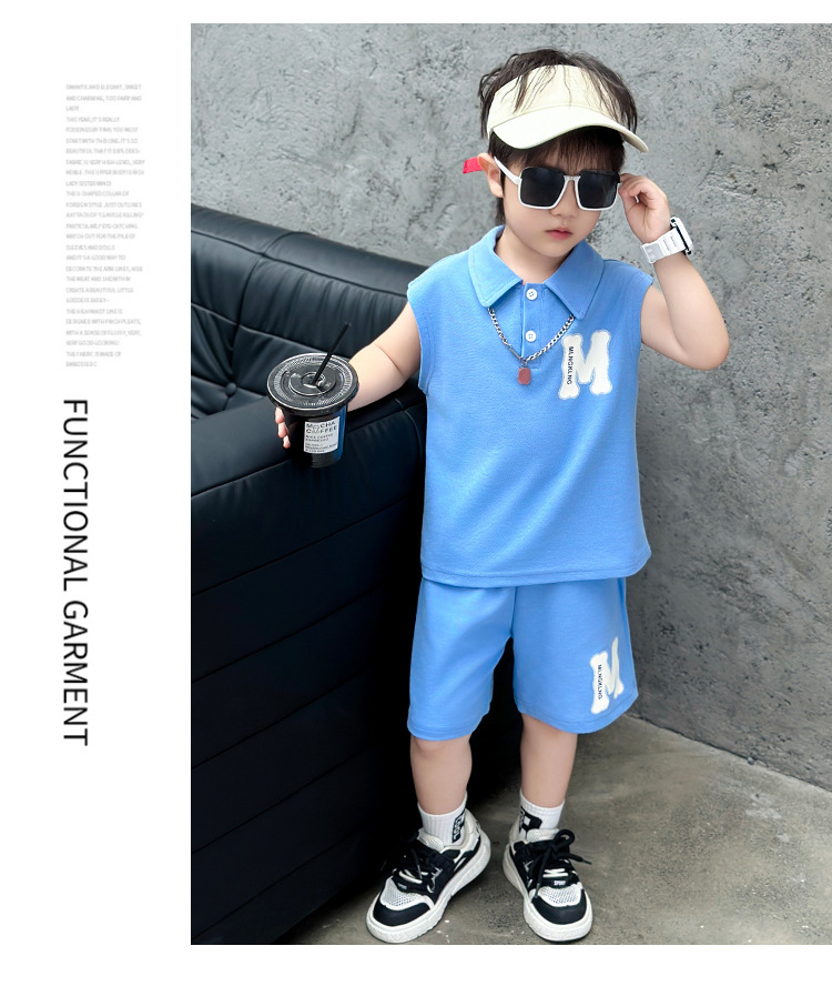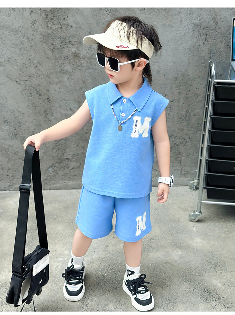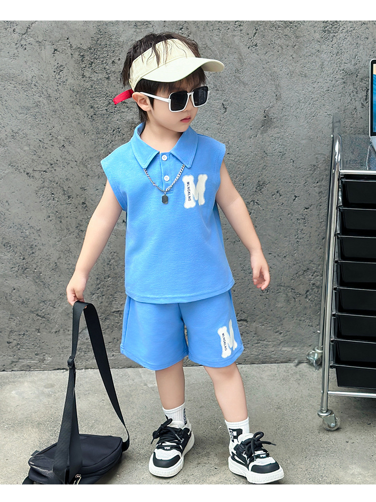 남학생 옷깃 민소매 조끼 세트 2024 년 여름 새 어린이 잘 생긴 캐주얼 투피스 아기 옷 트렌디스토어 가기