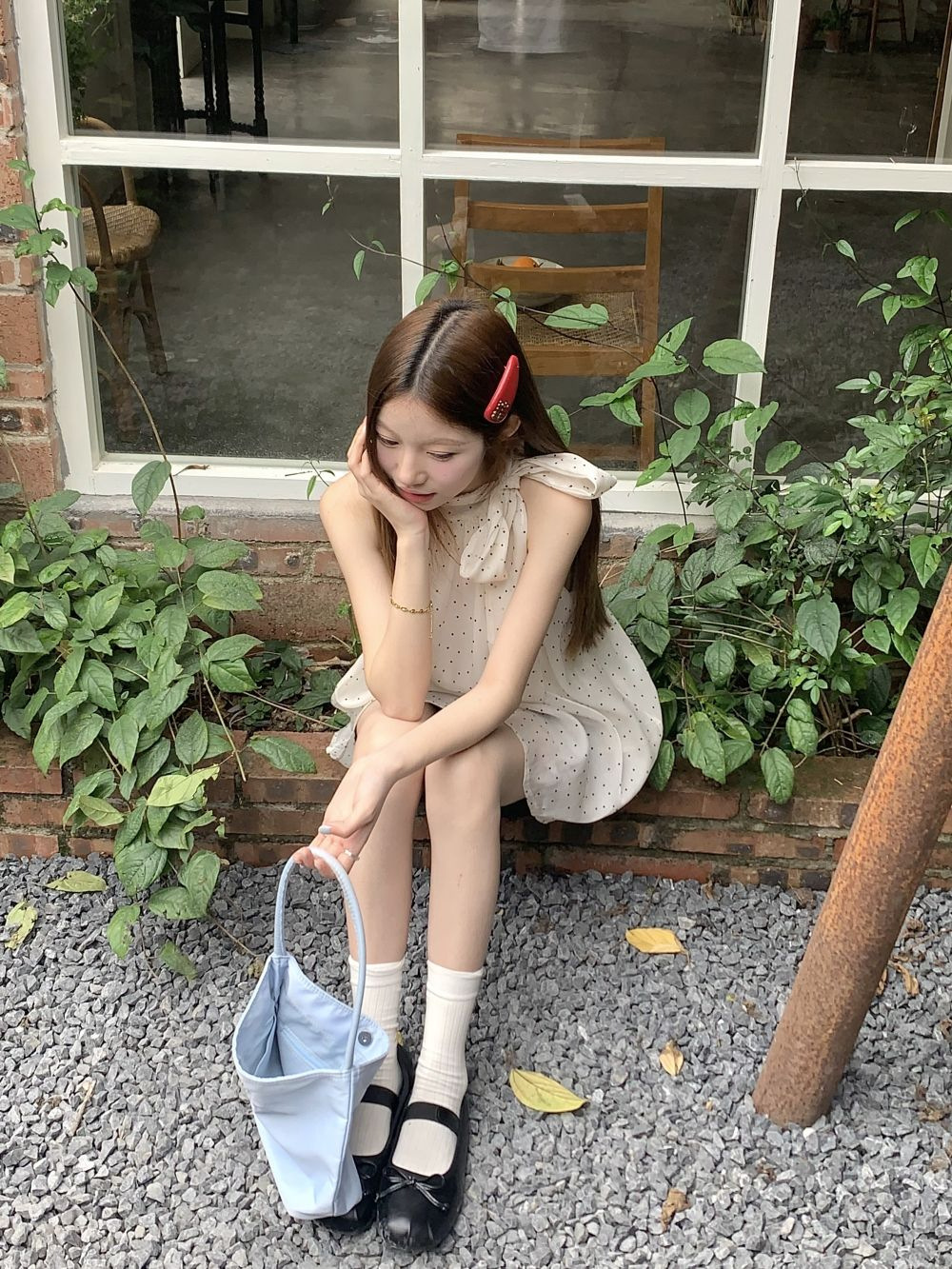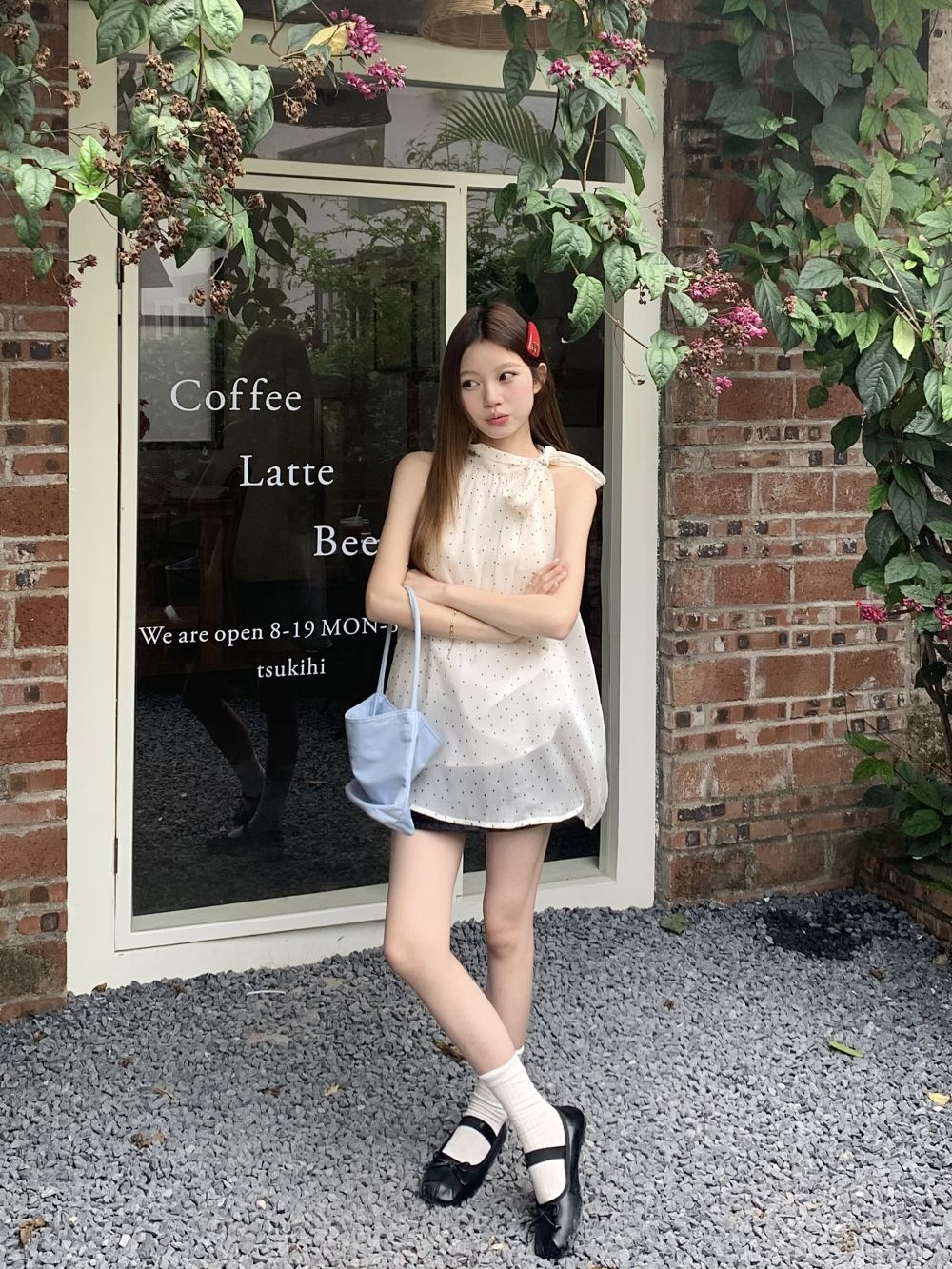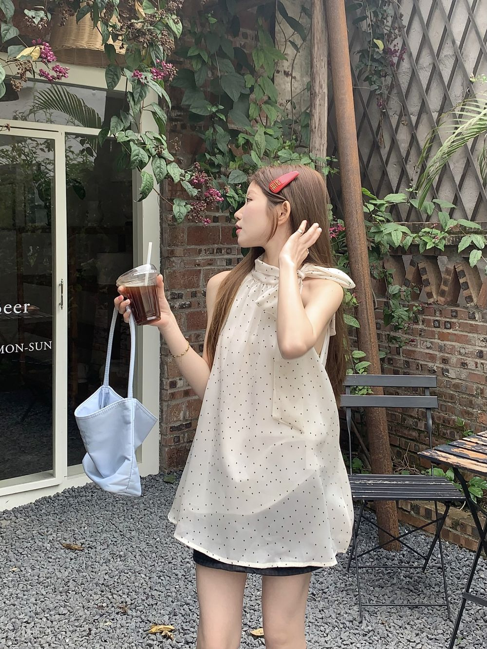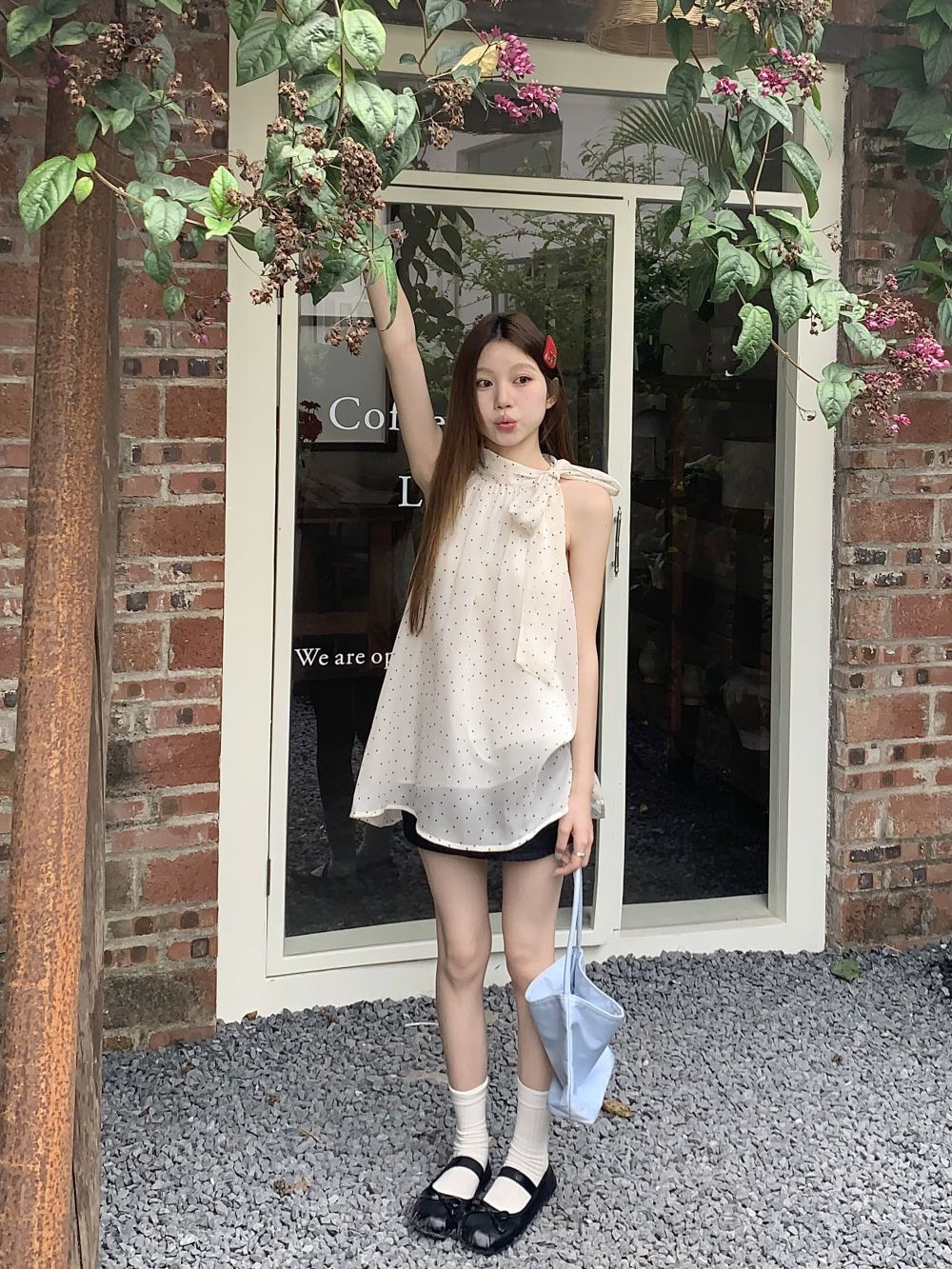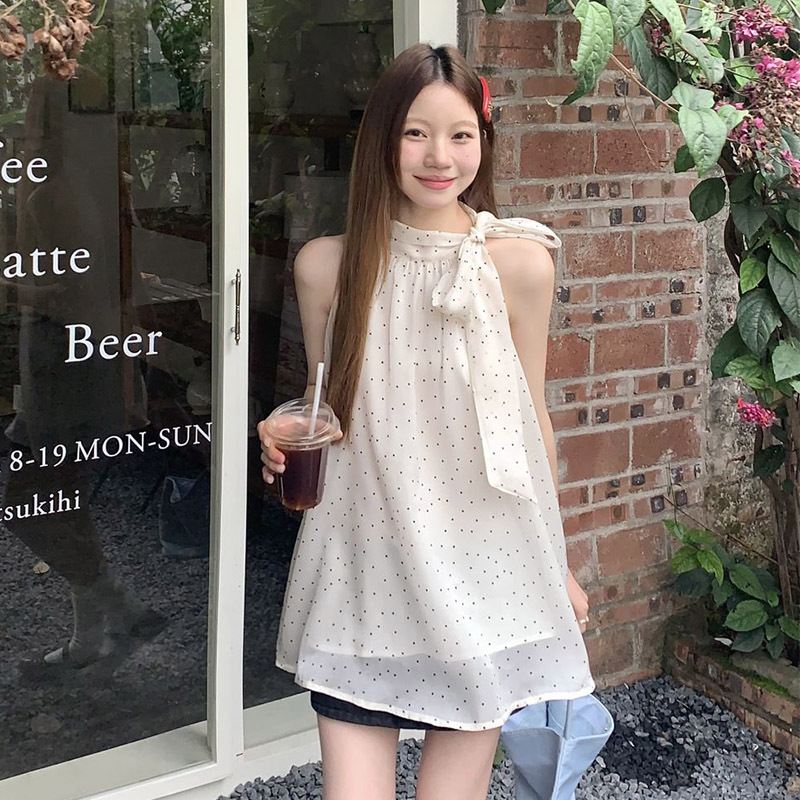 새로운 스타일의 쉬폰 물방울 무늬 홀터넥 민소매 탑 여성 여름 달콤하고 루즈한 패션 오프숄더 탑스토어 가기