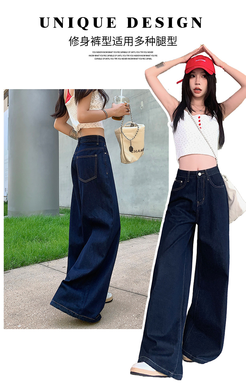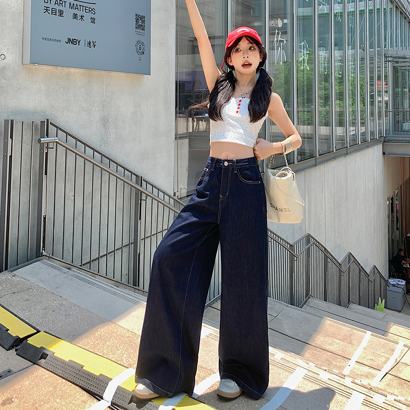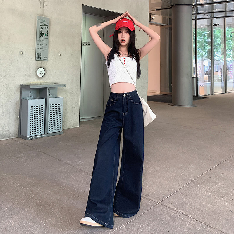 【今茵】미국식 진한 파란색 와이드 레그 데님 팬츠 여성용 루즈핏 슬리밍 레이지 스타일 다용도 활용 가능한 드레이프 바지 인스타 스타일