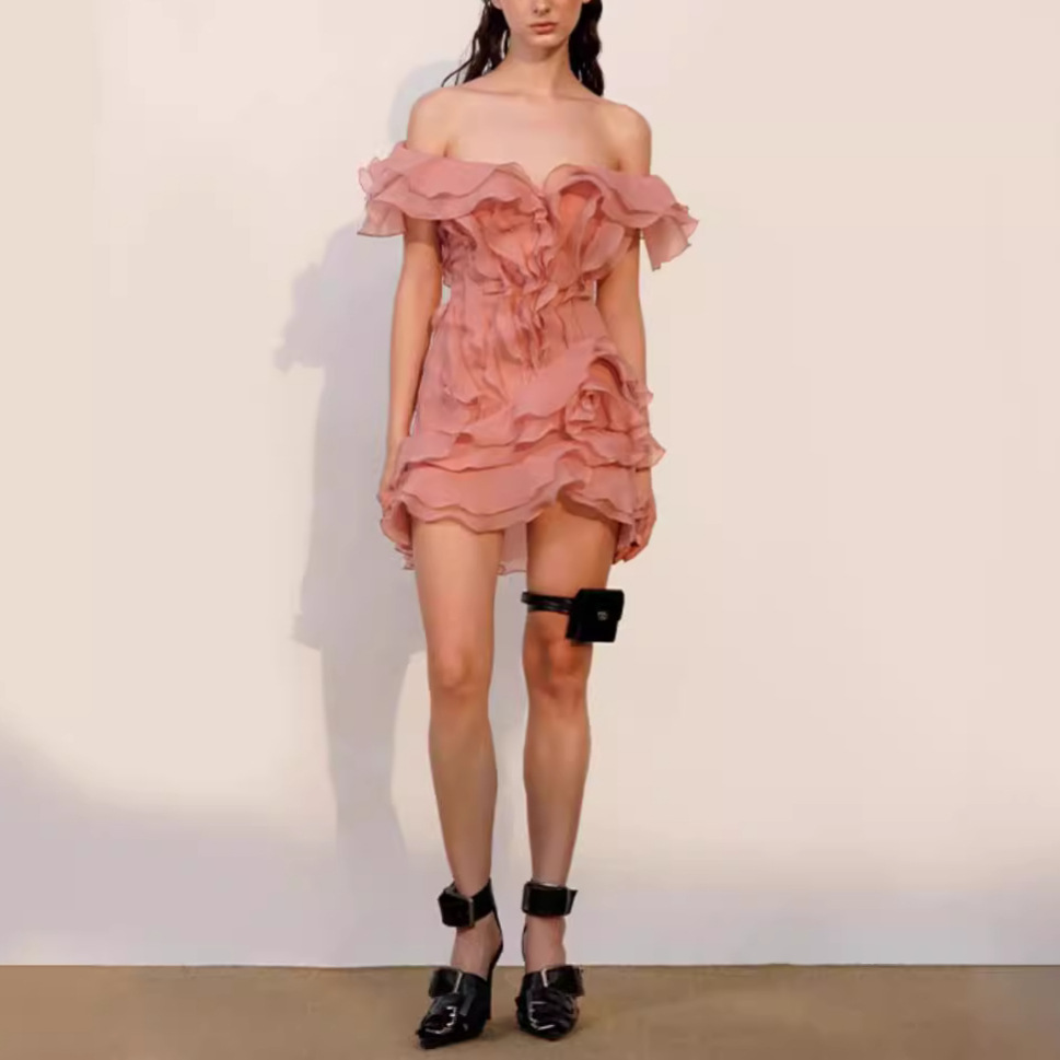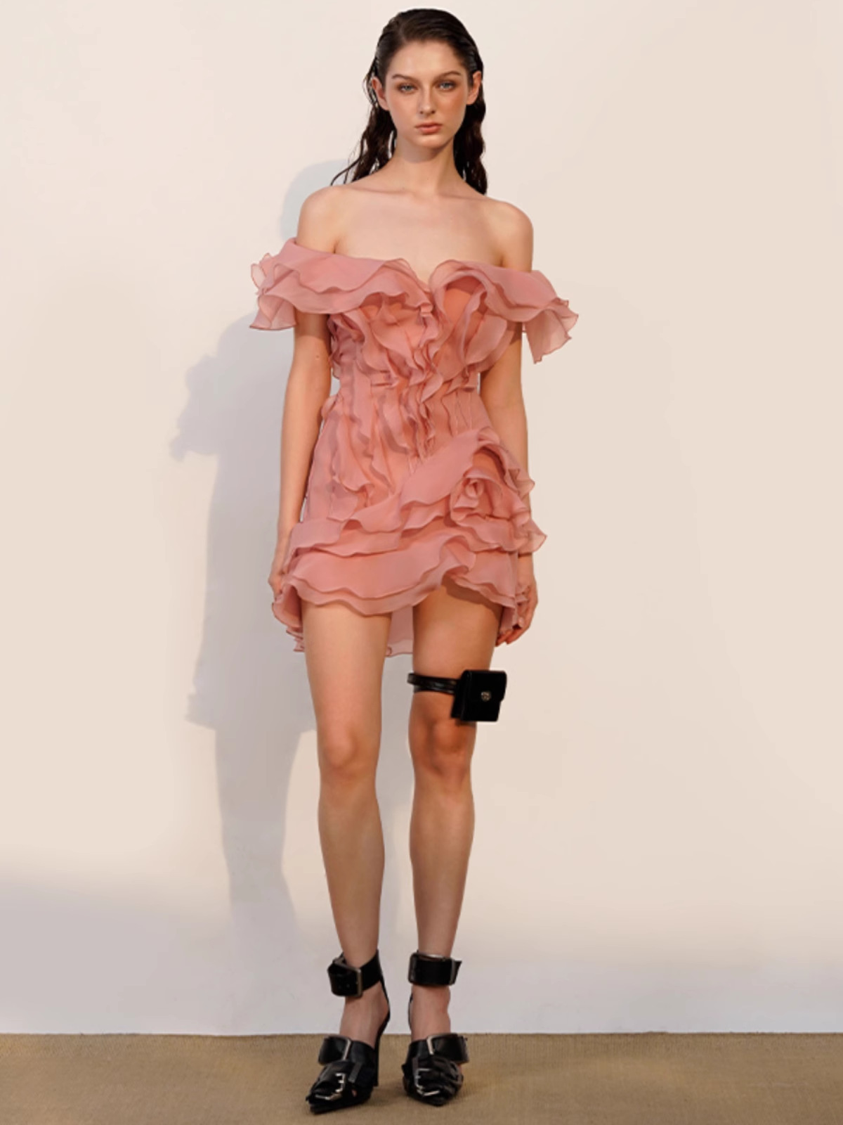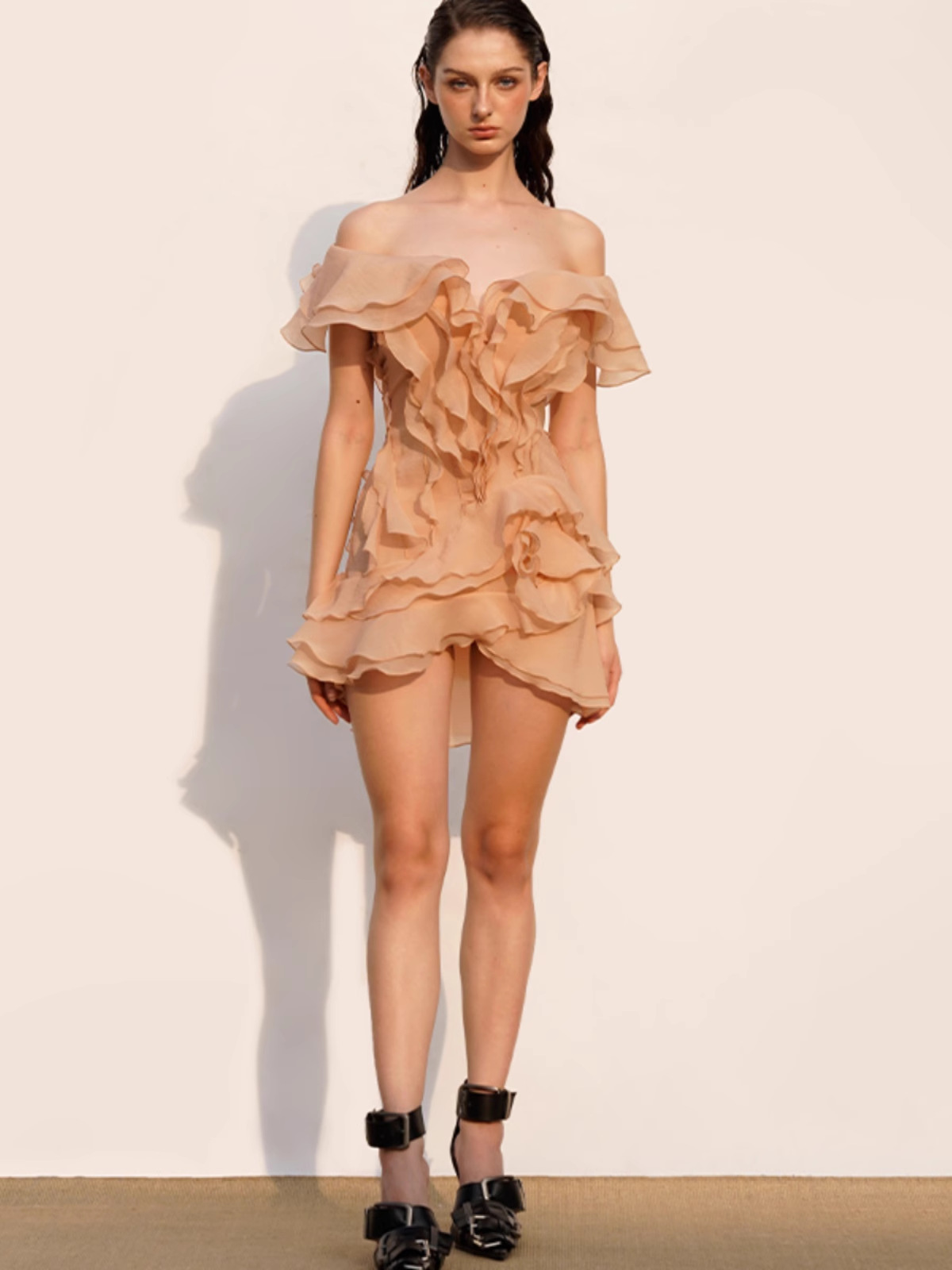 베트남 니치 러플 V 넥 플라워 숄더 오픈 숄더 투웨어 반팔 원피스 슬림 핏 슬리밍