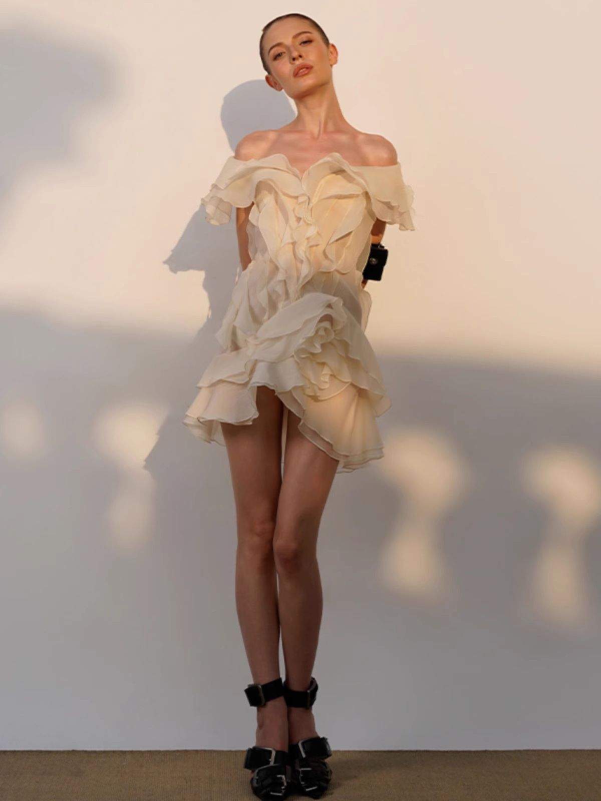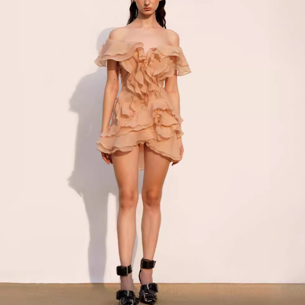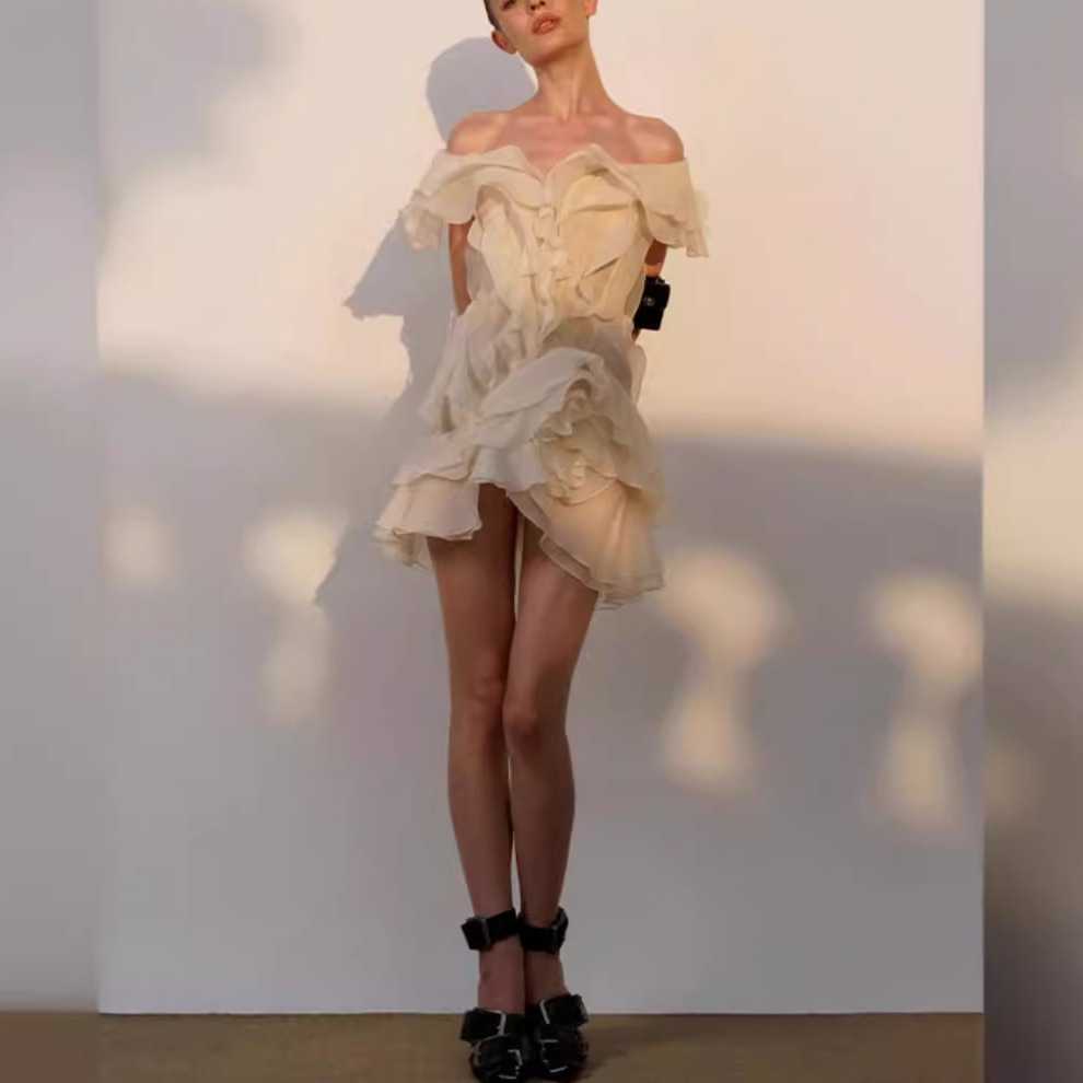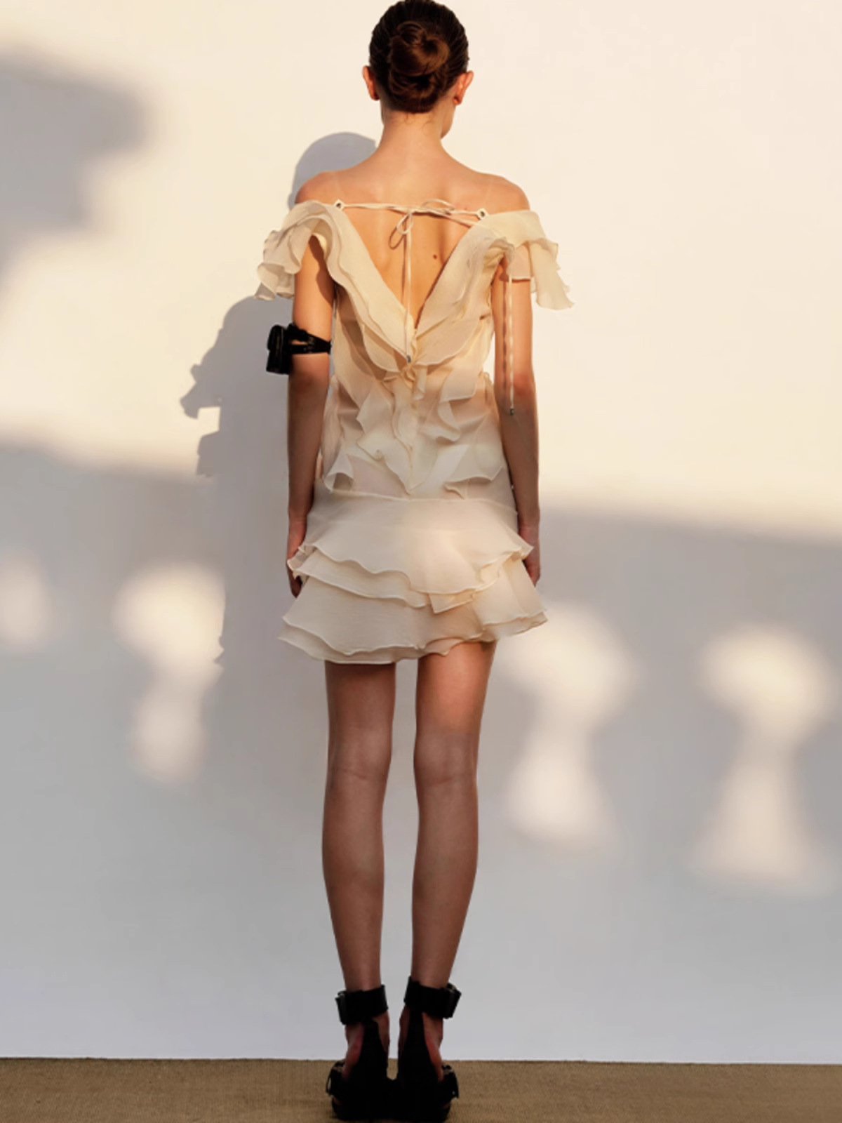 베트남 니치 러플 V 넥 플라워 숄더 오픈 숄더 투웨어 반팔 원피스 슬림 핏 슬리밍