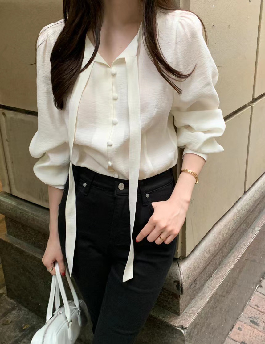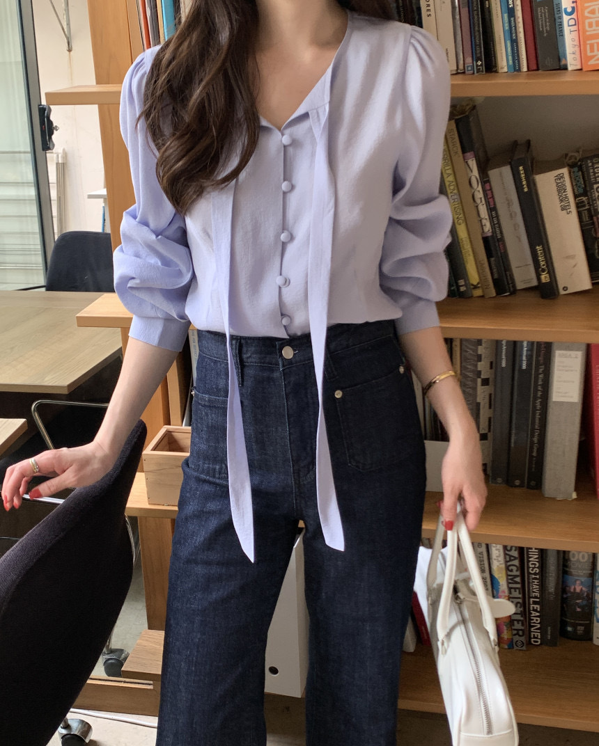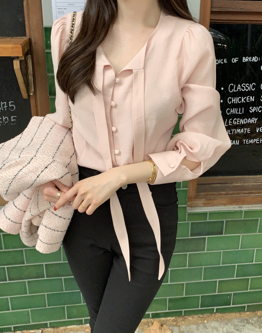 한국 봄 새로운 프랑스 V 넥 스트랩 긴 소매 셔츠