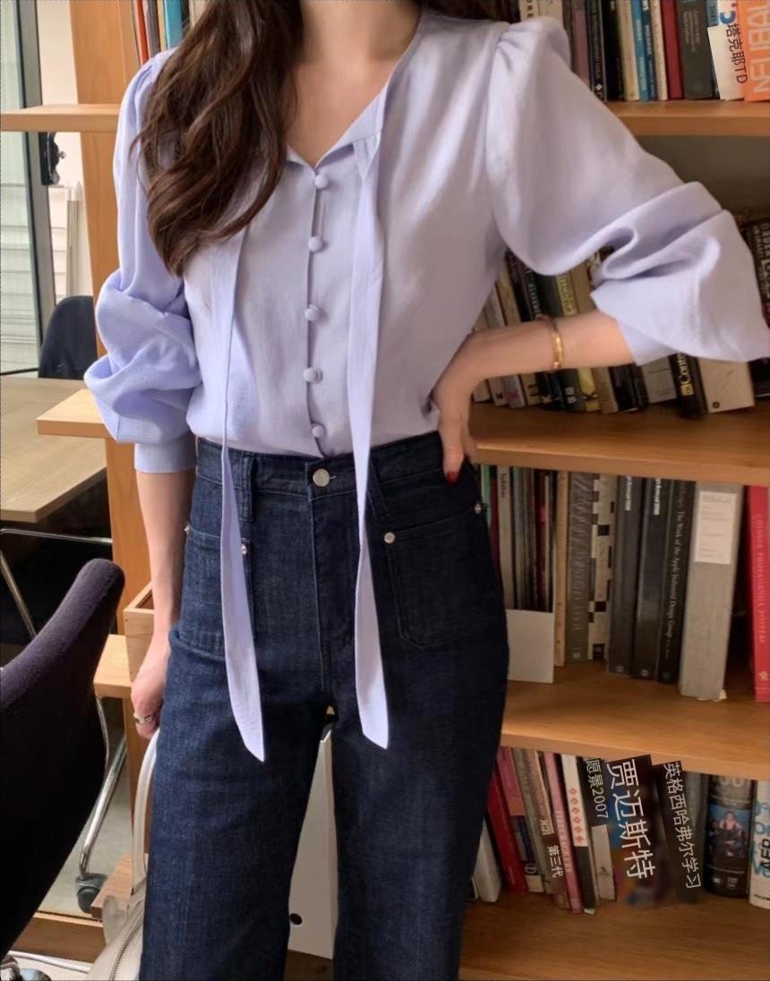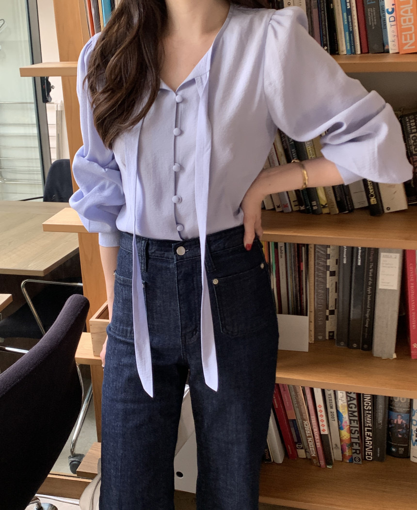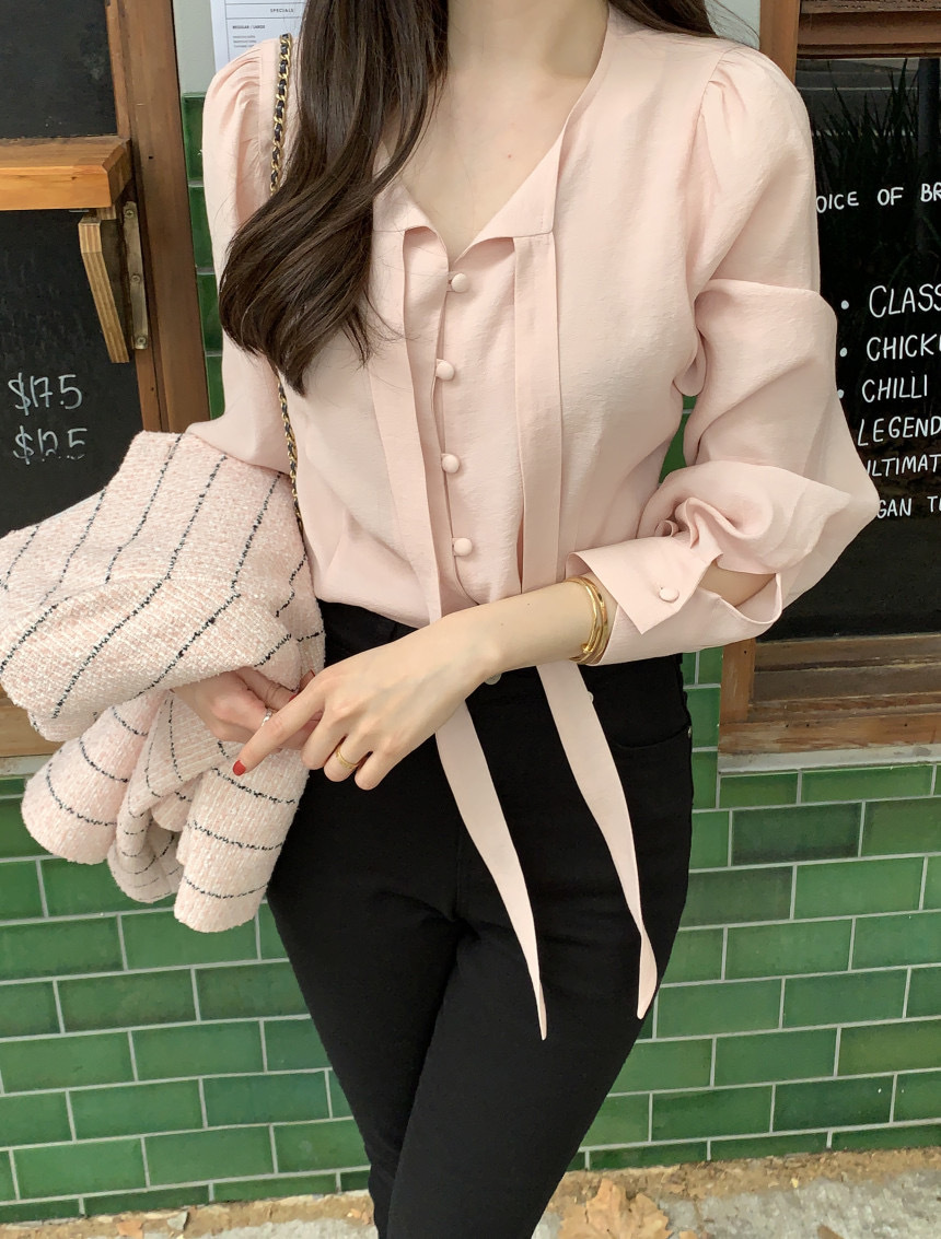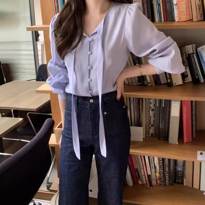 한국 봄 새로운 프랑스 V 넥 스트랩 긴 소매 셔츠스토어 가기