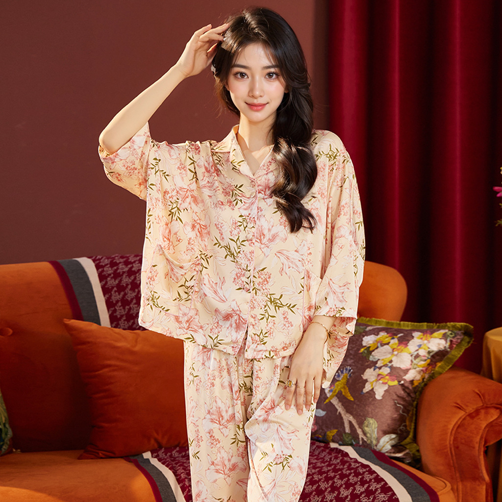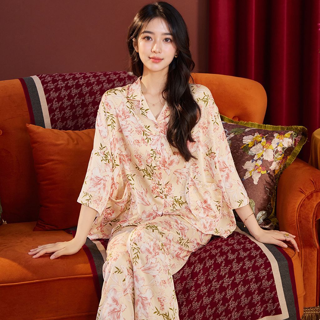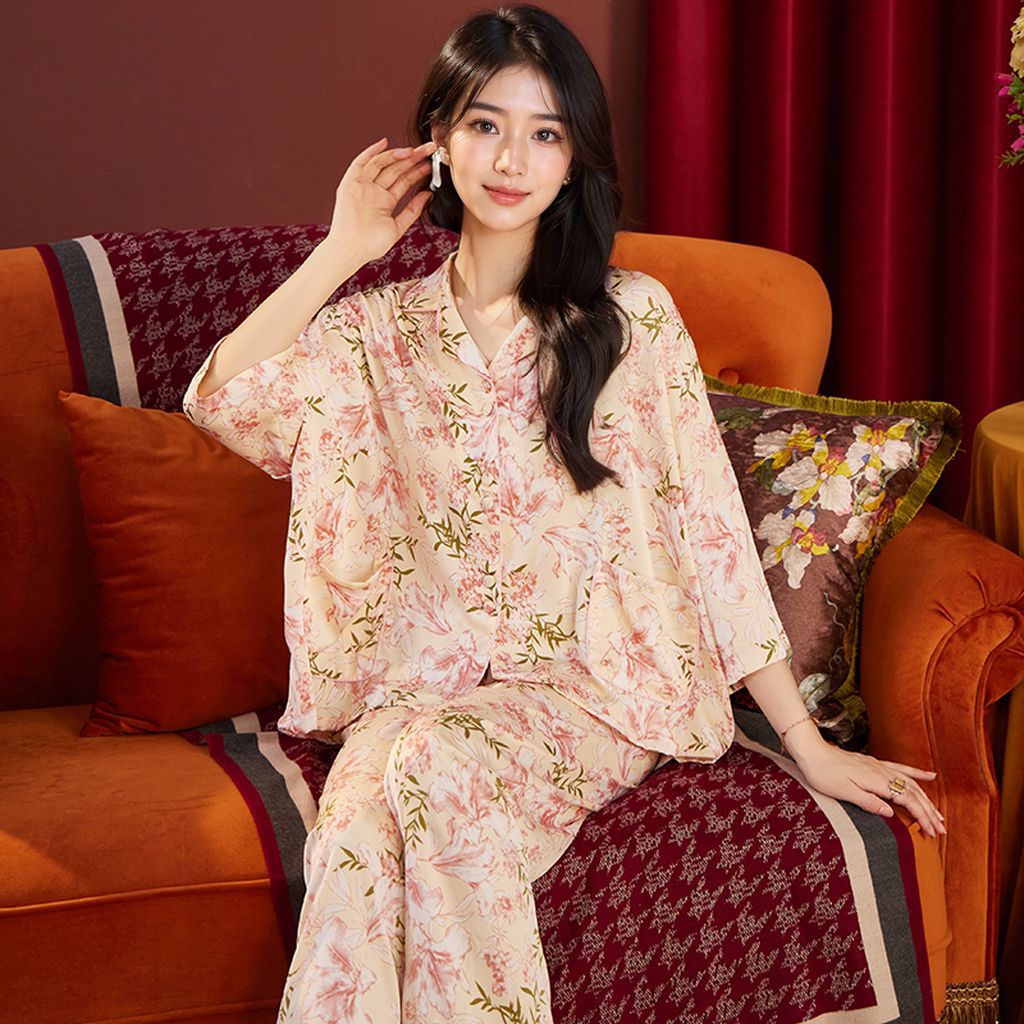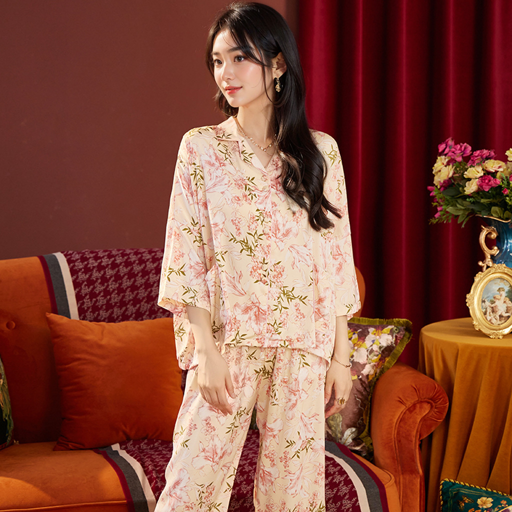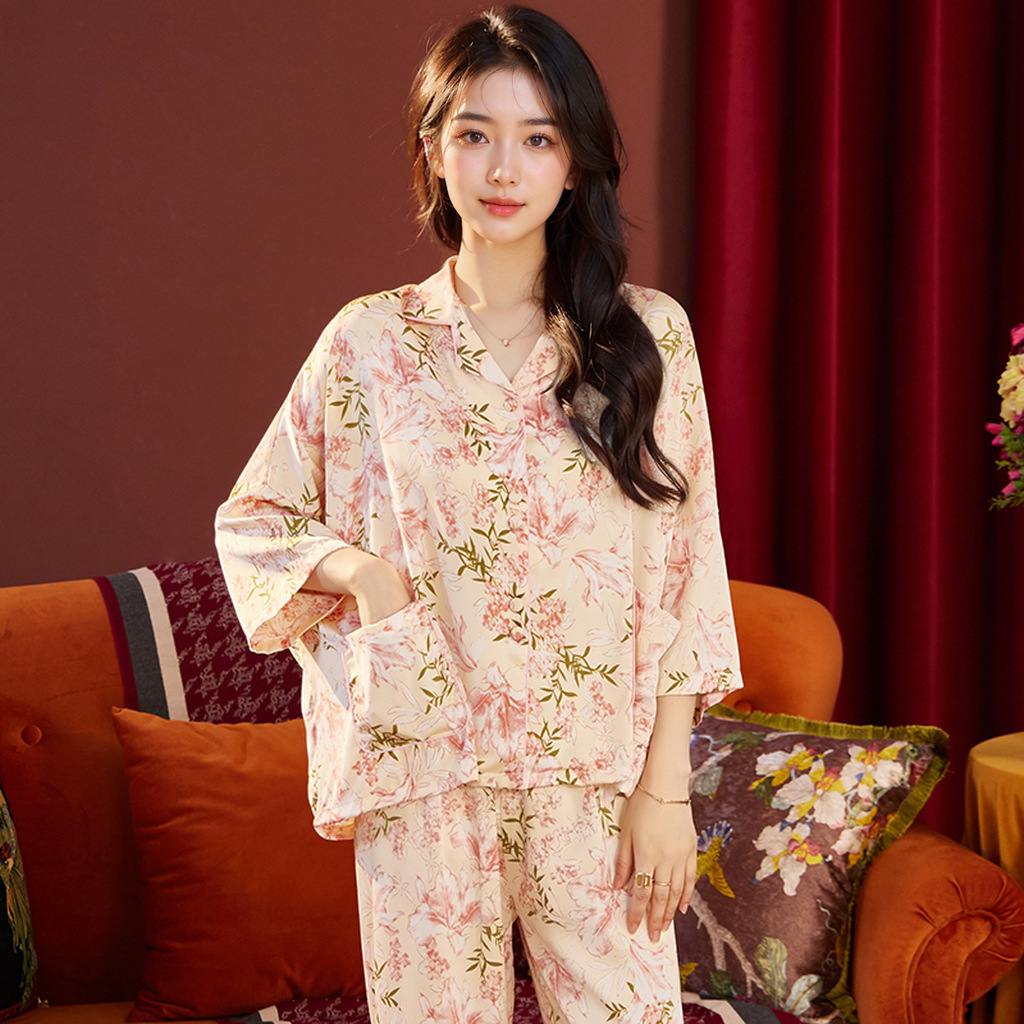 새로운 봄 여름 수선화 핑크 프린트 얇은 아이스 실크 루즈핏 여성용 잠옷 7부 소매 세트 통기성 좋은 홈웨어스토어 가기