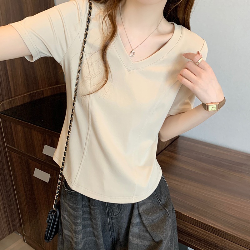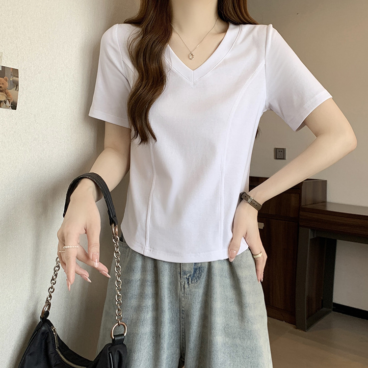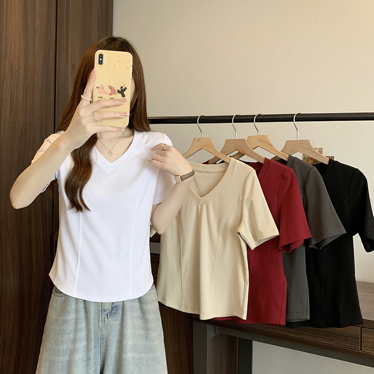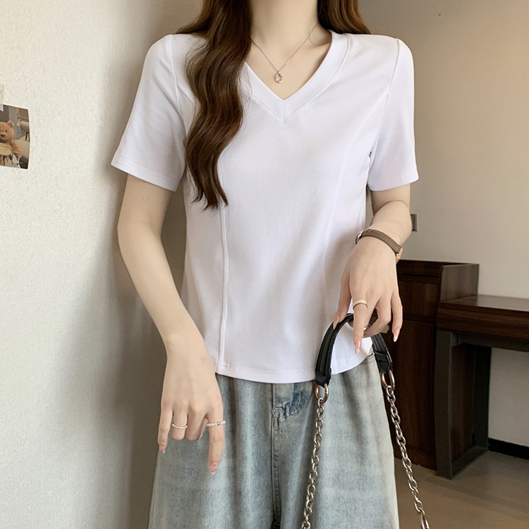2026 여름 기본 스타일 슬리밍 솔리드 컬러 슬림핏 피쉬본 V넥 어깨라인 불규칙 반팔 티셔츠 여성 신상 상의스토어 가기